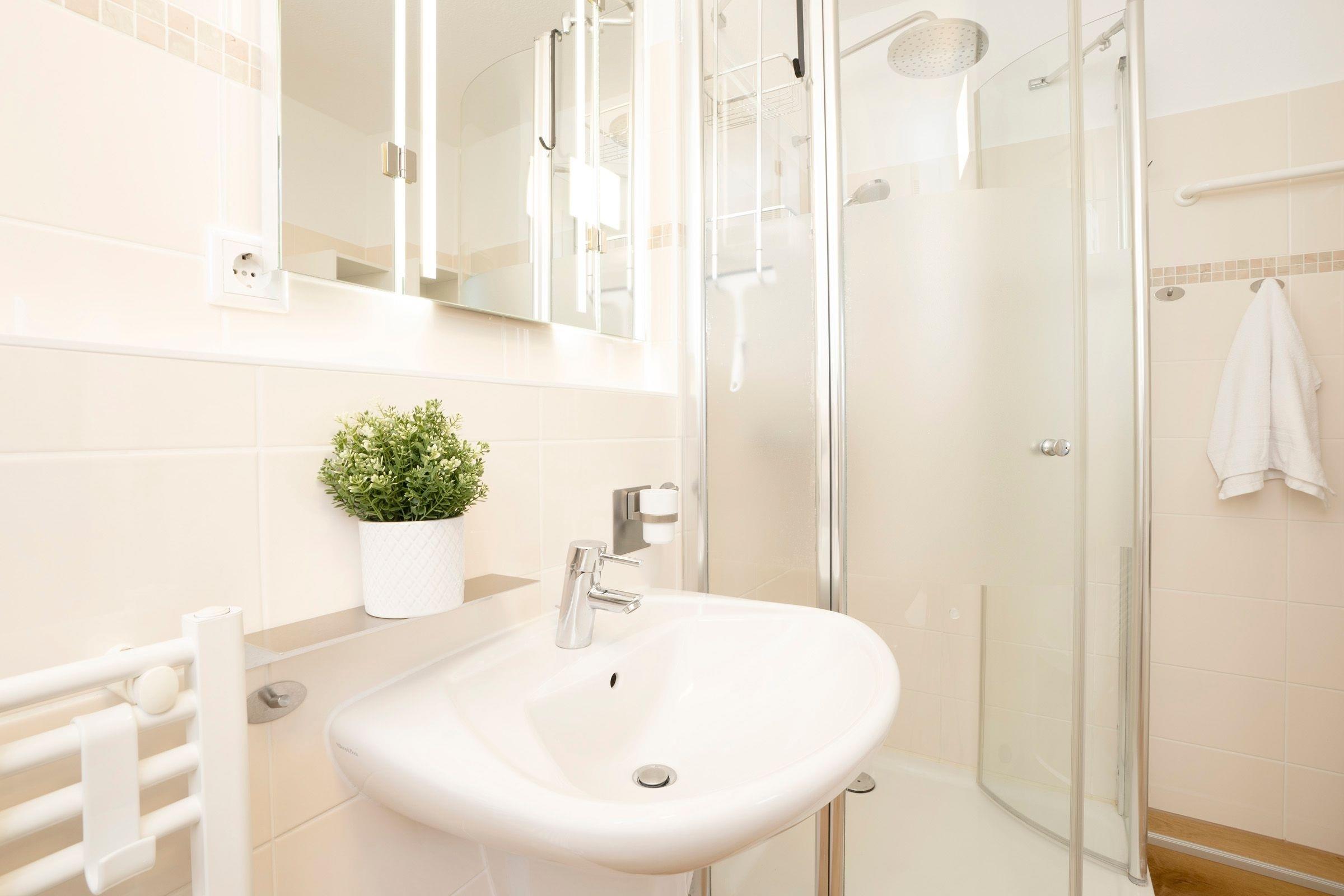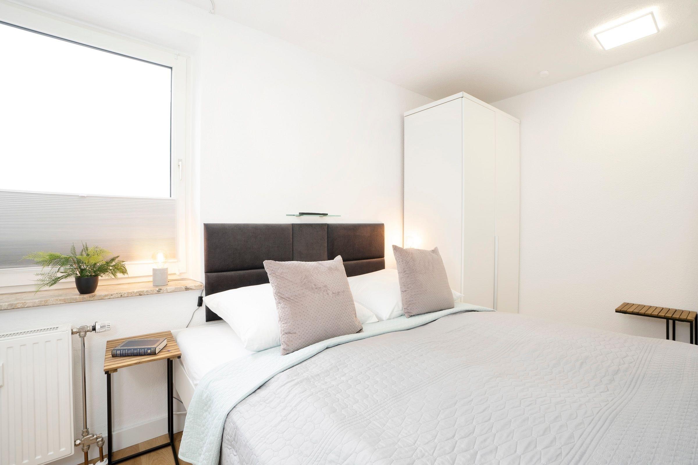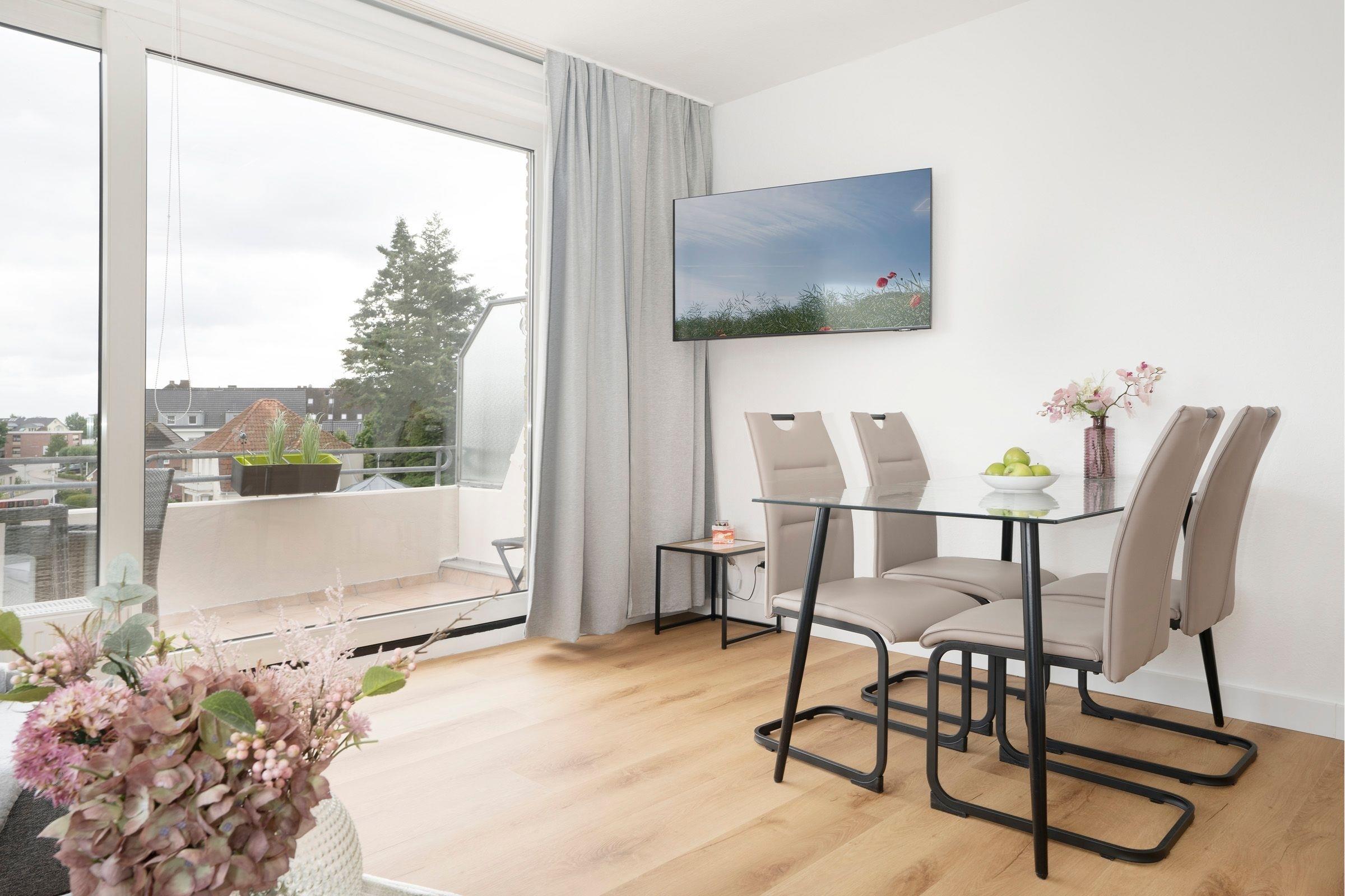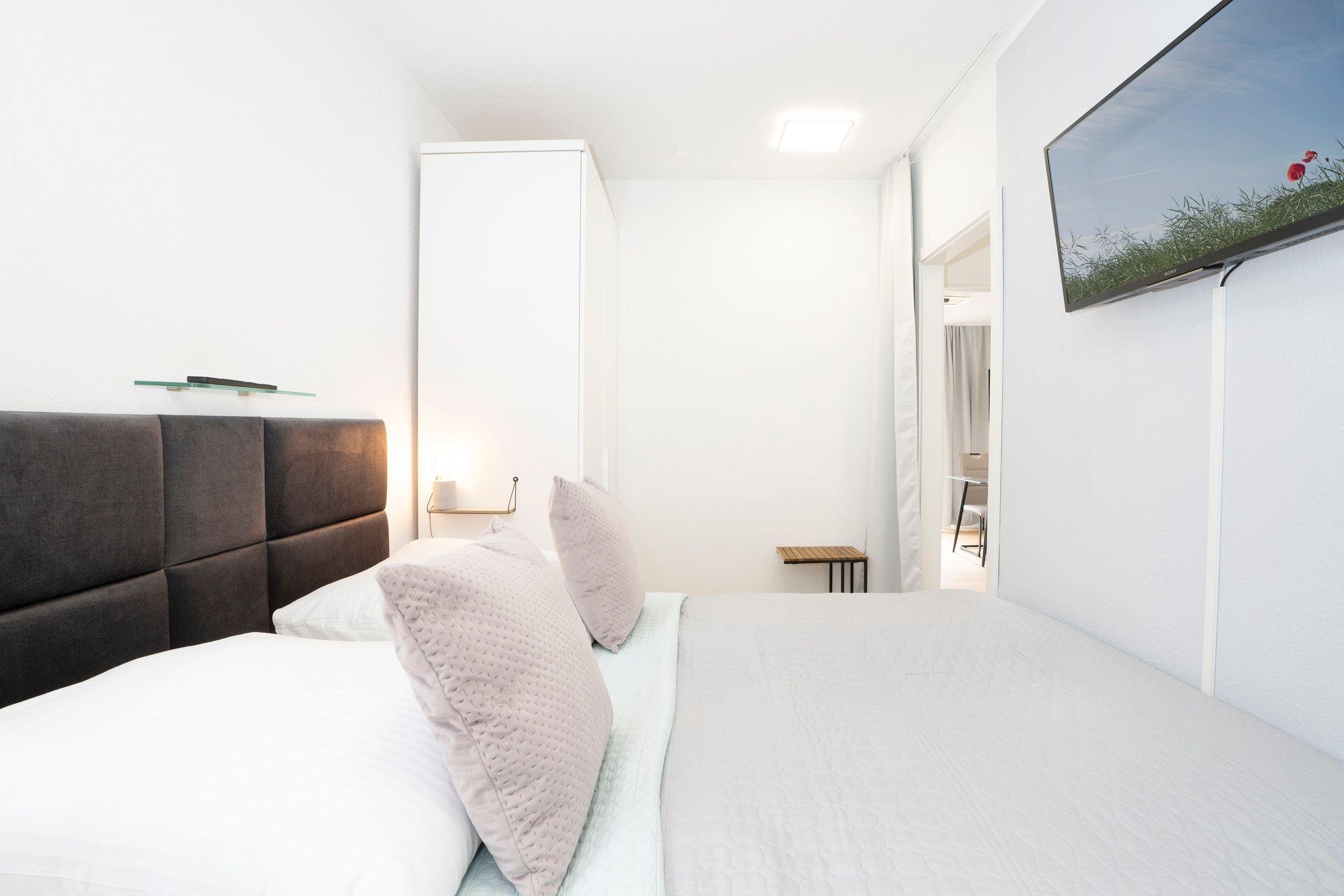 Diese Ferienwohnung wurde frisch renoviert und begrüßt seine Gäste mit klaren Linien und hellen Farben. Dank des offenen Raumkonzeptes ist die Familie beim Kochen, Essen, Spielen oder Fernsehen zusammen und kann sich austauschen. Das moderne Sofa verfügt zusätzlich über eine praktische Schlaffunktion (140x200 cm) und bietet somit Platz für zwei kleine Urlaubsgäste. Abends sitzt es sich gemütlich auf dem Balkon - bei einem Glas Wein und den Lichtern der Stadt können Sie hier den Tag ausklingen lassen. Ans Wohnzimmer angrenzend befindet sich das Schlafzimmer mit gemütlichem Doppelbett (2 x 90x200 cm), eigenem TV-Gerät und großem Kleiderschrank, in dem mühelos Koffer und Habseligkeiten untergebracht werden können. Das moderne Duschbad lässt Sie erfrischt in den Tag starten und bietet genügend Stauraum für Ihre Hygieneartikel.
