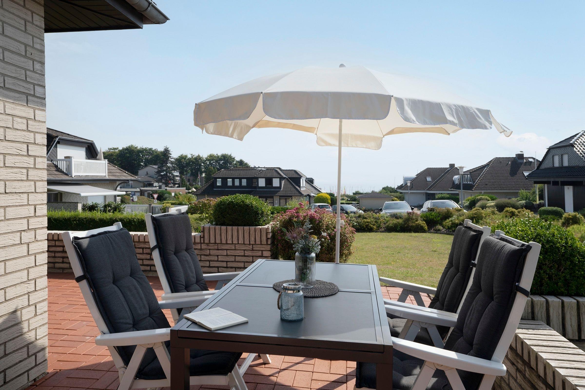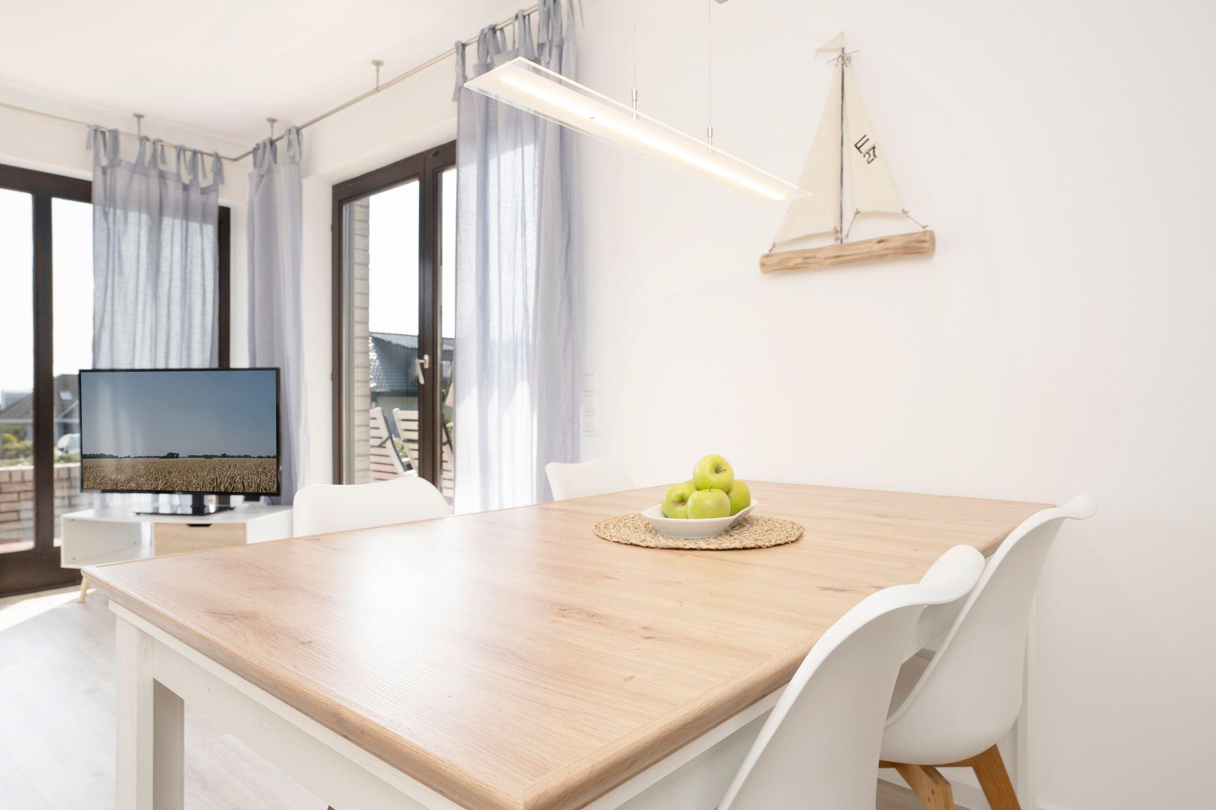 Sie werden durch die hellen großen Fenster im großzügigen Wohn-, Ess- und Kochbereich von der Sonne begrüßt. Die möblierte Terrasse mit Süd-Ost Ausrichtung punktet mit Blick zur Ostsee. Hier können Sie es sich windgeschützt im Strandkorb gemütlich machen und die Sonne genießen. Kleine Feriengäste werden sich besonders über den Garten zum Toben freuen. Im Obergeschoss befindet sich ein Schlafzimmer mit großem Doppelbett (180x200cm), Kleiderschrank und TV. Ein 2. Schlafzimmer bietet mit 2 Einzelbetten (je 90x200cm), Kleiderschrank und TV ebenfalls Platz für 2 Personen. Ein helles Duschbad und ein zusätzliches Gäste-WC runden die Ausstattung dieser Ferienimmobilie ab.