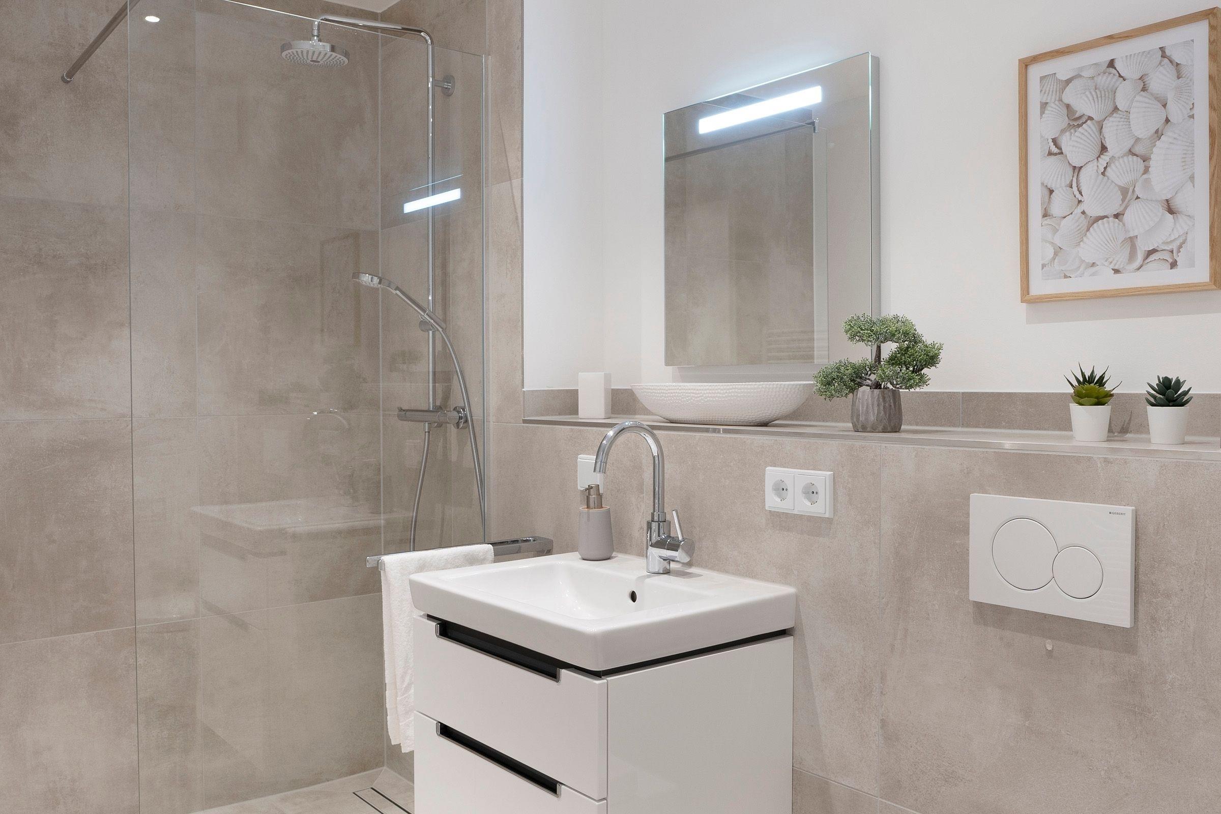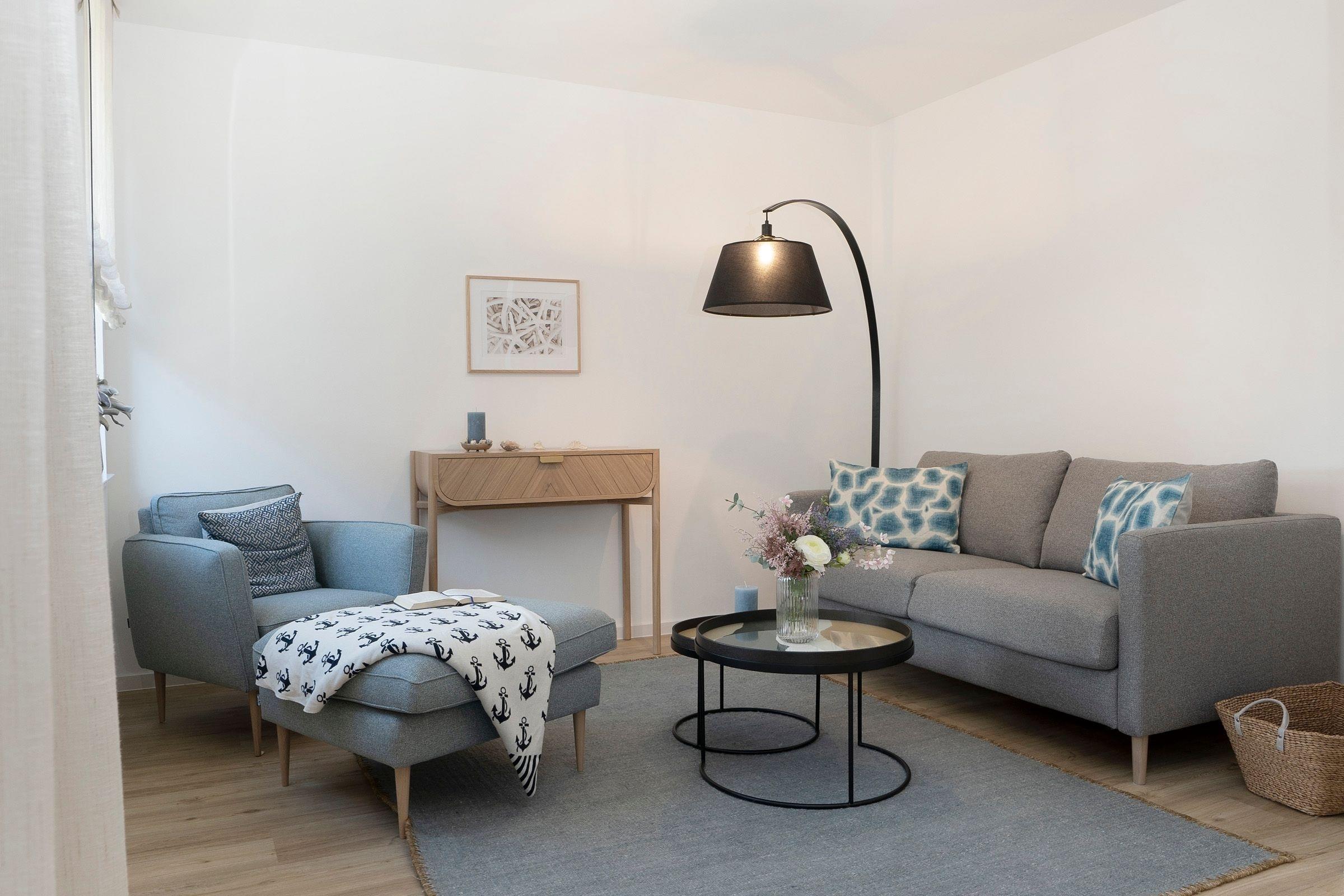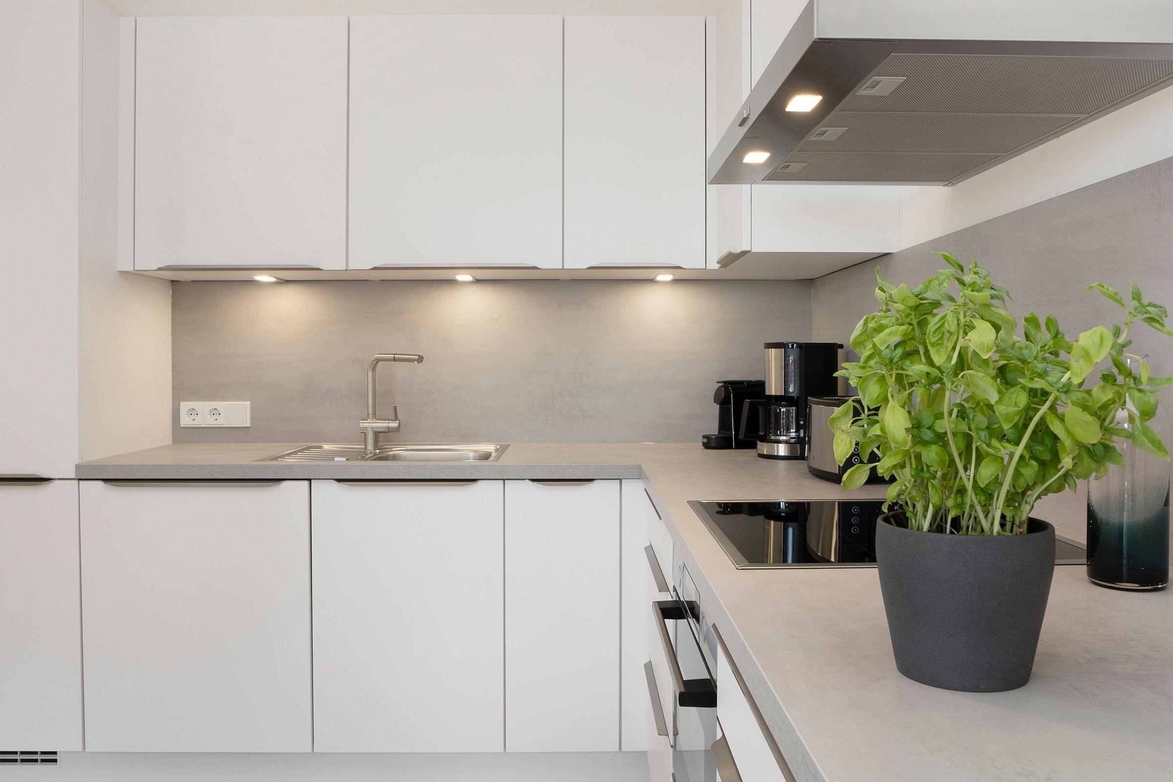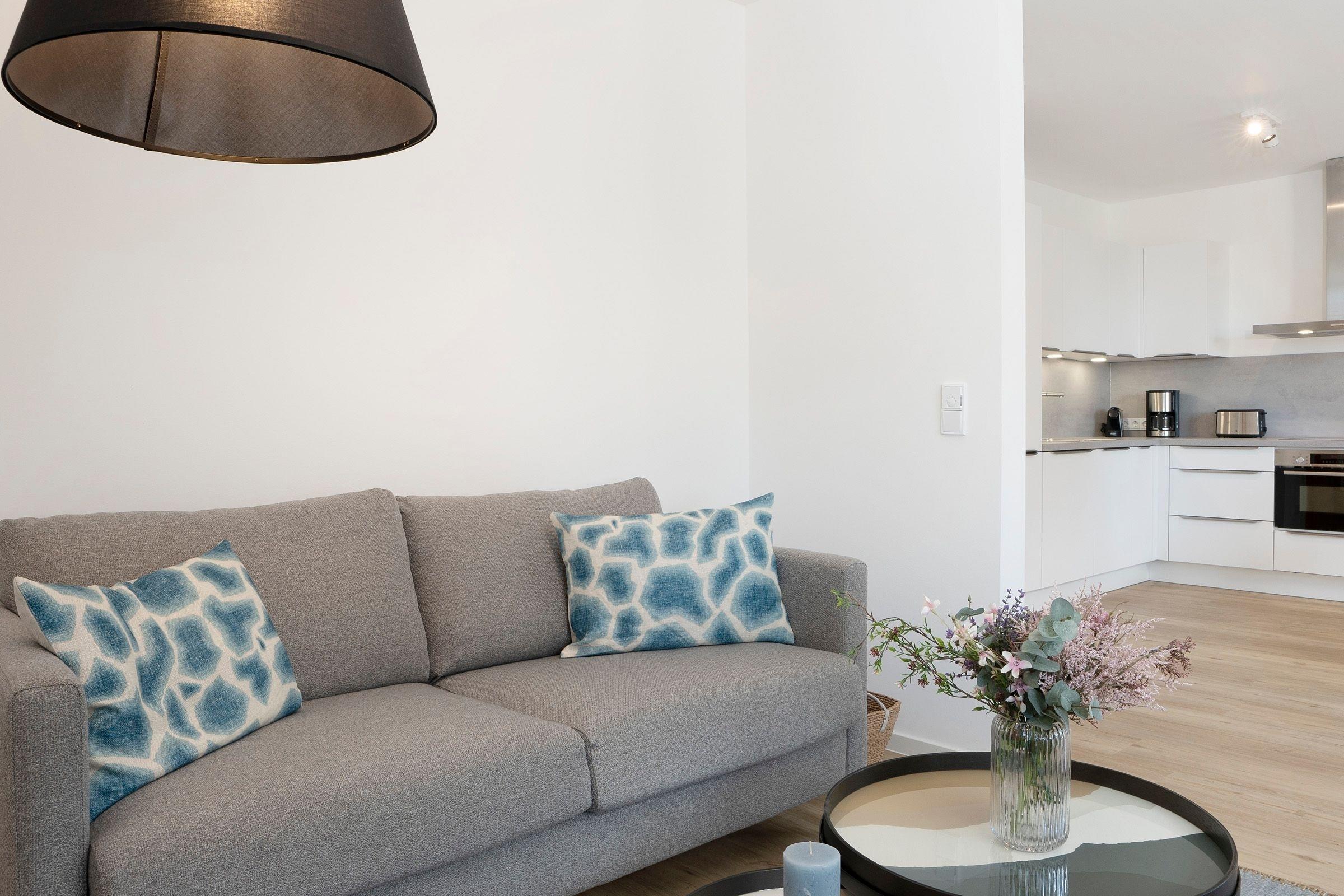 Das separate Schlafzimmer ist mit einem gemütlichen Boxspring-Doppelbett (180x200 cm) sowie einem Kleiderschrank ausgestattet. Das moderne Badezimmer erwartet Sie mit einer bodengleichen Dusche, Föhn sowie einem beheizbaren Handtuchhalter. Für Unterhaltung sorgen die Smart-TVs in Wohn- und Schlafzimmer, ein Bluetooth-Radio sowie der vorhandene WLAN-Anschluss. Eine Fußbodenheizung sorgt auch in der kalten Jahreszeit für angenehme Temperaturen. Die gesamte Wohnung lässt sich durch elektrische Außenjalousien angenehm abdunkeln.