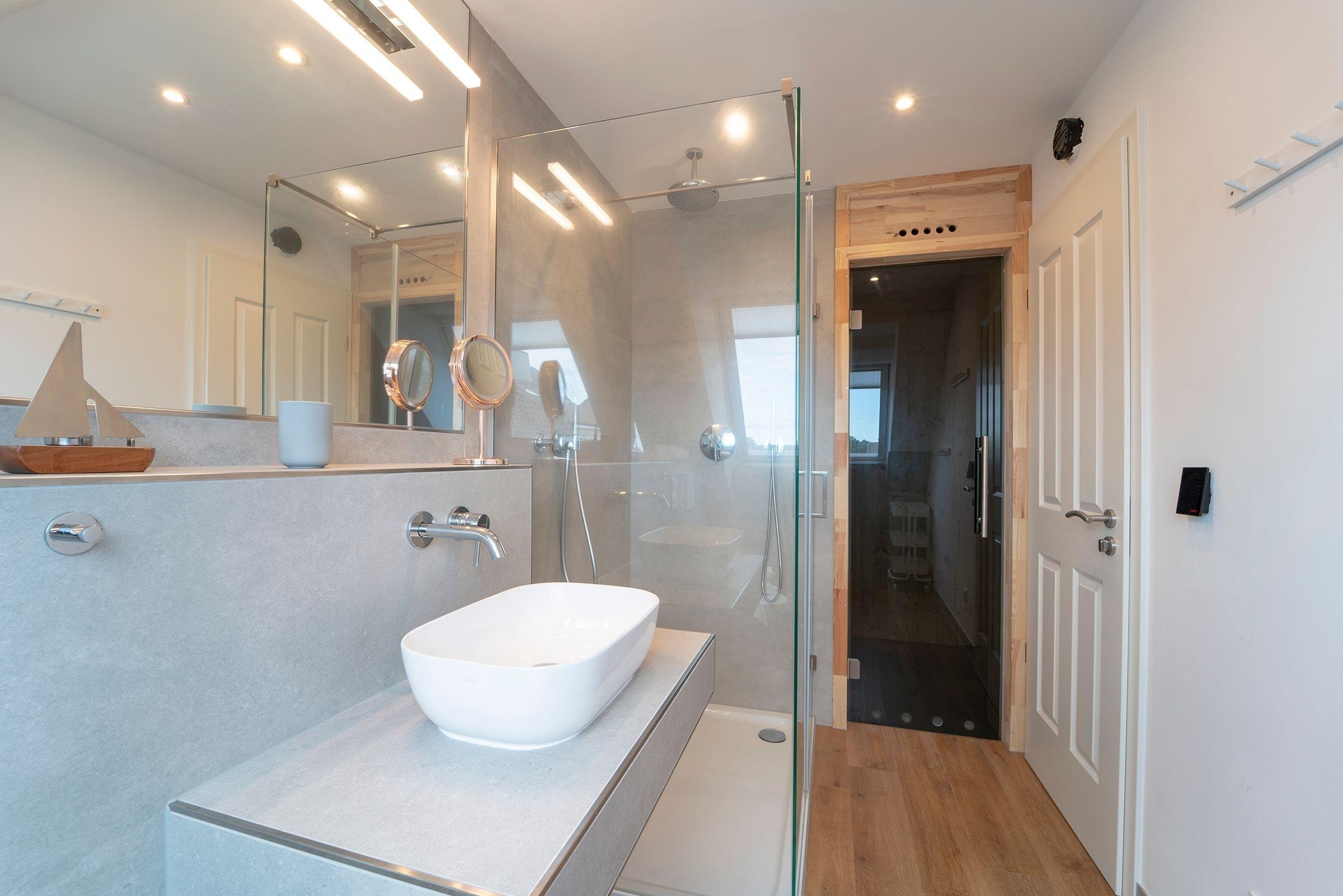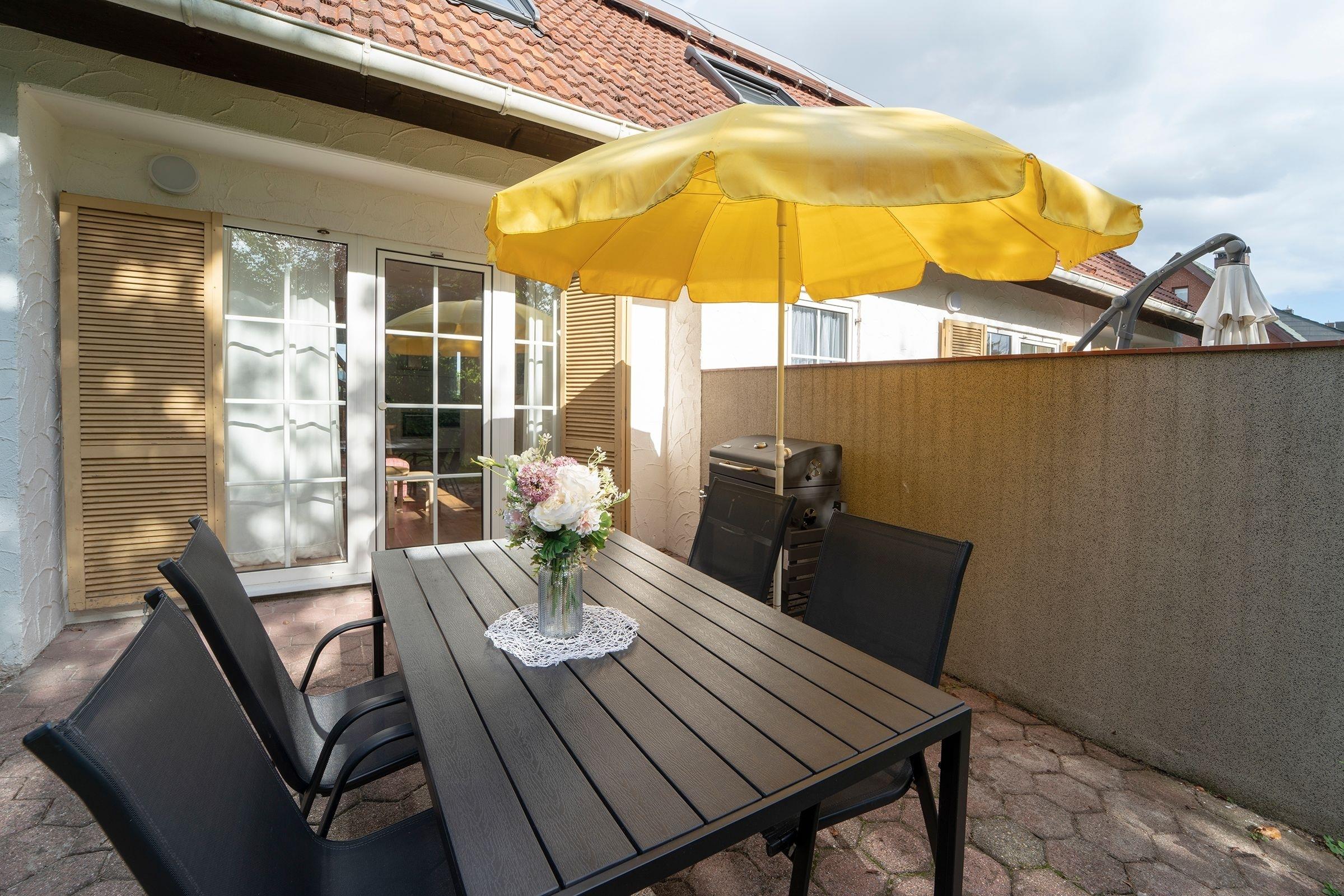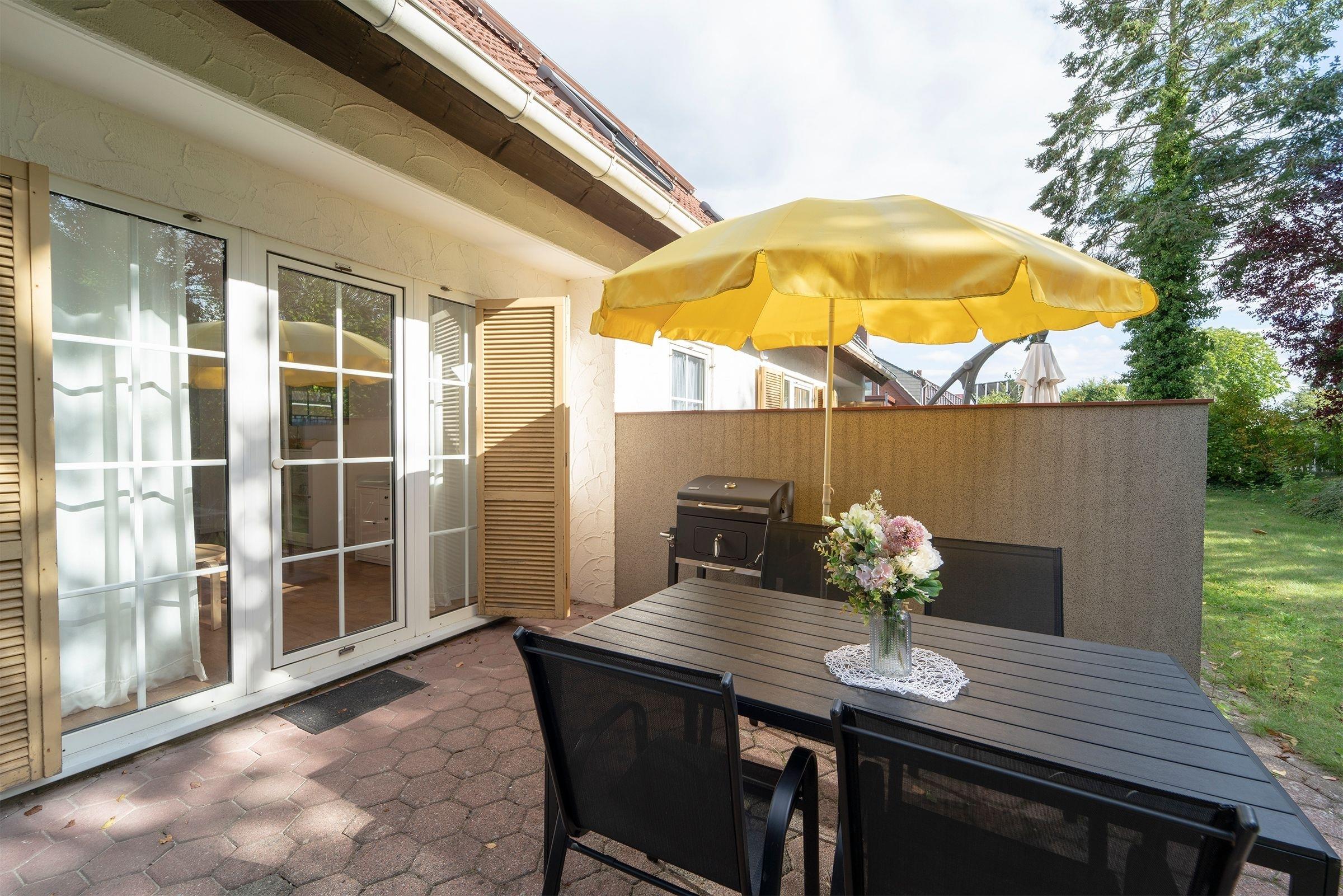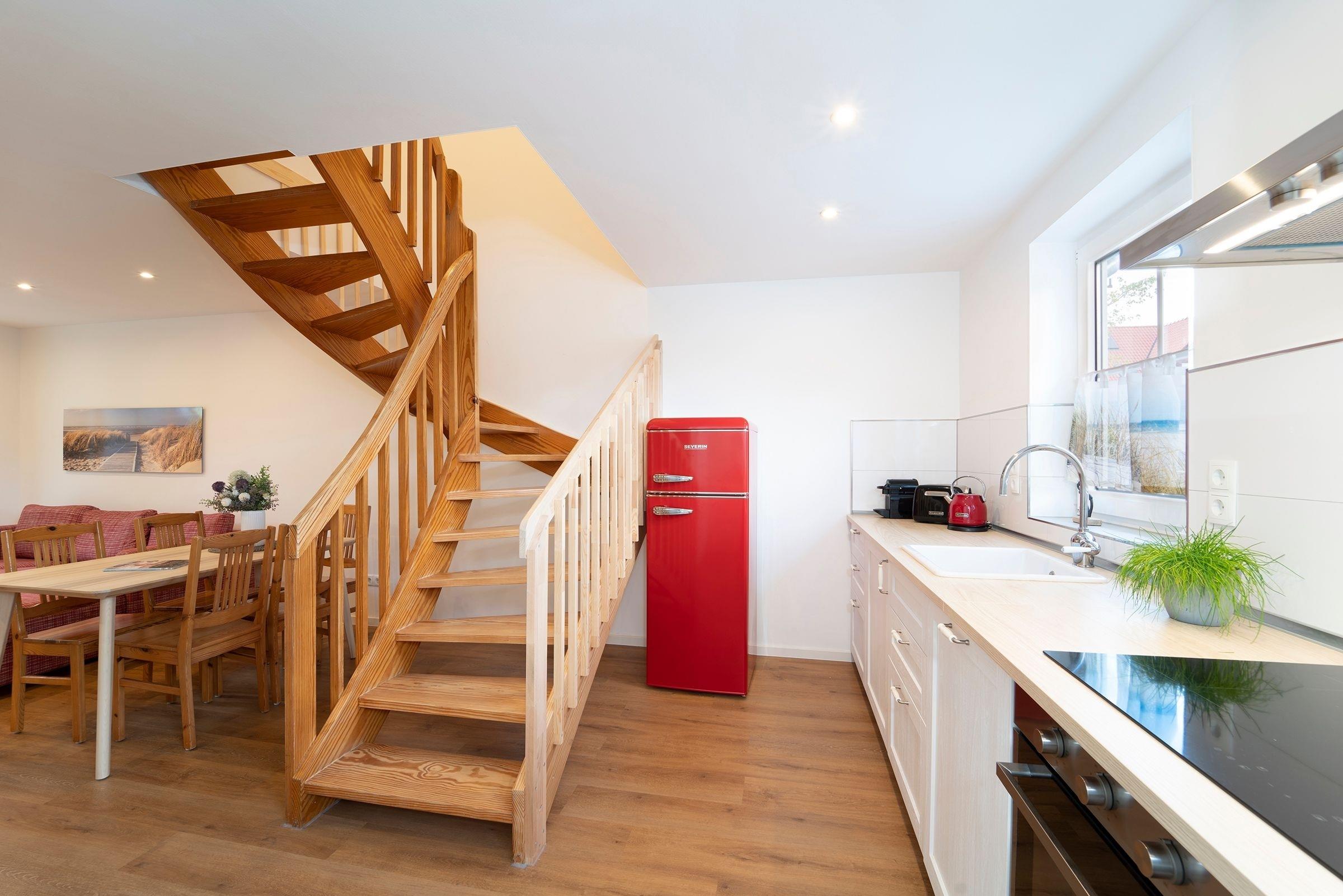 Der Wohn-/Essbereich mit offener Küche gestaltet sich besonders freundlich und bietet genügend Möglichkeiten, um gemeinsam erholsame Urlaubstage zu verbringen. Die Küchenzeile ist zum Wohnbereich hin offen und besitzt alle Ausstattungsmerkmale, um ein leckeres Urlaubsfrühstück oder ein gemütliches Dinner zuzubereiten. Ein Highlight dieser Ferienwohnung ist die Terrasse mit Gartenmöbeln, auf der Sie nach einem langen Urlaubstag entspannen können. Das angrenzende Gartenstück wird gemeinschaftlich von allen Bewohnern der Anlage genutzt. Drei Schlafzimmer und zwei moderne Bäder befinden sich in der 1. Etage. Zwei Schlafzimmer sind jeweils mit einem Doppelbett (2x 90x200 cm) und Kleiderschrank ausgestattet. Das dritte Schlafzimmer verfügt über ein Einzelbett (90x200 cm). Morgens können Sie sich in den modernen und hell gefliesten Duschbädern mit Fußbodenheizung für den Tag bereit machen. Die wohnungseigene Sauna in einem der beiden Duschbäder sorgt für eine rundum gelungene Urlaubszeit.