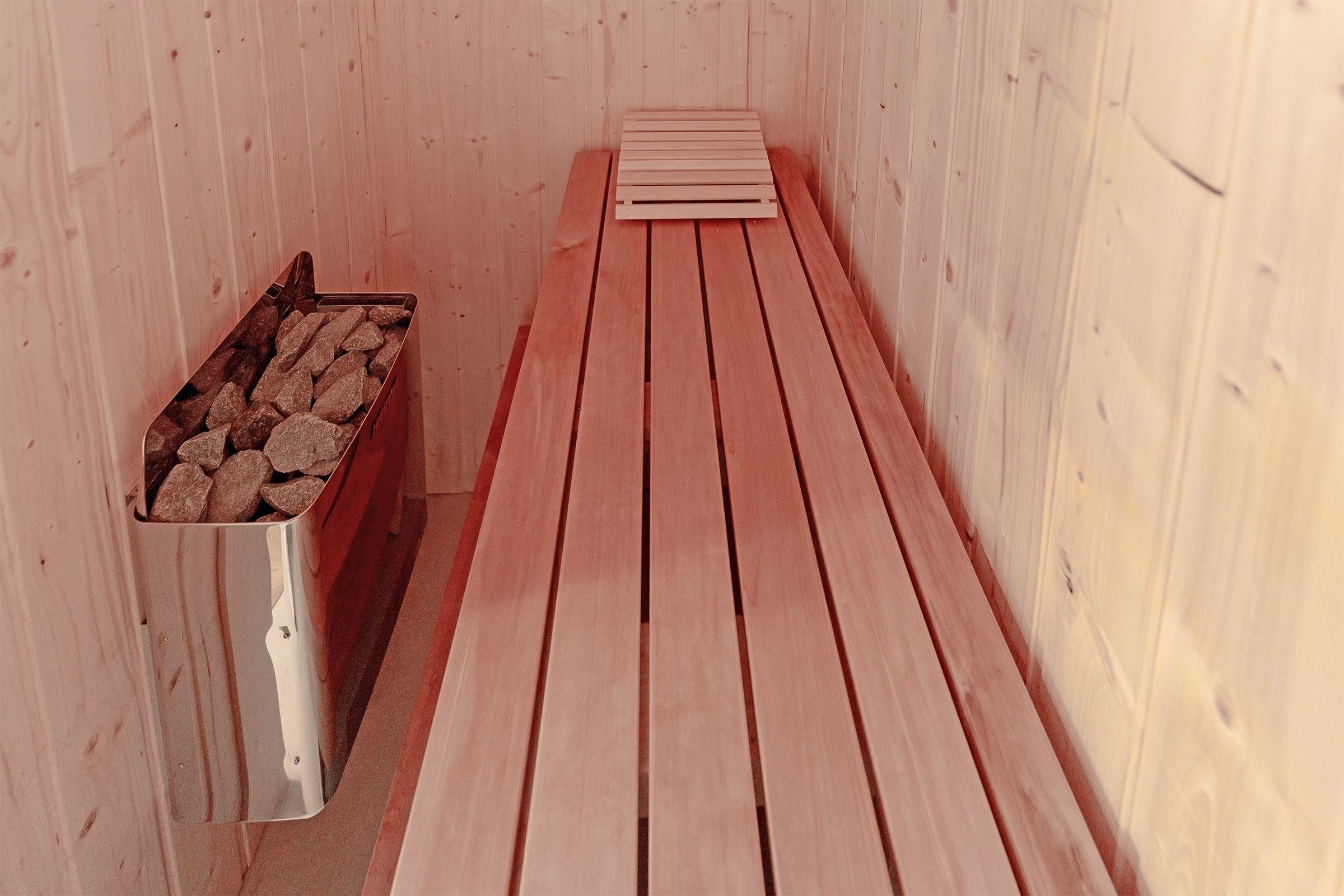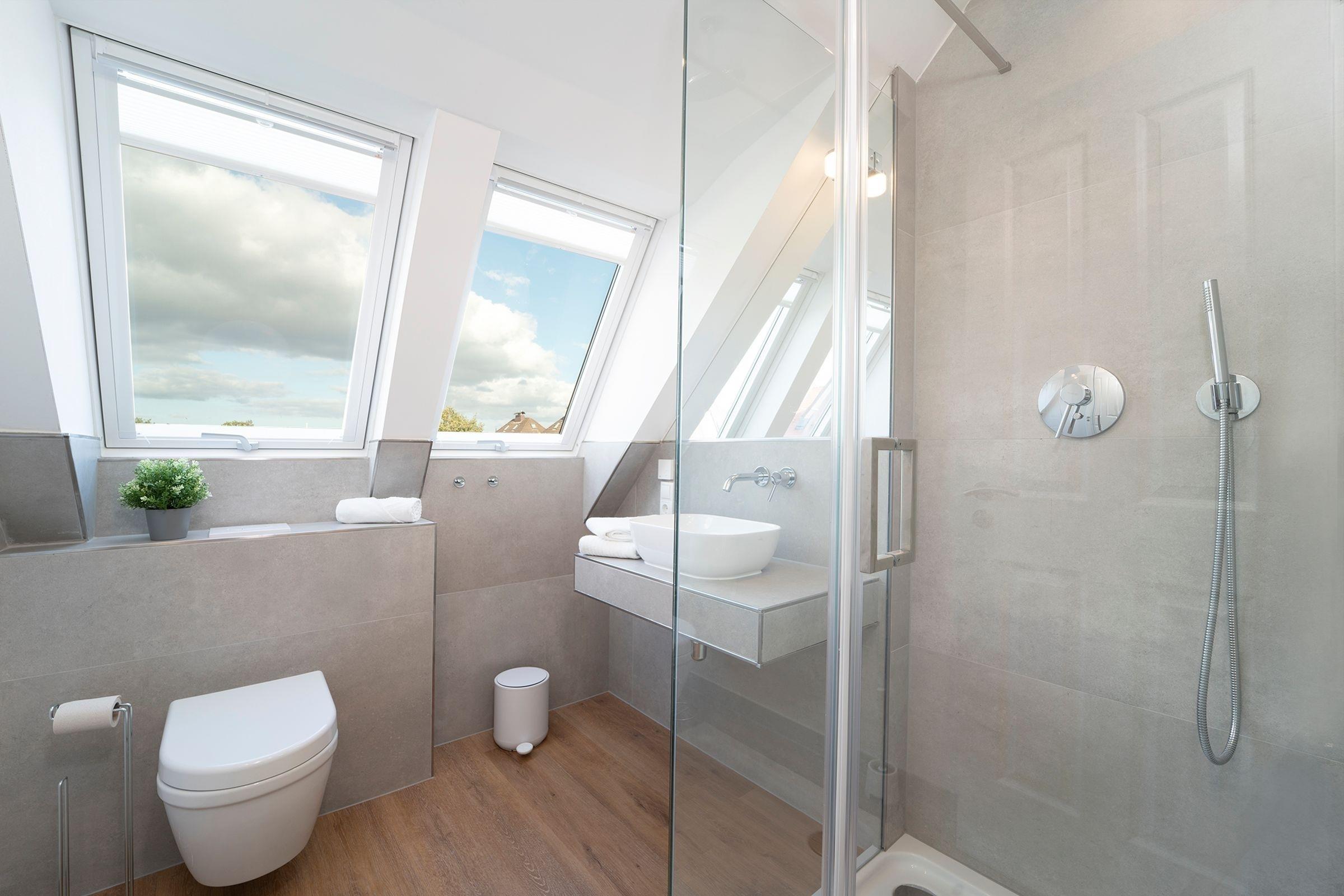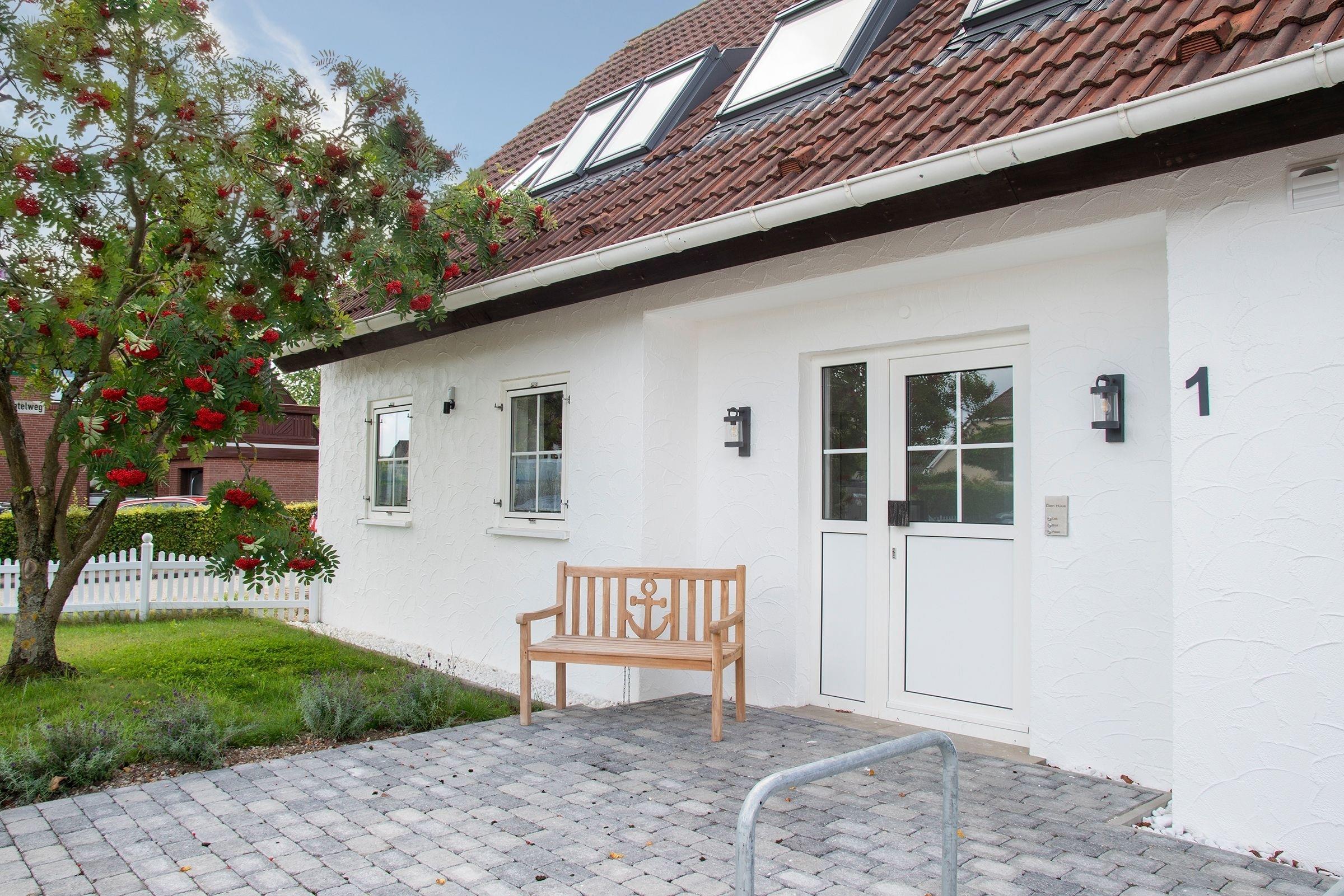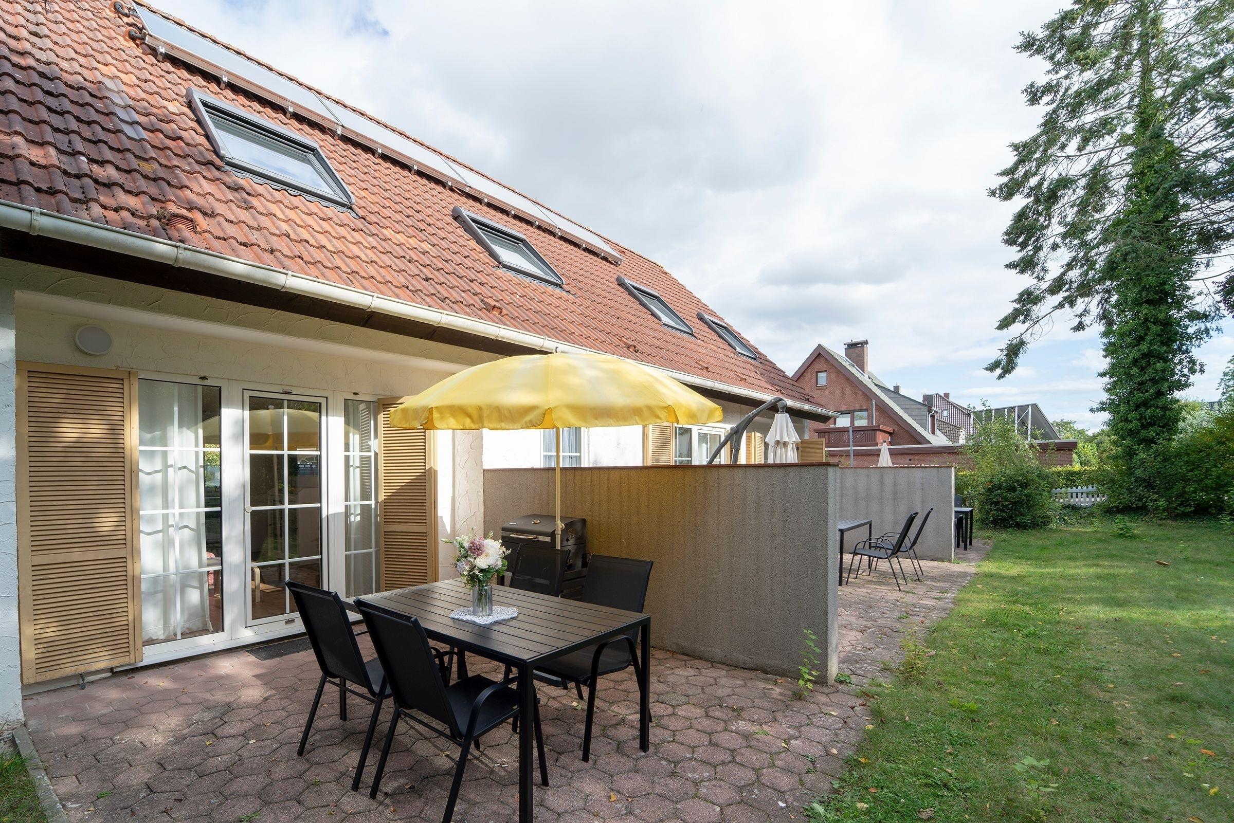 Der Wohn-/Essbereich mit offener Küche gestaltet sich besonders freundlich und bietet genügend Möglichkeiten, um gemeinsam erholsame Urlaubstage zu verbringen. Die Küchenzeile ist zum Wohnbereich hin offen und besitzt alle Ausstattungsmerkmale, um ein leckeres Urlaubsfrühstück oder ein gemütliches Dinner zuzubereiten. Ein Highlight dieser Ferienwohnung ist die Terrasse mit Gartenmöbeln, auf der Sie nach einem langen Urlaubstag entspannen können. Das angrenzende Gartenstück wird gemeinschaftlich von allen Bewohnern der Anlage genutzt. Drei Schlafzimmer und zwei moderne Bäder befinden sich in der 1. Etage. Zwei Schlafzimmer sind jeweils mit einem Doppelbett (2x 90x200 cm) und Kleiderschrank ausgestattet. Das dritte Schlafzimmer verfügt über ein Einzelbett (90x200 cm). Morgens können Sie sich in den modernen und hell gefliesten Duschbädern mit Fußbodenheizung für den Tag bereit machen. Die wohnungseigene Sauna in einem der beiden Duschbäder sorgt für eine rundum gelungene Urlaubszeit.
