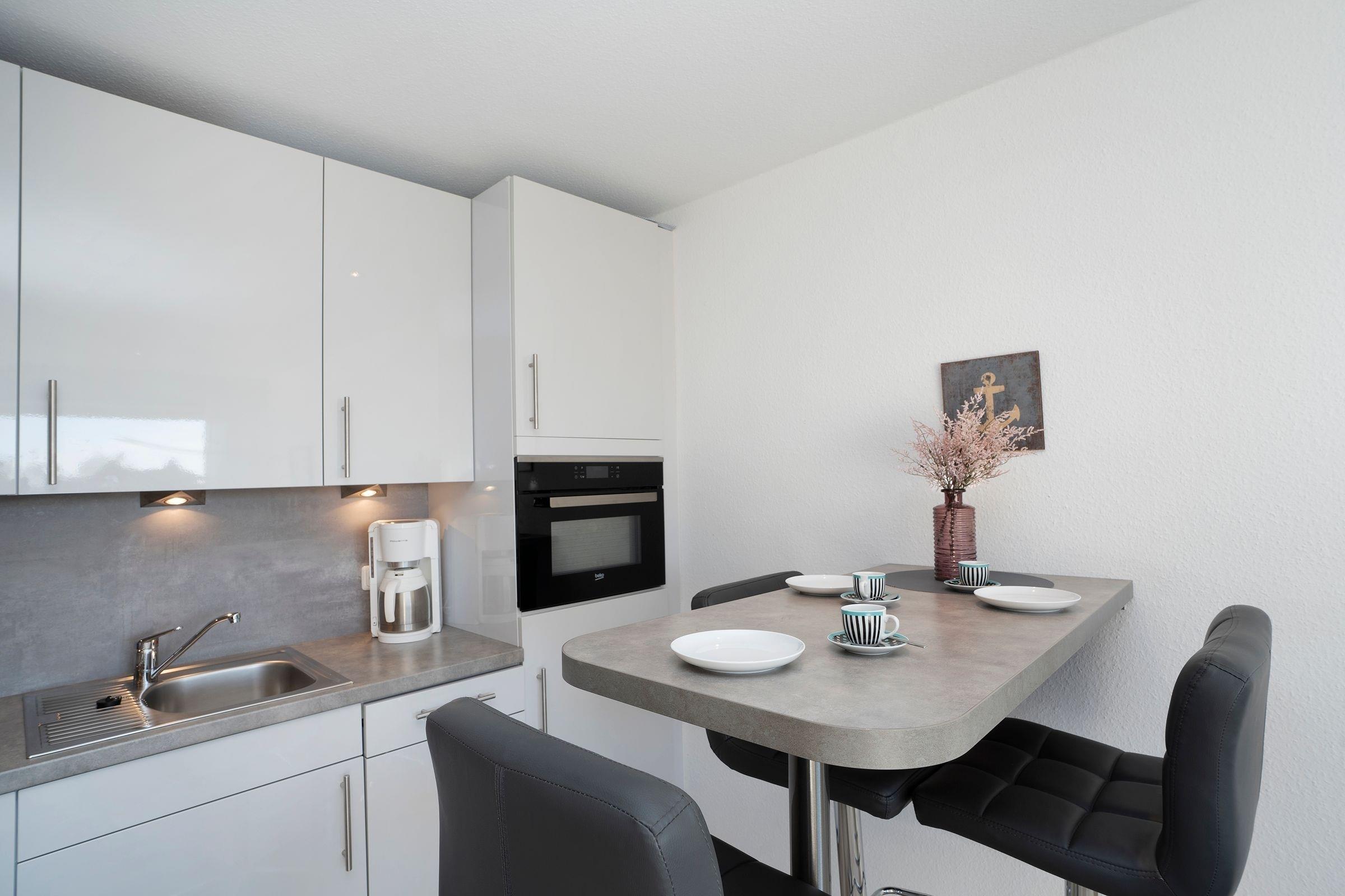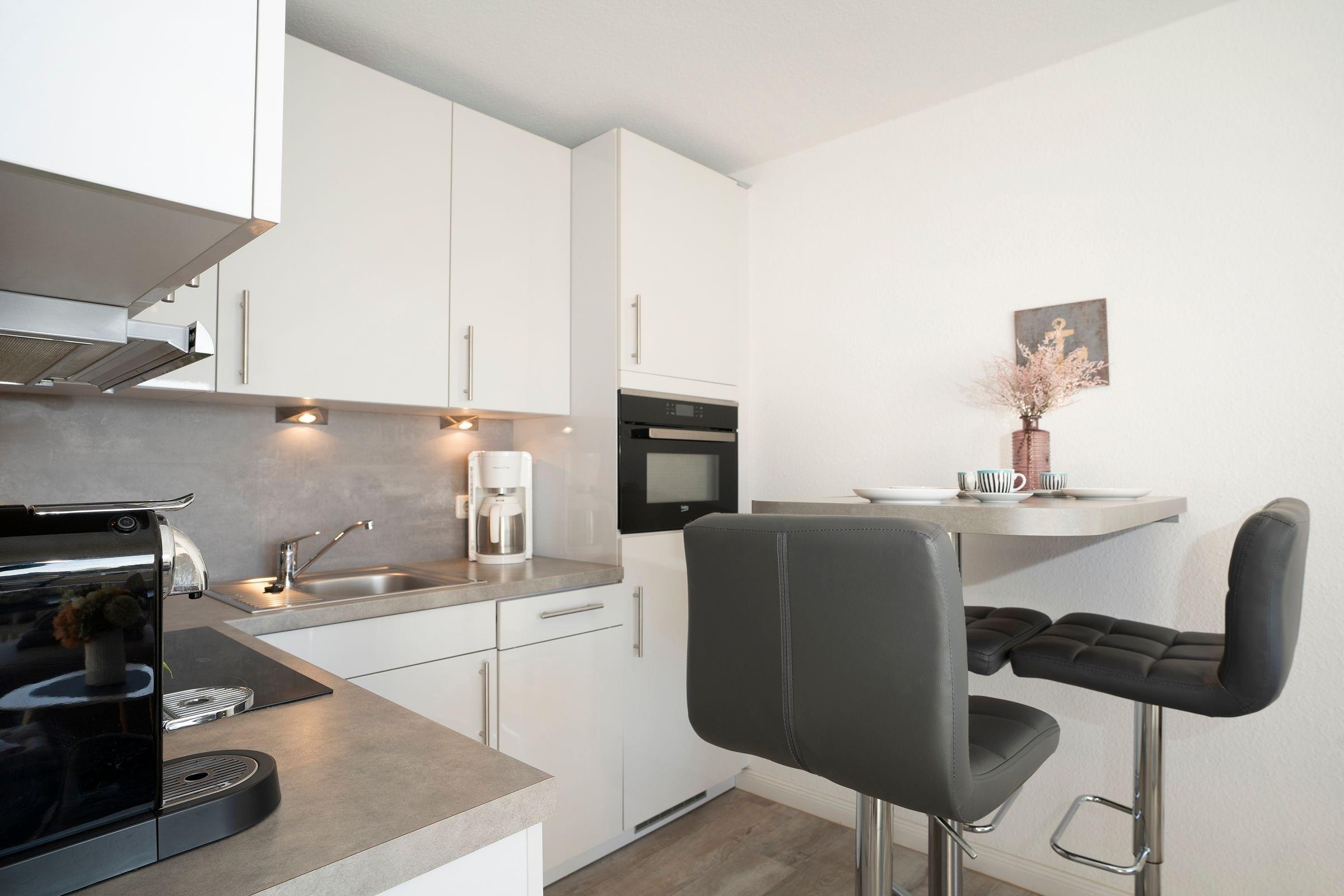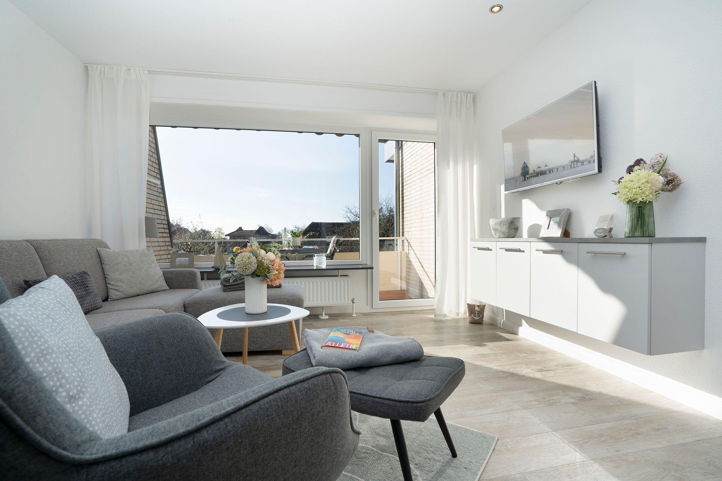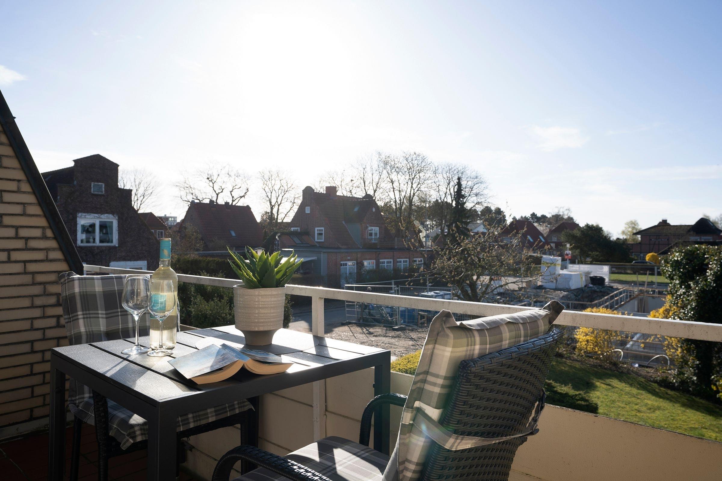 Im ersten Stock des Wohngebäudes empfängt Sie diese gemütliche Ferienwohnung mit einem Flur, der in das offen gestaltete Wohnzimmer mit Essbereich und Küchenzeile mündet. Verbringen Sie hier entspannte Abende auf der gemütlichen Couch vor dem Smart-TV oder entspannen bei einem guten Buch aus der kleinen Bibliothek. Schnell ausgeklappt verwandelt sich die Couch zur einer weiteren Schlafmöglichkeit (160x200 cm). Die angrenzende Küchenzeile ist praktisch ausgestattet mit einer Nespresso-Kapselmaschine, einem Ceran-Feld und einem Kombigerät mit Backofen- und Mikrowellenfunktion. Auf dem möblierten Balkon mit Südausrichtung und Sonnenmarkise können Sie zahlreiche Urlaubsstunden an der frischen Luft genießen.
