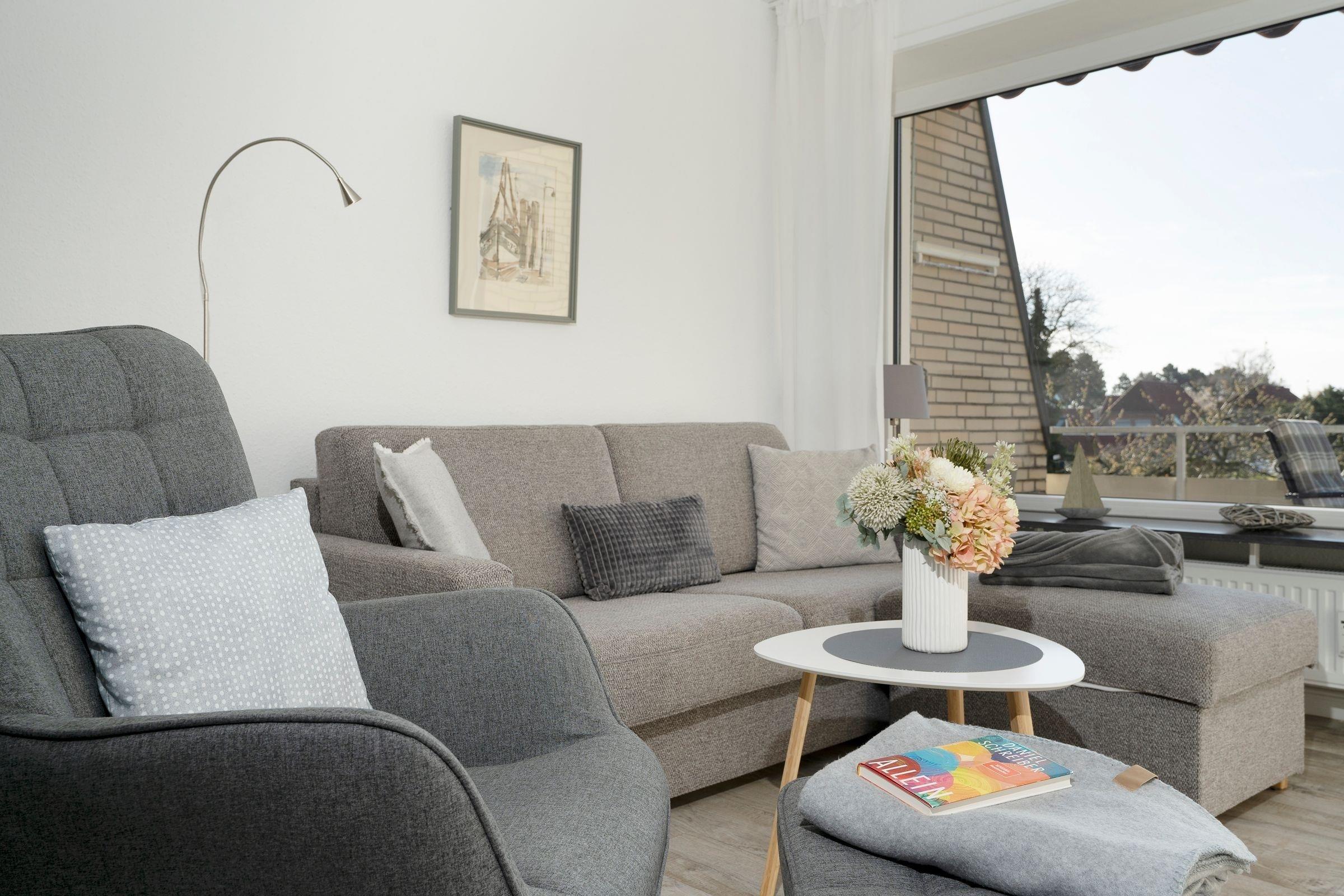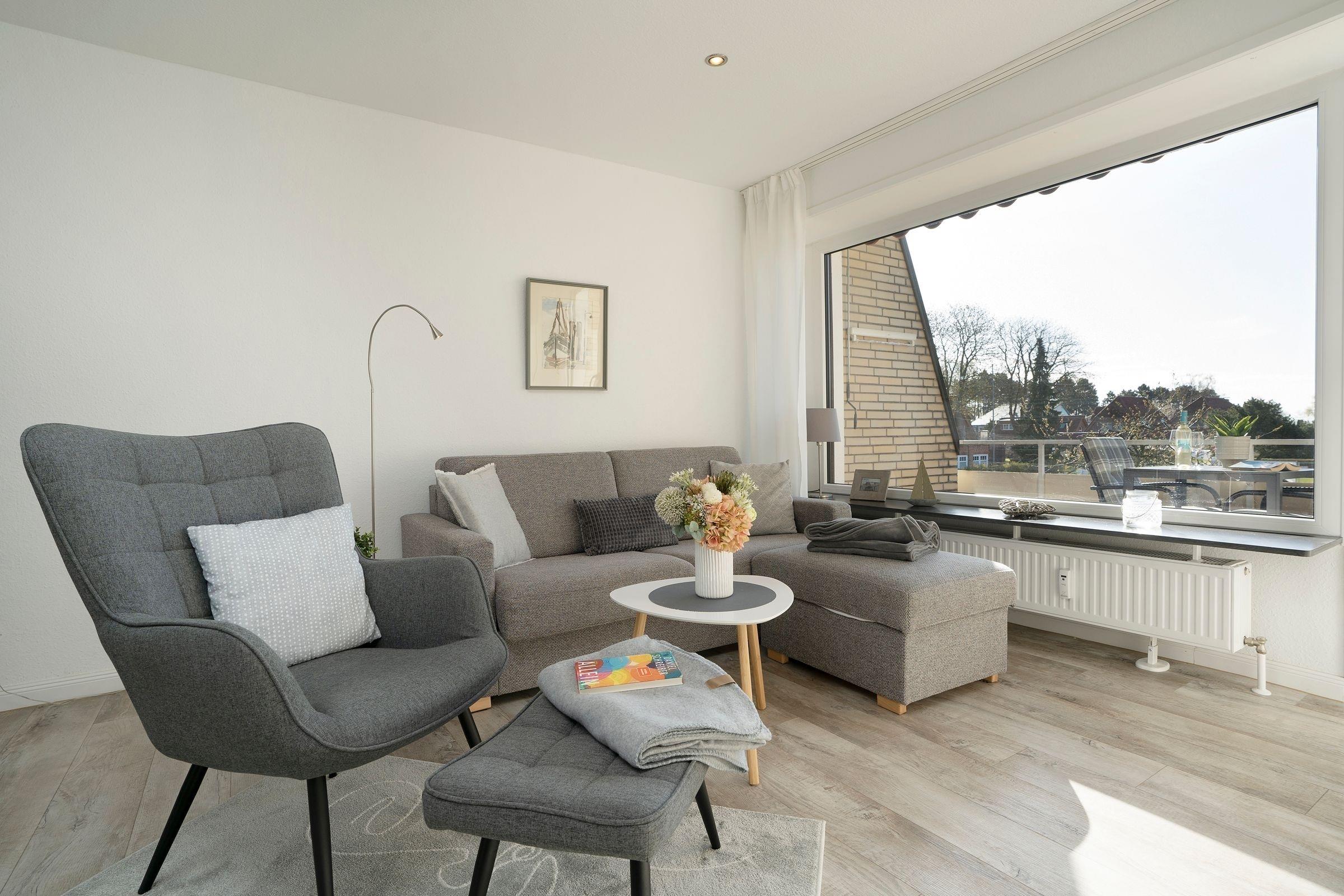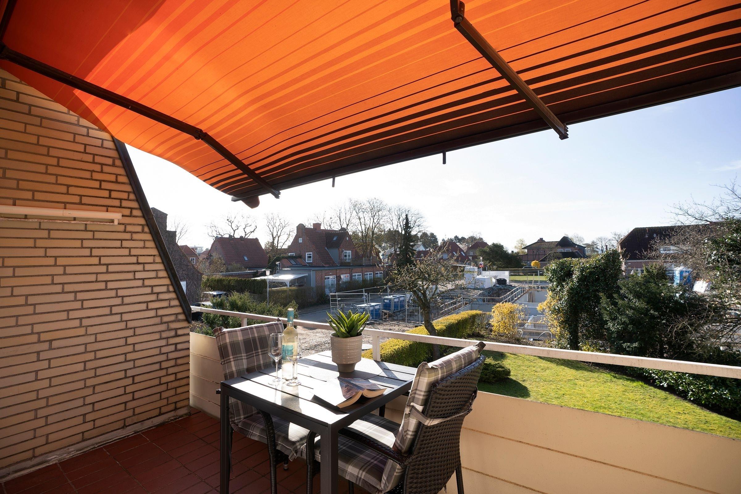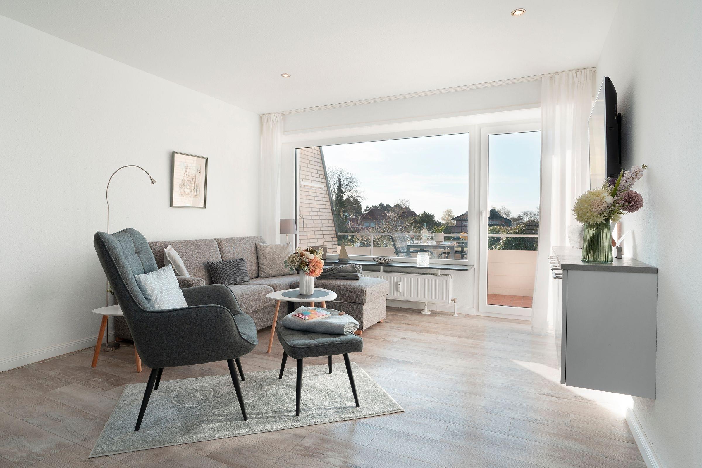 Im ersten Stock des Wohngebäudes empfängt Sie diese gemütliche Ferienwohnung mit einem Flur, der in das offen gestaltete Wohnzimmer mit Essbereich und Küchenzeile mündet. Verbringen Sie hier entspannte Abende auf der gemütlichen Couch vor dem Smart-TV oder entspannen bei einem guten Buch aus der kleinen Bibliothek. Schnell ausgeklappt verwandelt sich die Couch zur einer weiteren Schlafmöglichkeit (160x200 cm). Die angrenzende Küchenzeile ist praktisch ausgestattet mit einer Nespresso-Kapselmaschine, einem Ceran-Feld und einem Kombigerät mit Backofen- und Mikrowellenfunktion. Auf dem möblierten Balkon mit Südausrichtung und Sonnenmarkise können Sie zahlreiche Urlaubsstunden an der frischen Luft genießen.