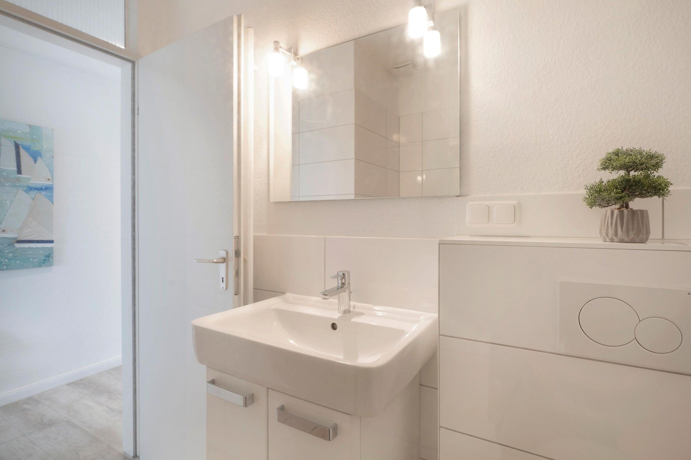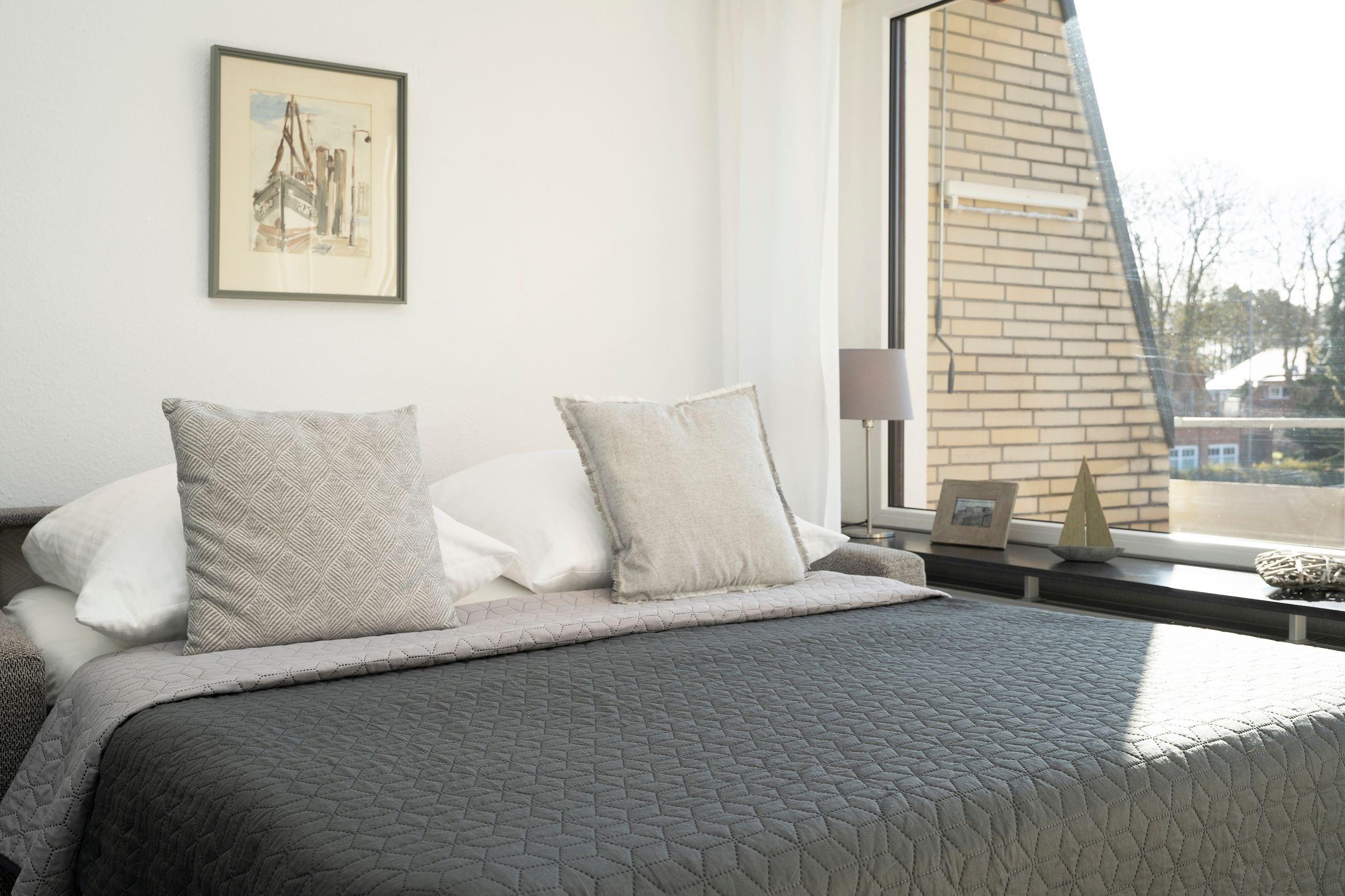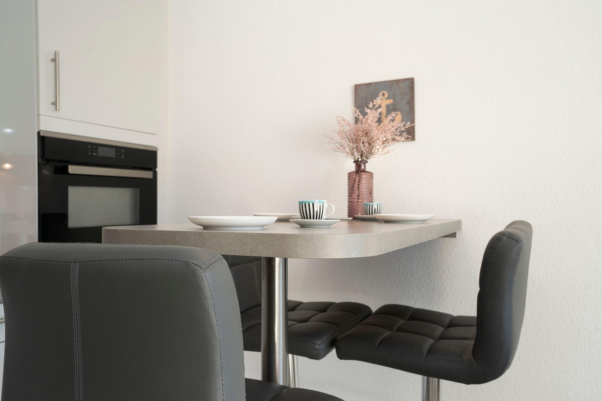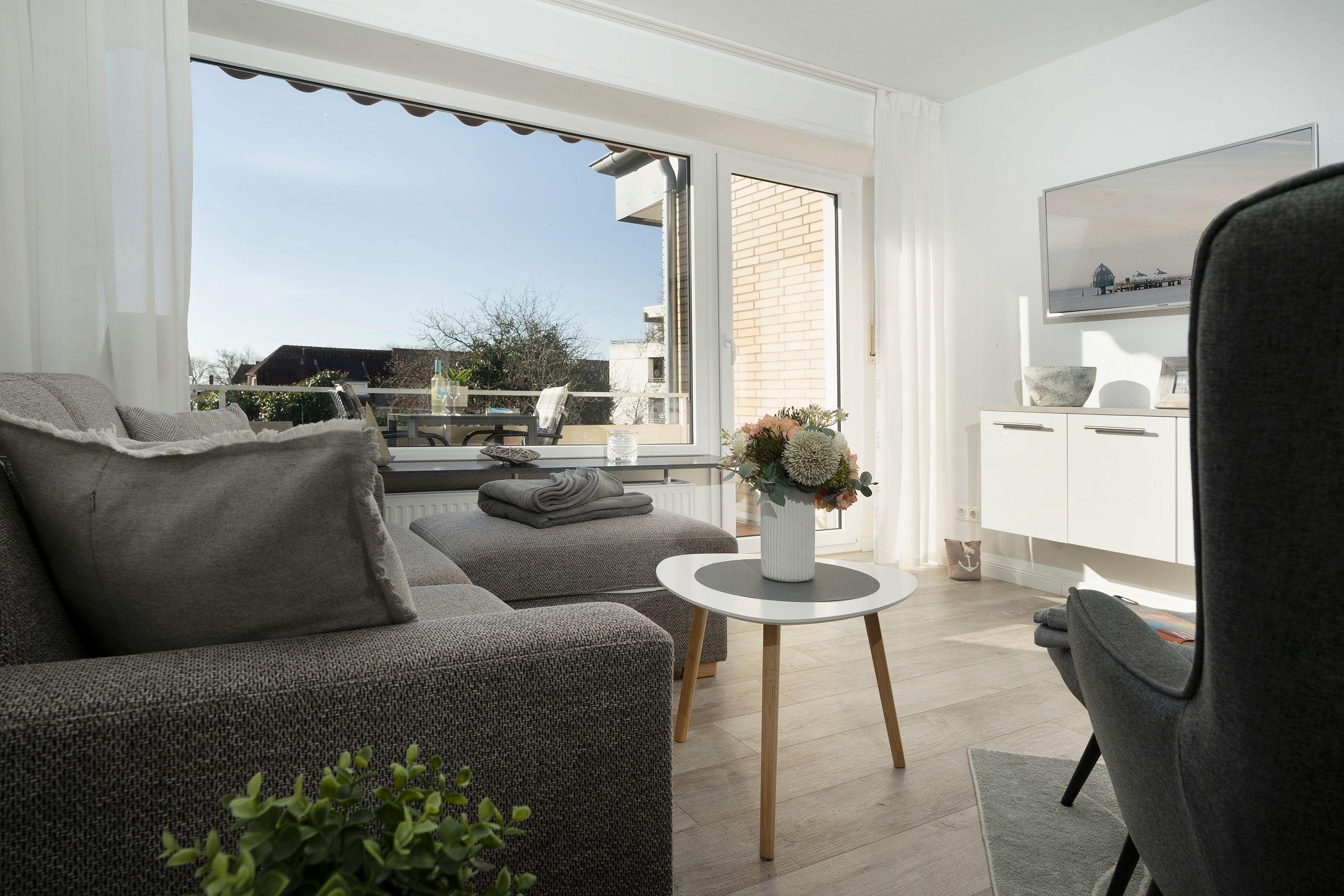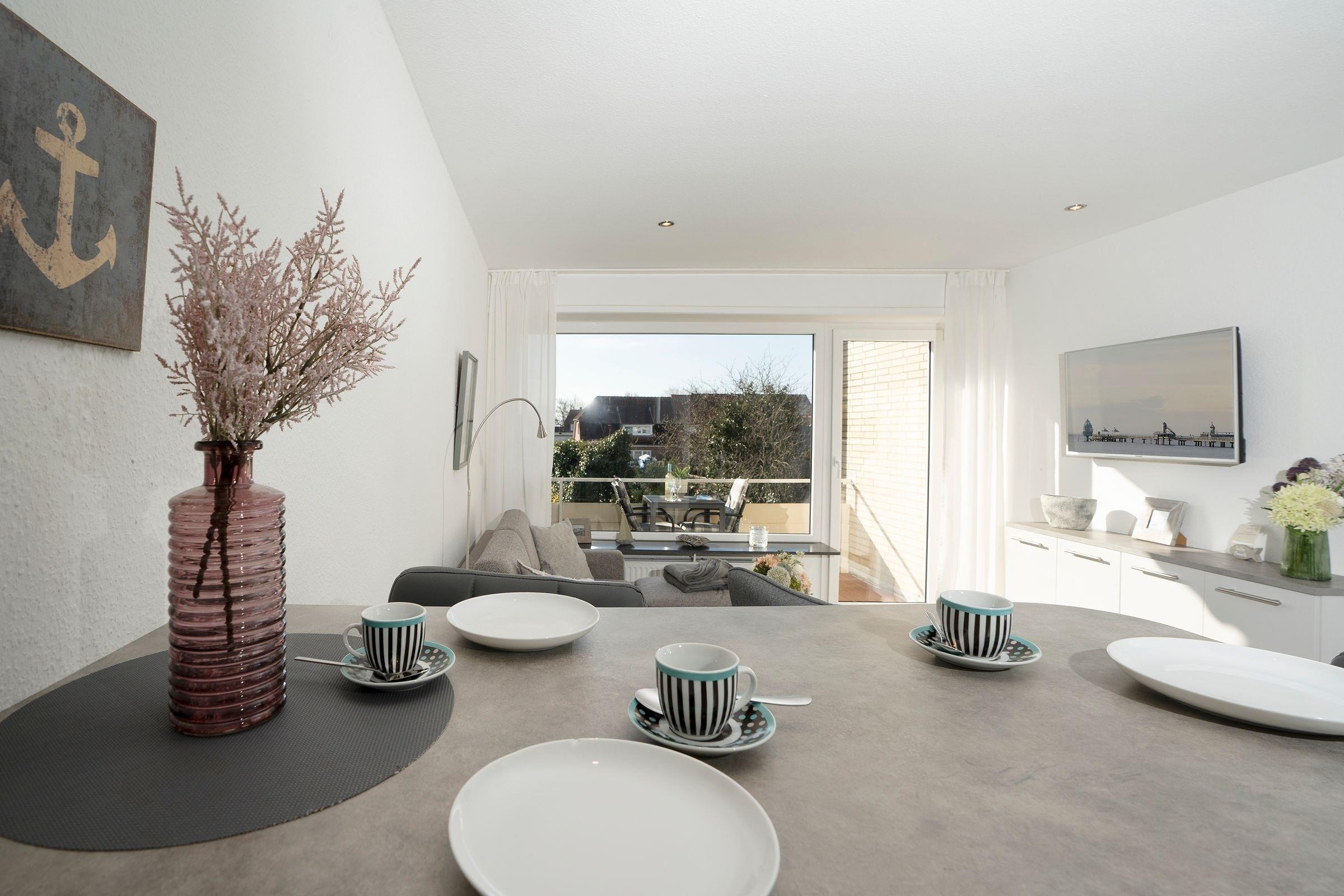 Im ersten Stock des Wohngebäudes empfängt Sie diese gemütliche Ferienwohnung mit einem Flur, der in das offen gestaltete Wohnzimmer mit Essbereich und Küchenzeile mündet. Verbringen Sie hier entspannte Abende auf der gemütlichen Couch vor dem Smart-TV oder entspannen bei einem guten Buch aus der kleinen Bibliothek. Schnell ausgeklappt verwandelt sich die Couch zur einer weiteren Schlafmöglichkeit (160x200 cm). Die angrenzende Küchenzeile ist praktisch ausgestattet mit einer Nespresso-Kapselmaschine, einem Ceran-Feld und einem Kombigerät mit Backofen- und Mikrowellenfunktion. Auf dem möblierten Balkon mit Südausrichtung und Sonnenmarkise können Sie zahlreiche Urlaubsstunden an der frischen Luft genießen.