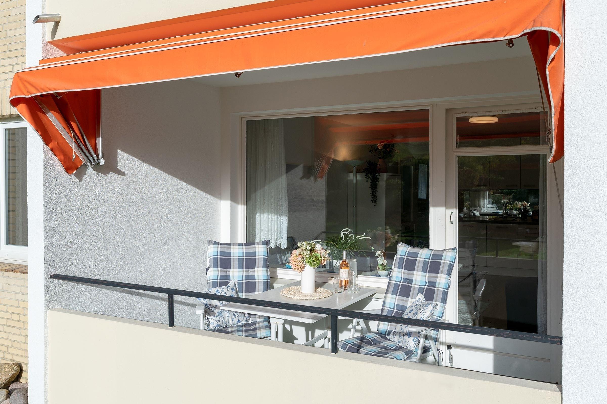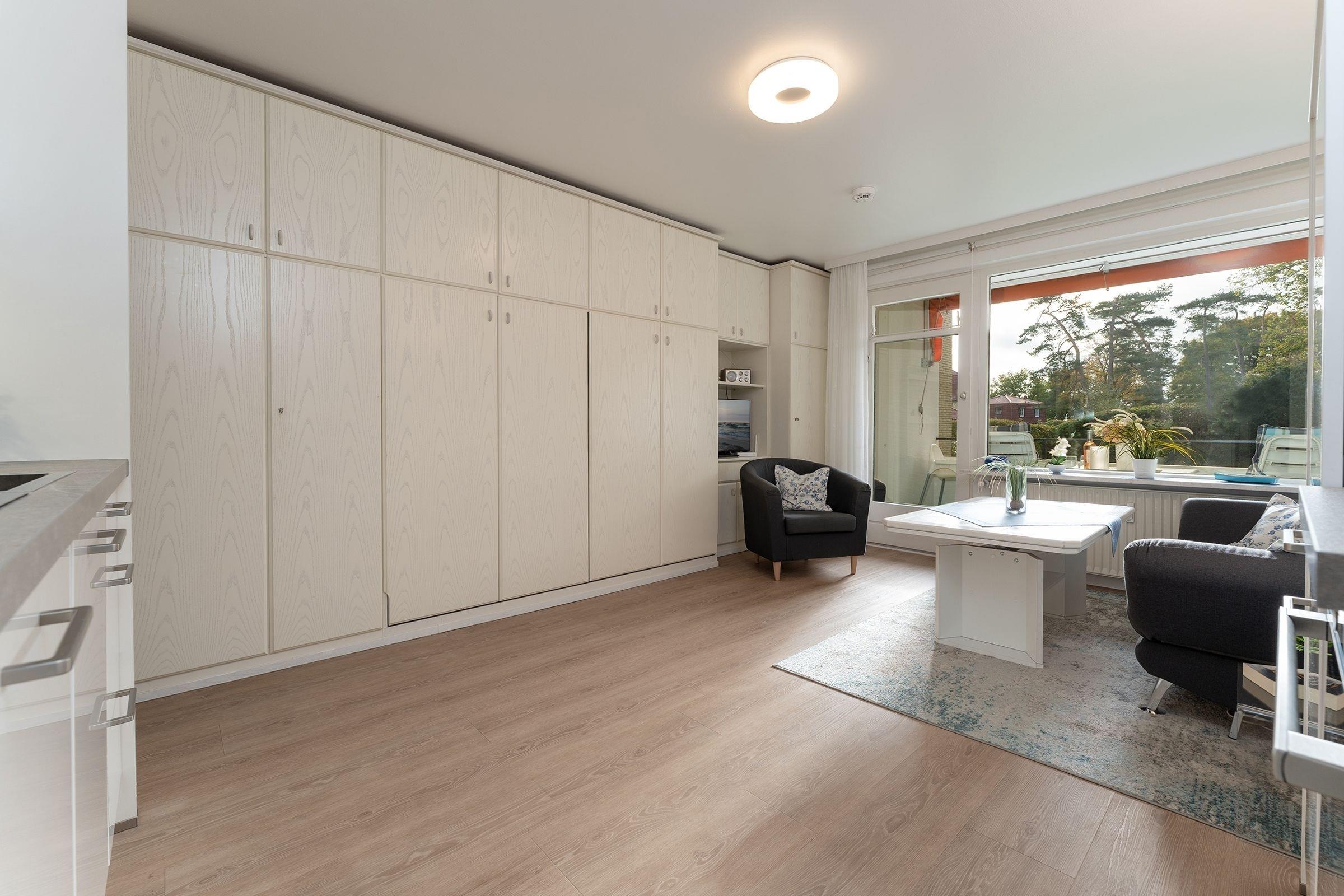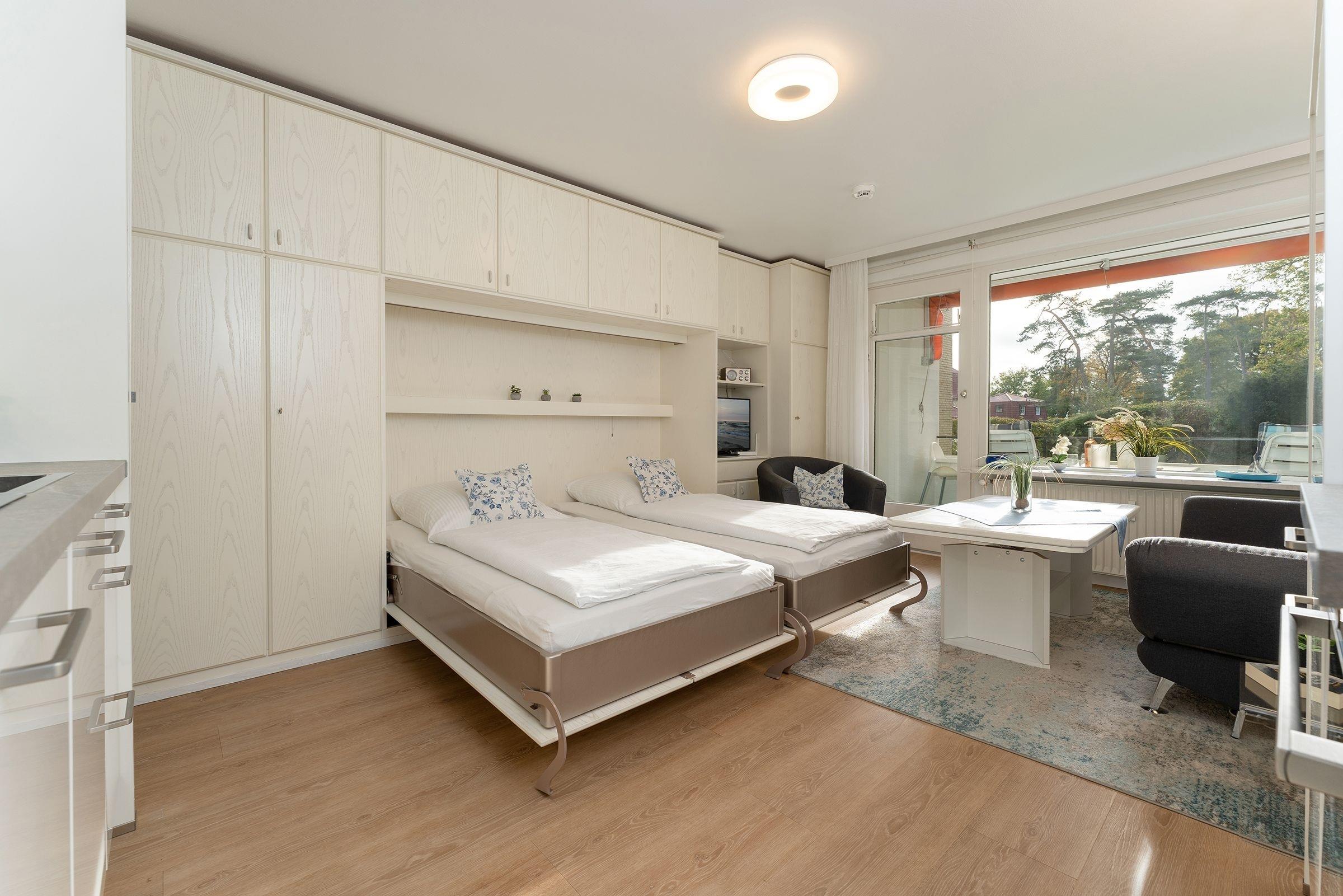 Der offen gestaltete Wohnraum bietet Ihnen neben einem gemütlichen Sofa zwei der drei Schlafplätze durch ein platzsparendes Schrankbett (2x 100x200 cm). Das angrenzende Schlafzimmer verfügt über ein ausklappbares Einzelbett (80x190 cm) für den dritten mitreisenden Gast. Mit der modernen Küche mit Induktionsherd sind Sie bestens gewappnet, wenn Sie sich selbst verpflegen wollen. Für einen gelungenen Start in den Tag bietet diese Wohnung ein Tageslichtbad mit Duschkabine und beheizbarem Handtuchhalter. Wenn Sie am Nachmittag vom nur 50m entfernten Strand zurück kommen, können Sie die Nachmittagssonne auf dem überdachten Balkon mit Markise genießen.