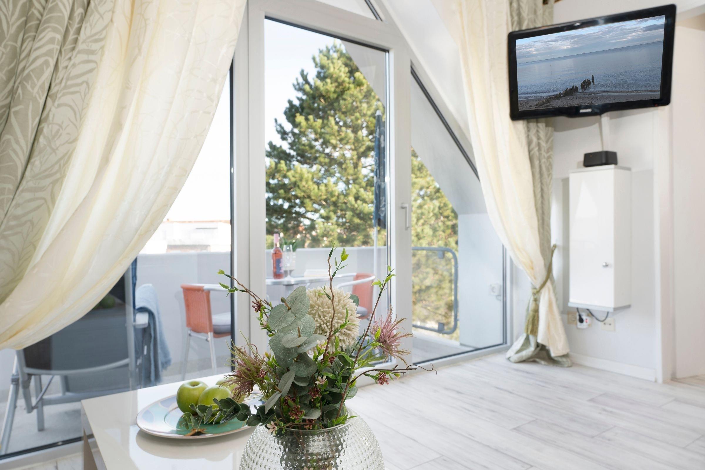 Durch ein geschicktes Einrichtungskonzept ist im lichtdurchfluteten, offenen Wohn- & Schlafbereich alles komfortabel untergebracht. Tagsüber entspannen Sie auf dem bequemen Sofa, das Sie zur Nacht in einen gemütlichen Schlafplatz (140x200 cm) verwandelt werden kann. Zusätzlich lädt ein großes Doppelbett (160x200 cm) zum Träumen und Erholen ein. Auf dem überdachten, möblierten Balkon genießen Sie die Sonnentage und die frische Ostseeluft, bei Bedarf spendet ein Sonnenschirm angenehmen Schatten. Ihre Mahlzeiten können Sie in der gut ausgestatteten Küche zubereiten und an einem der Essplätze in der Küche oder im Wohnzimmer einnehmen. Im hell gefliesten Tageslicht-Bad starten Sie mit einer erfrischenden Dusche in den neuen Urlaubstag. Für Unterhaltung sorgen ein Flachbild-TV sowie der vorhandene WLAN-Anschluss.