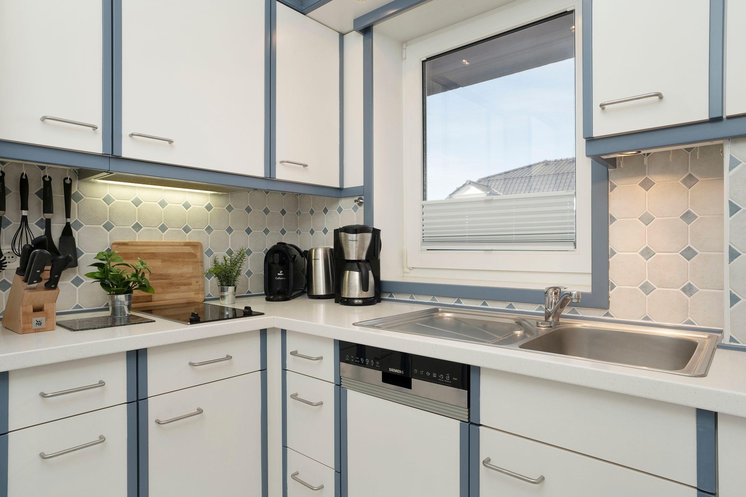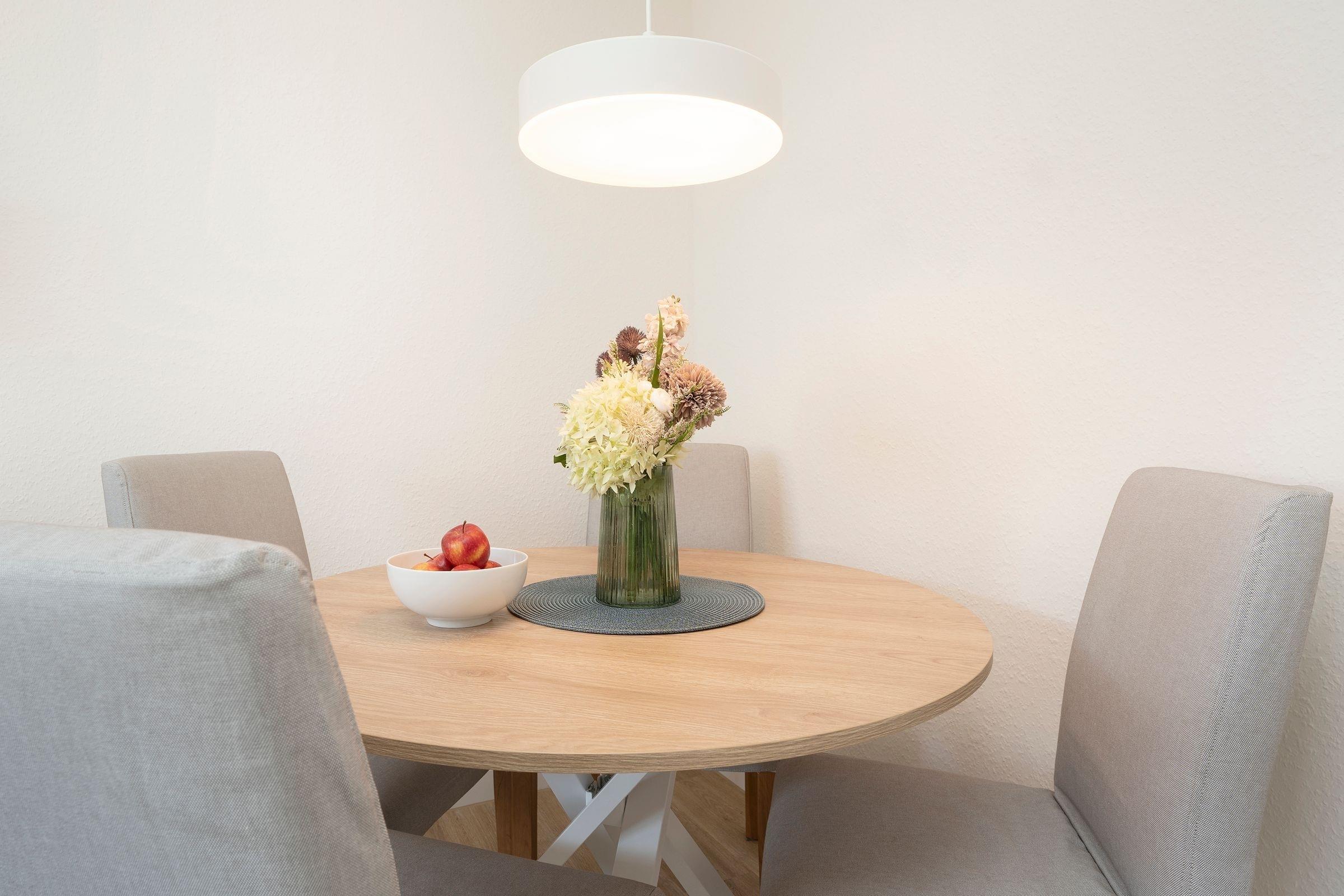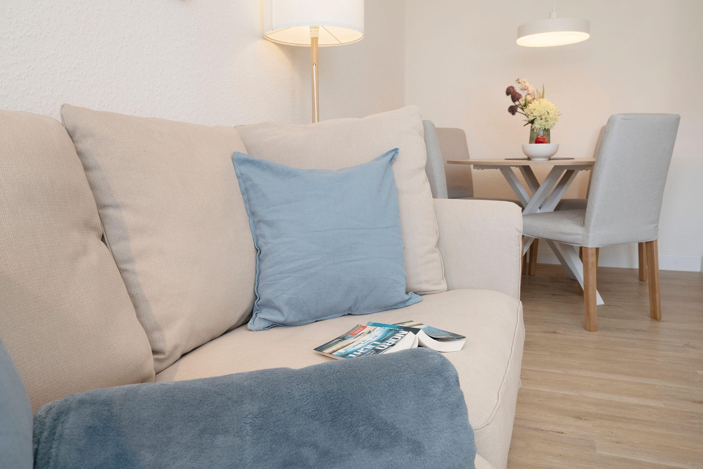 Treten Sie ein in das modern gestaltete Wohnzimmer mit integriertem Essbereich. Ob gesellige Spielerunde oder gemütlicher Filmabend - hier haben Sie Platz, um Ihre Urlaubstage mit Ihren Liebsten ausklingen zu lassen. Von hier aus gelangen Sie auch auf den Balkon mit Ost-Ausrichtung, auf dem Sie ihren ersten Kaffee am Morgen genießen können. Über den Flur erreichen Sie die separate Küche, die mit einer Tchibo Cafissimo-Kapselmaschine und zahlreichen Elektrogeräten keine Wünsche offen lässt.