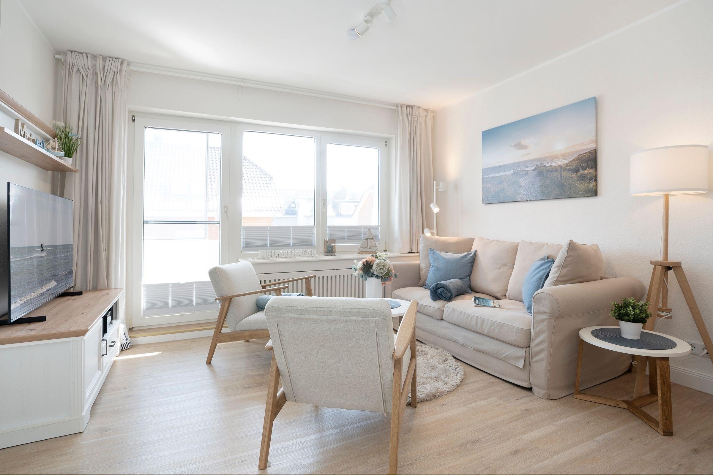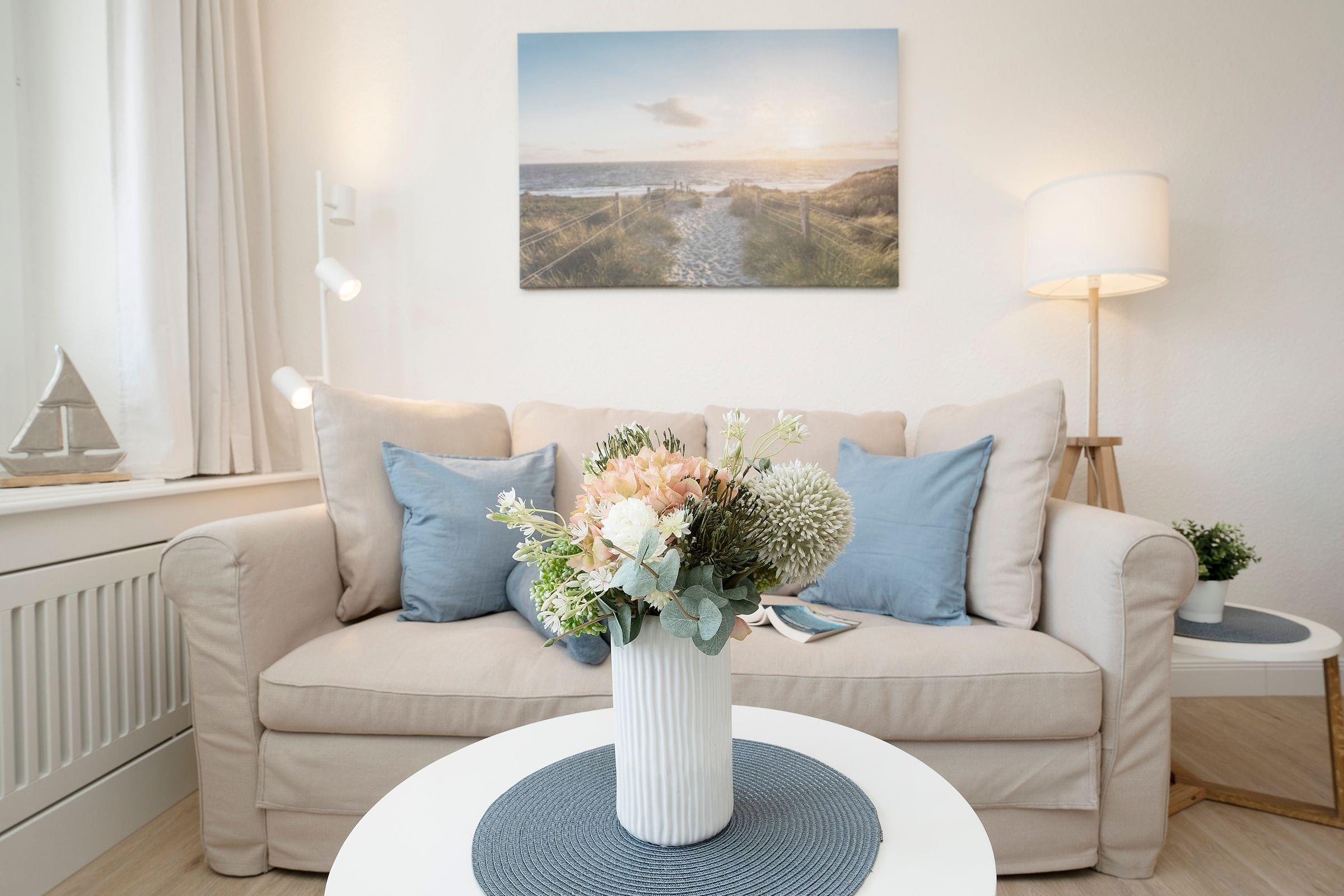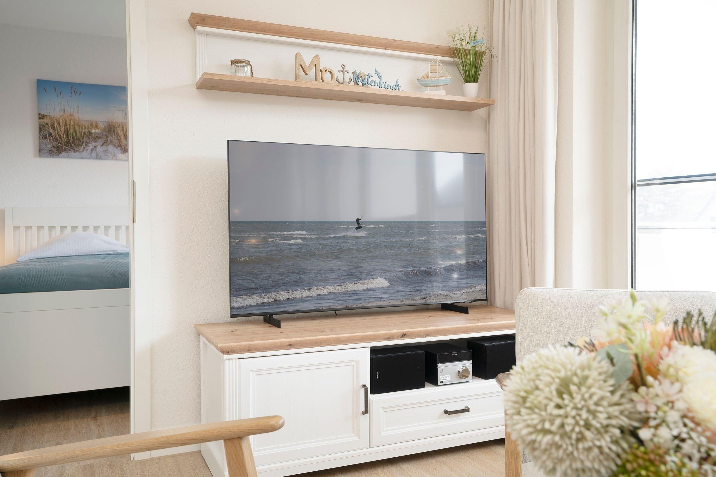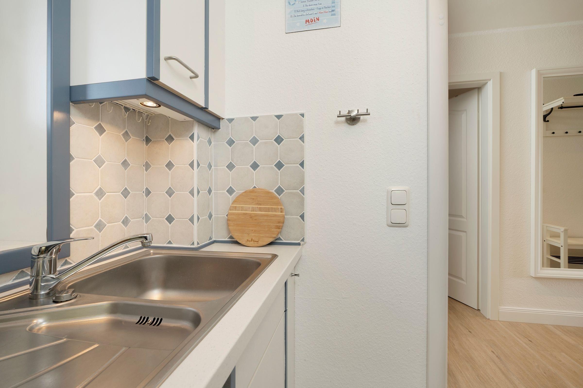 Treten Sie ein in das modern gestaltete Wohnzimmer mit integriertem Essbereich. Ob gesellige Spielerunde oder gemütlicher Filmabend - hier haben Sie Platz, um Ihre Urlaubstage mit Ihren Liebsten ausklingen zu lassen. Von hier aus gelangen Sie auch auf den Balkon mit Ost-Ausrichtung, auf dem Sie ihren ersten Kaffee am Morgen genießen können. Über den Flur erreichen Sie die separate Küche, die mit einer Tchibo Cafissimo-Kapselmaschine und zahlreichen Elektrogeräten keine Wünsche offen lässt.