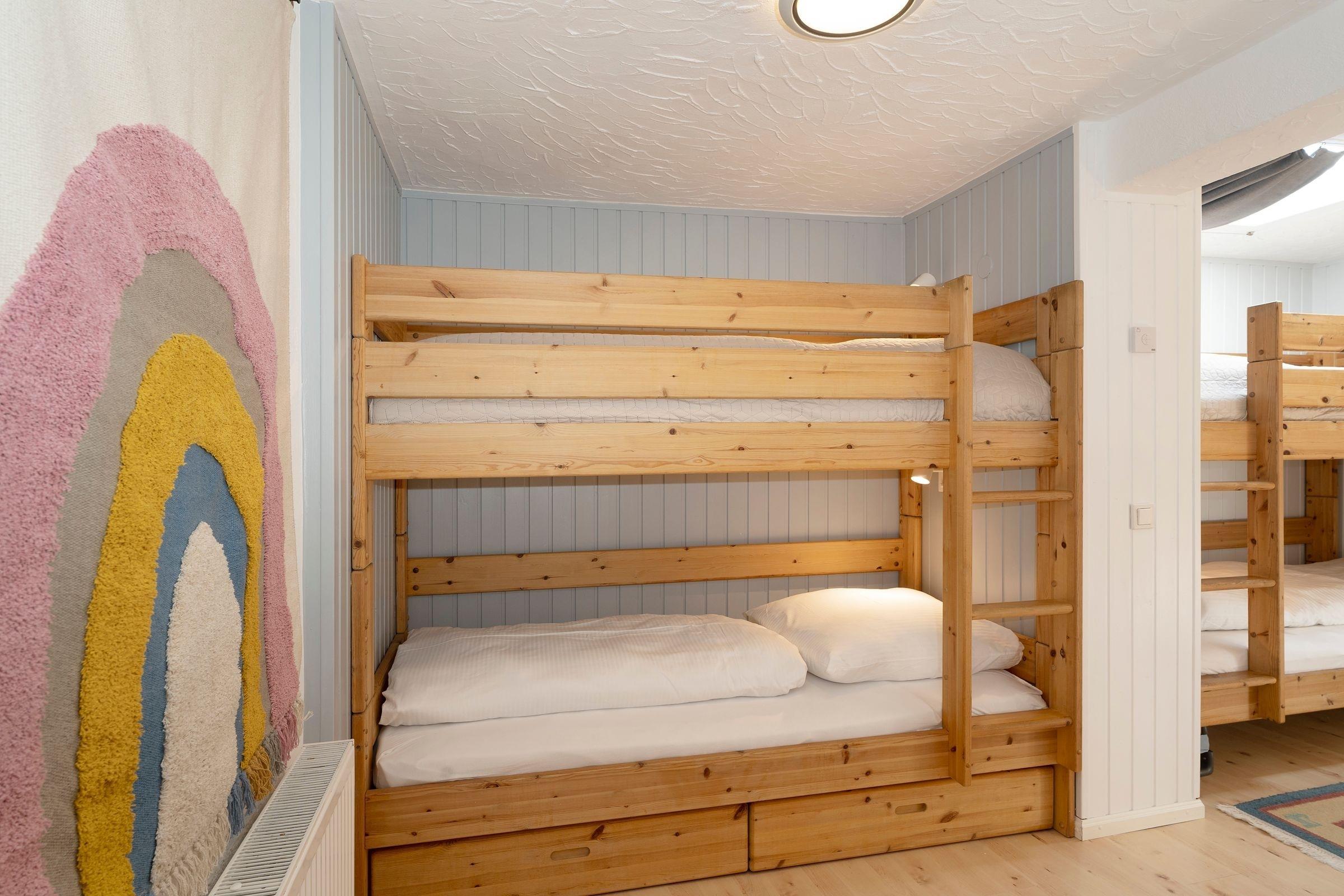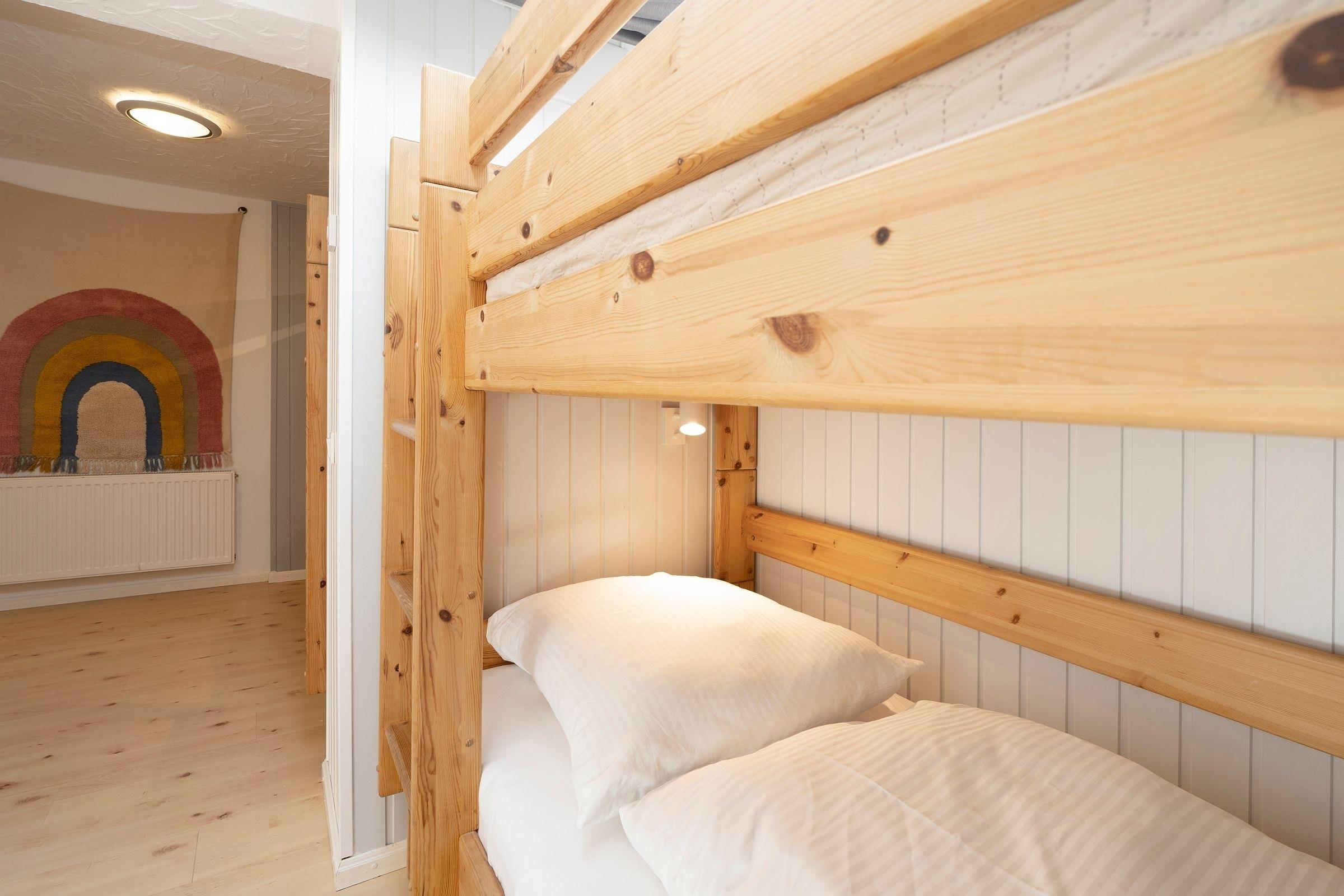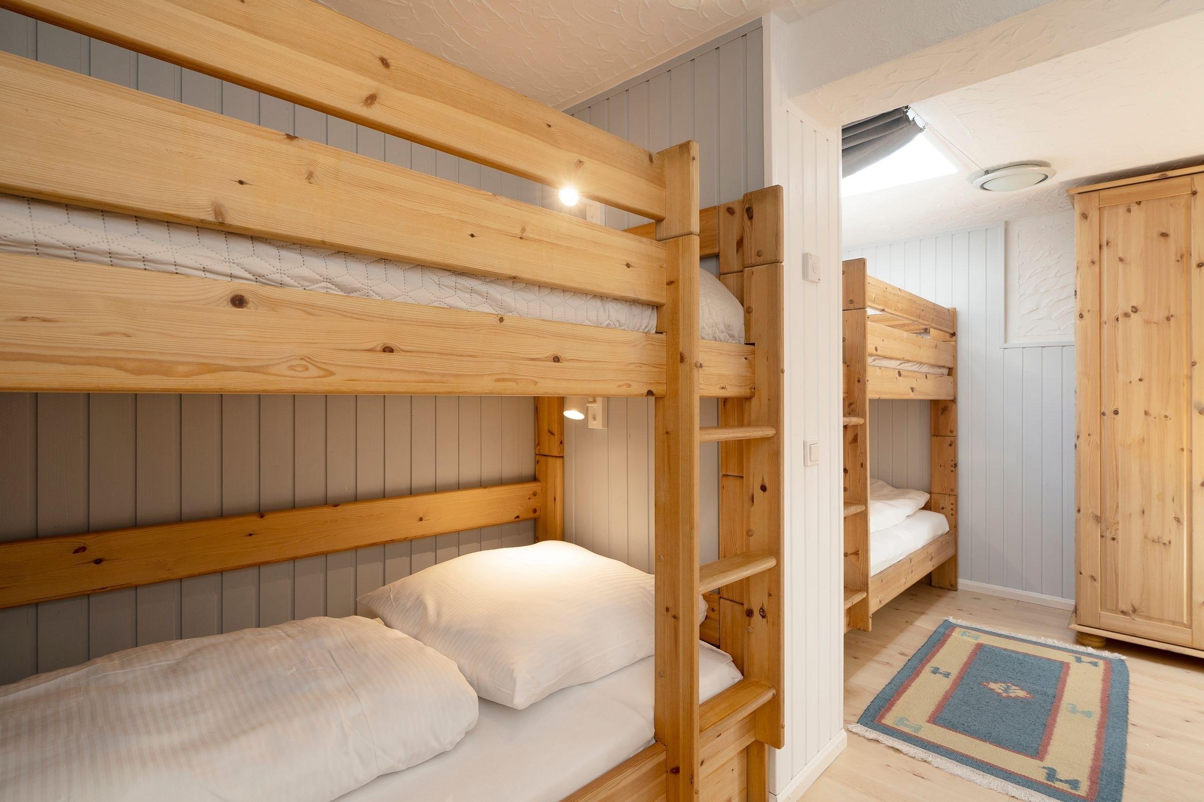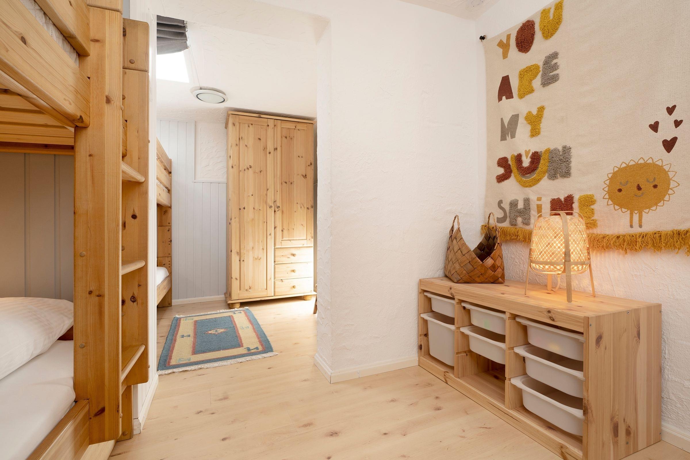 Schlafzimmer 2: 2x Etagenbett (je 90x200cm), Kleiderschrank, Verdunkelung (Vorhänge), Platz für Kinderreisebett vorhanden