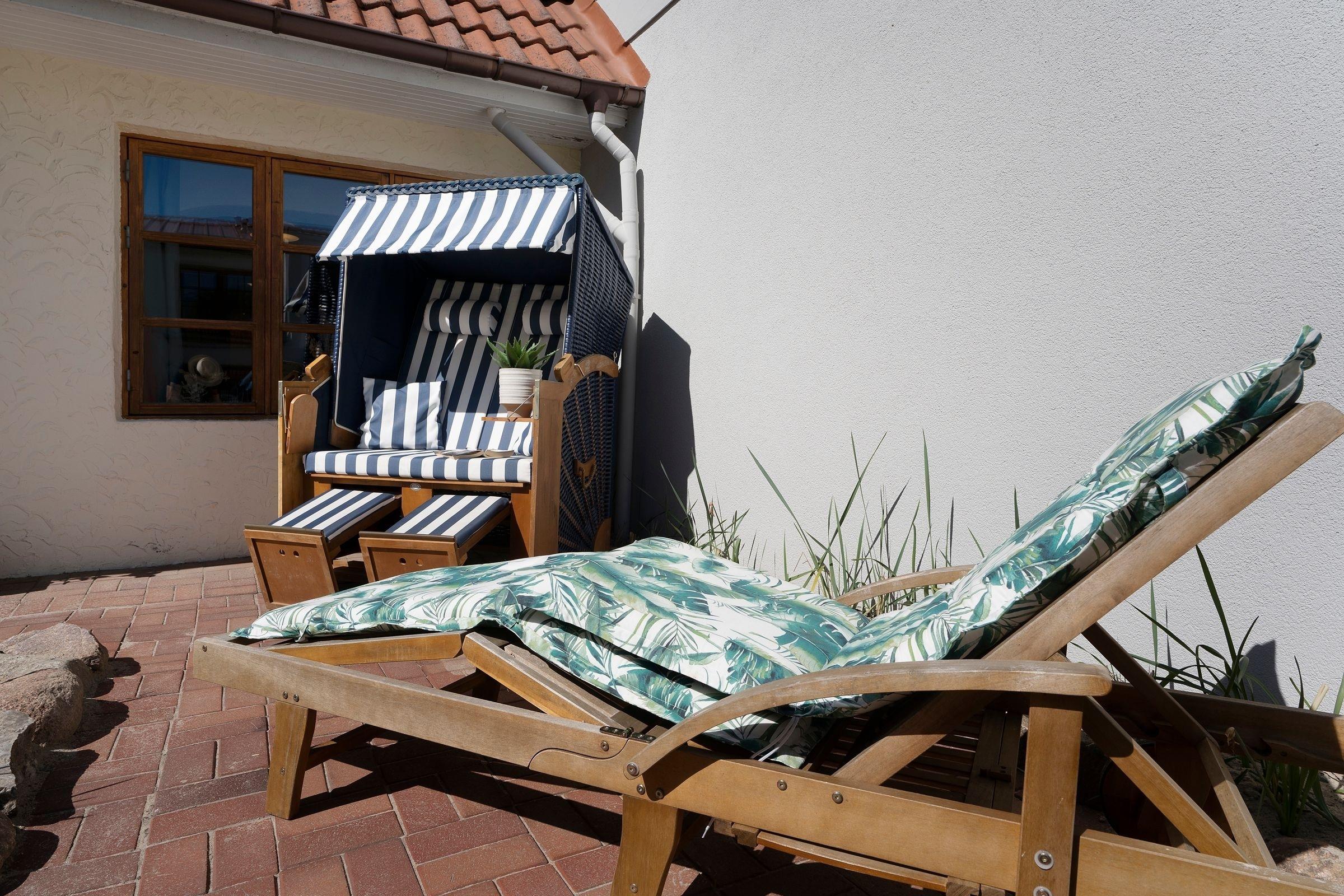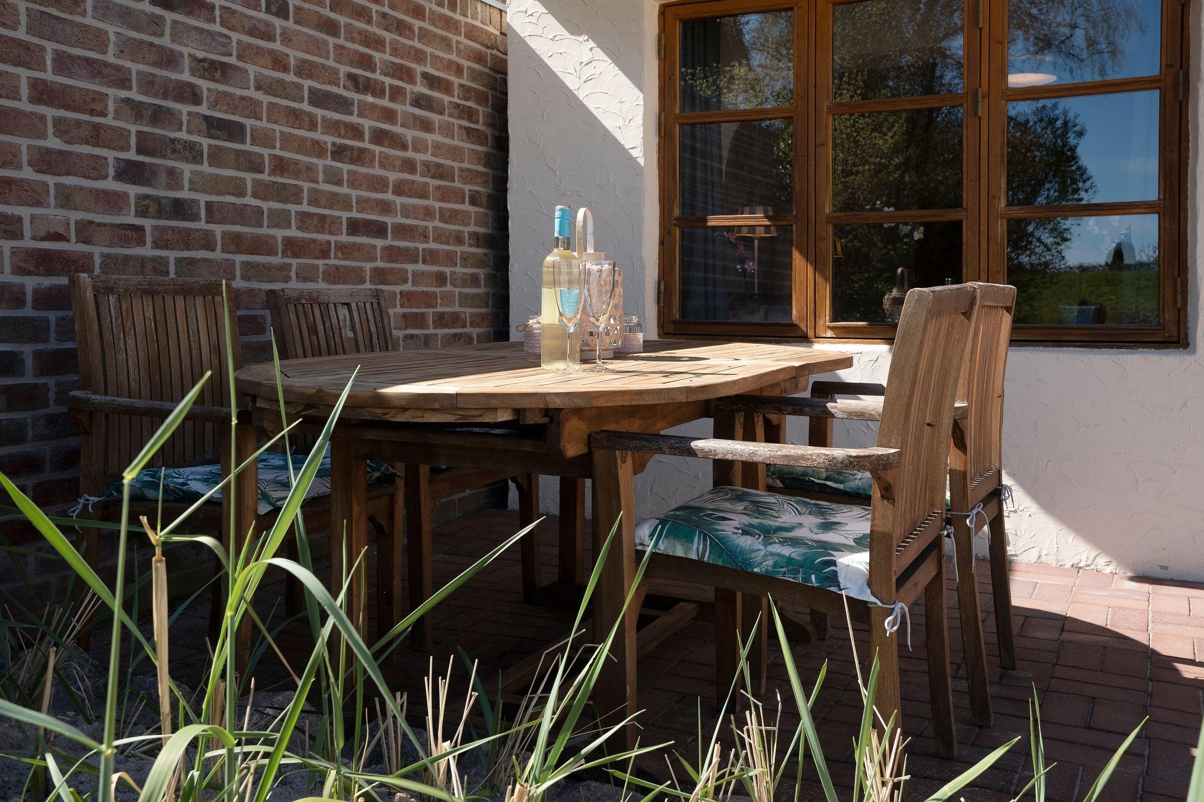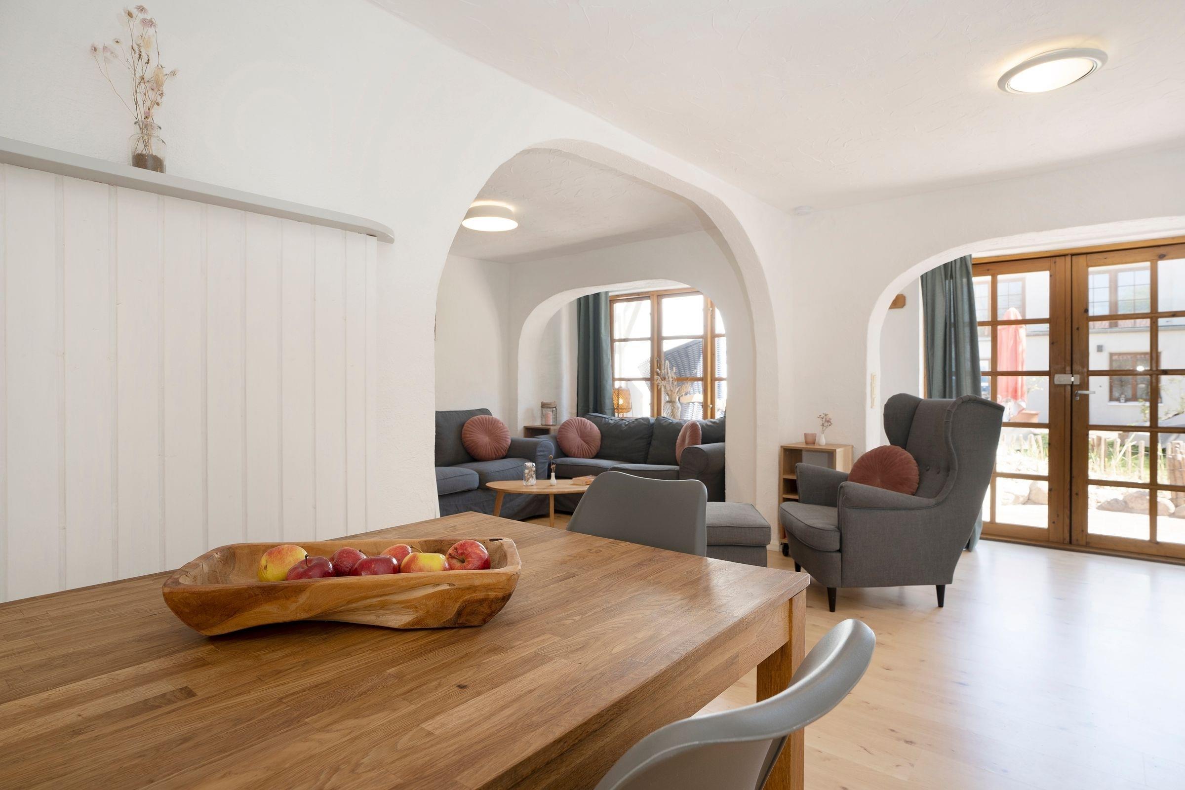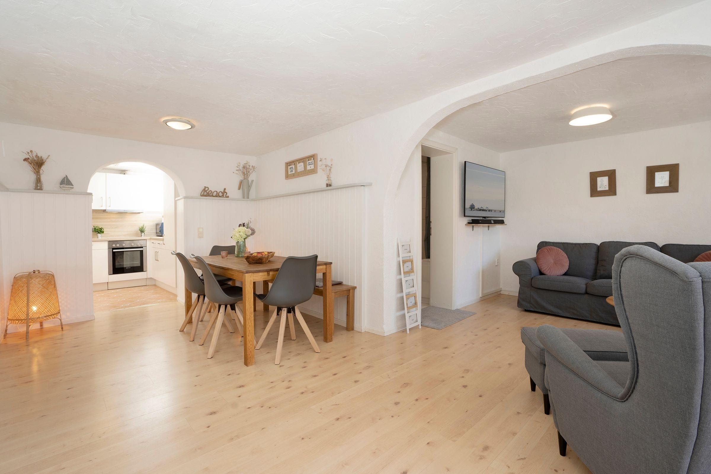 Der offene Wohn-, Ess- und Kochbereich bietet ausreichend Platz für die ganz Familie. Verbinden Sie Ihr Mobiltelefon mit dem Bluetooth Lautsprecher und starten so beschwingt in den Tag mit Ihrer Lieblingsmusik oder dem regionalen Radiosender. Je nach Wetter haben Sie die Wahl, ob Sie drinnen oder draußen essen - auf der möblierten Terrasse mit Strandkorb steht Ihnen ein Holzkohlegrill zur Verfügung und sorgt für Abwechslung in der Menüauswahl.