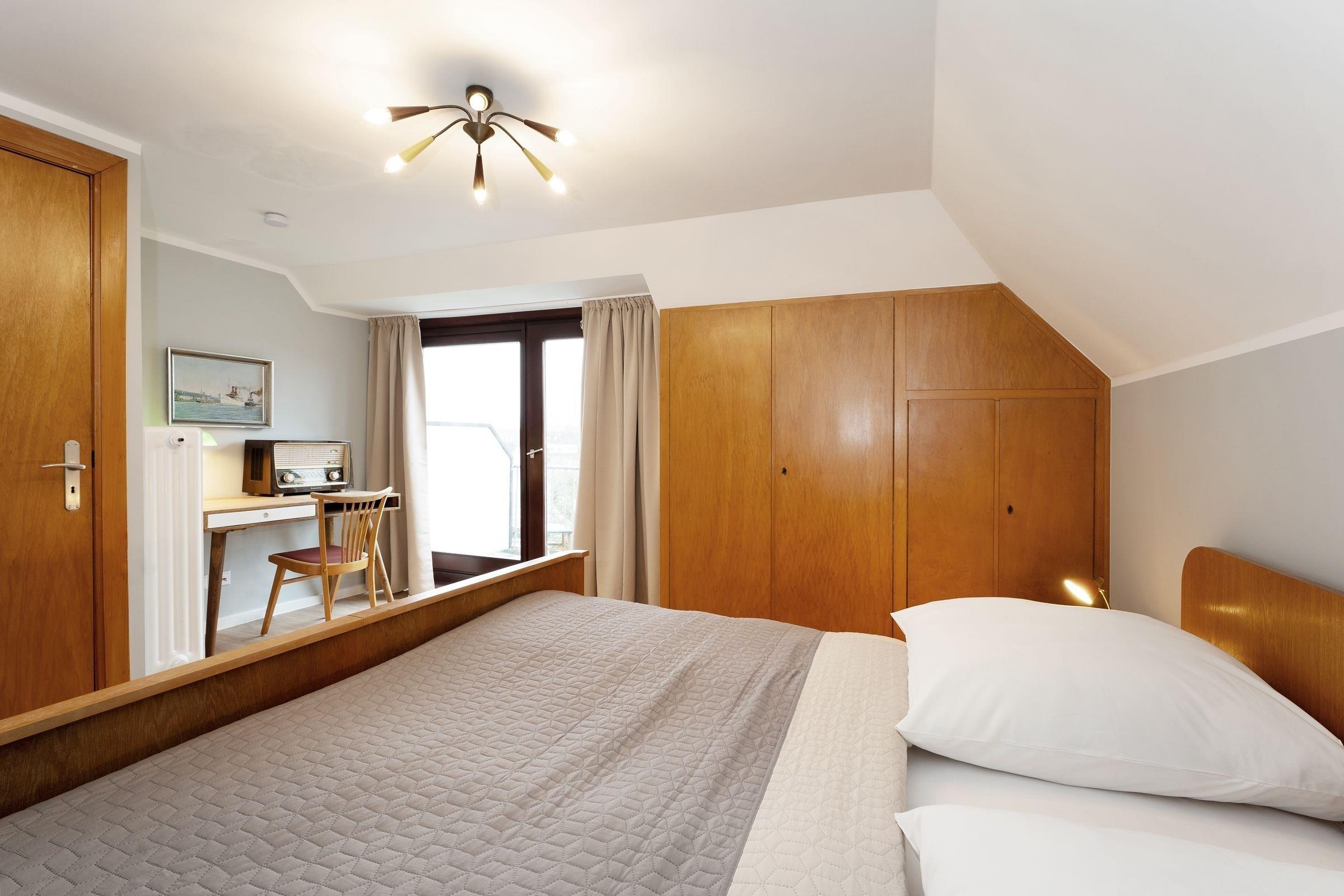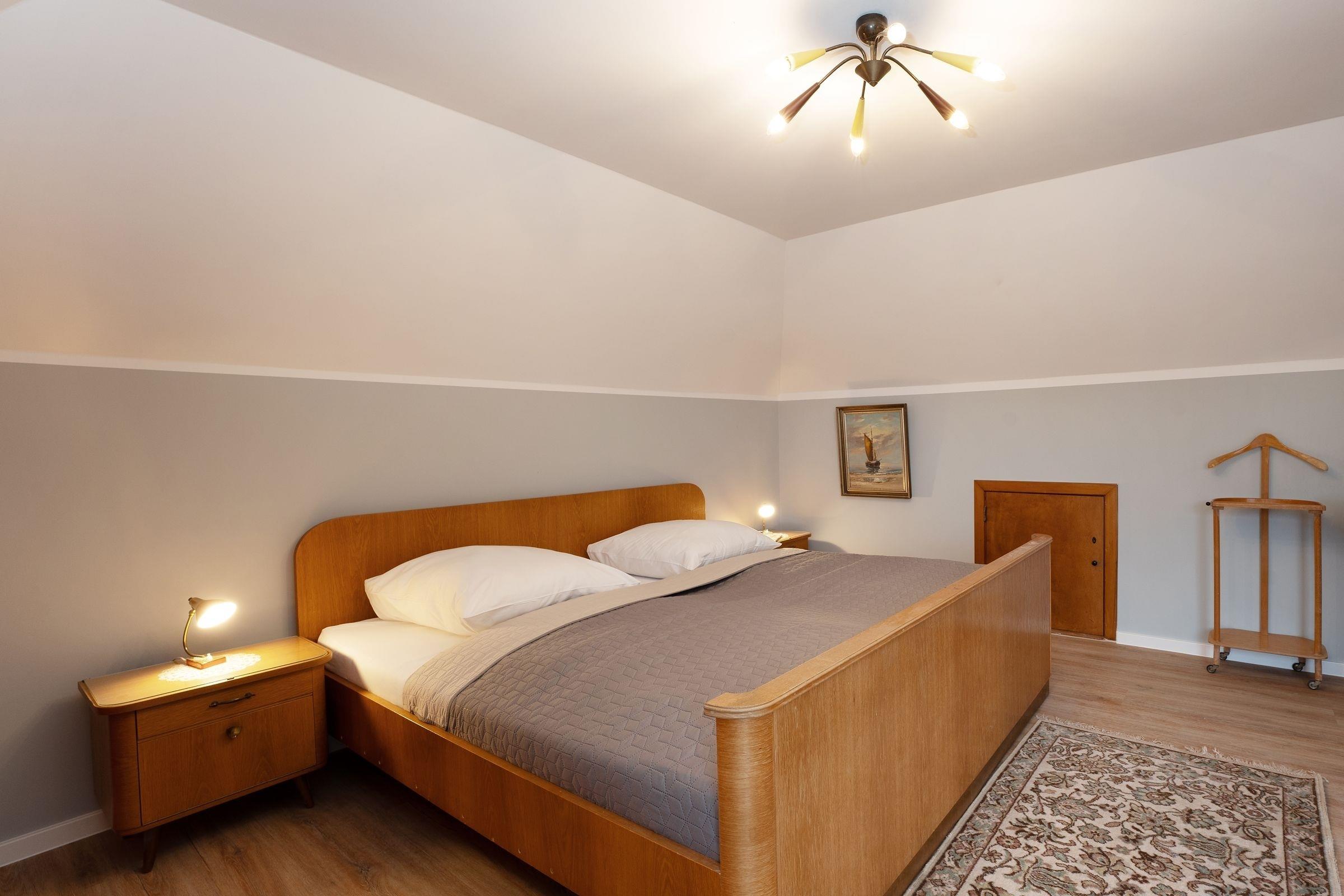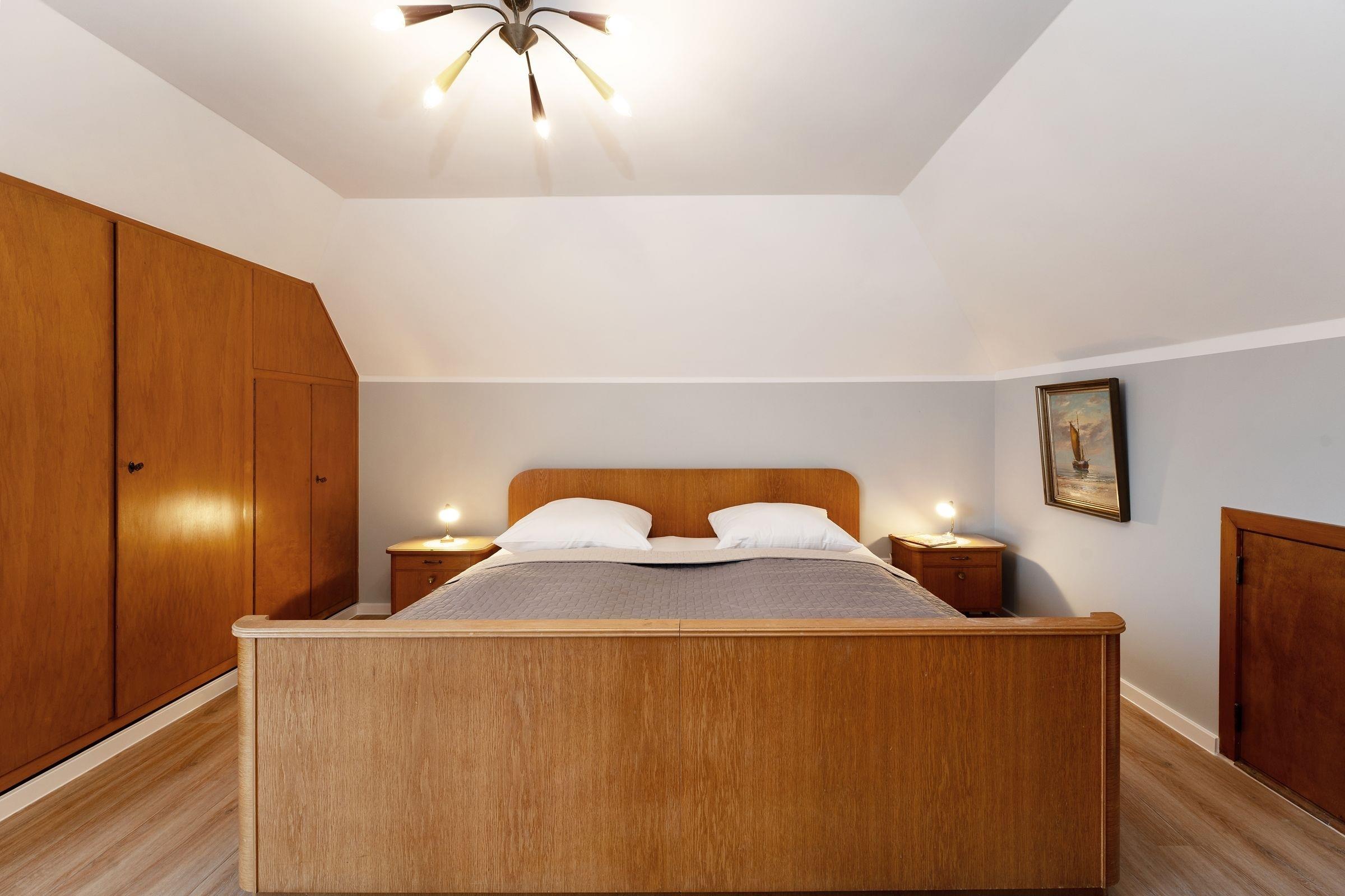 Schlafzimmer 1 (OG): 1 Doppelbett (2x 100x200 cm), Kleiderschrank, Waschbecken im Zimmer, Verdunkelung: Vorhänge, Platz für Babybett vorhanden