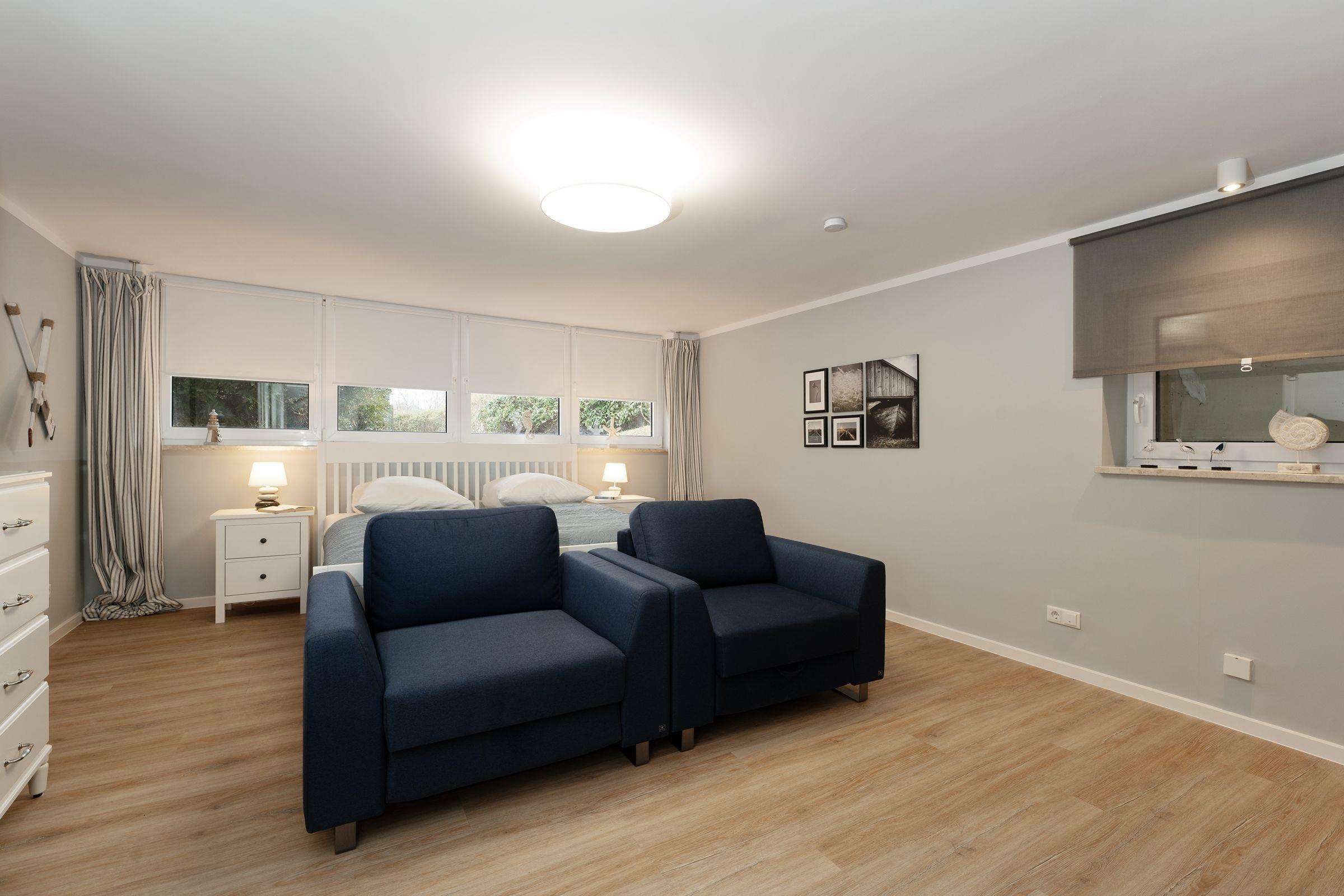 Schlafzimmer 3 (Souterrain): 1 Doppelbett (2x 90x200 cm) + 2 Schlafsessel (je 80x200 cm), Kleiderschrank, TV, Bad en suite, Verdunkelung: Vorhänge, Platz für Babybett vorhanden