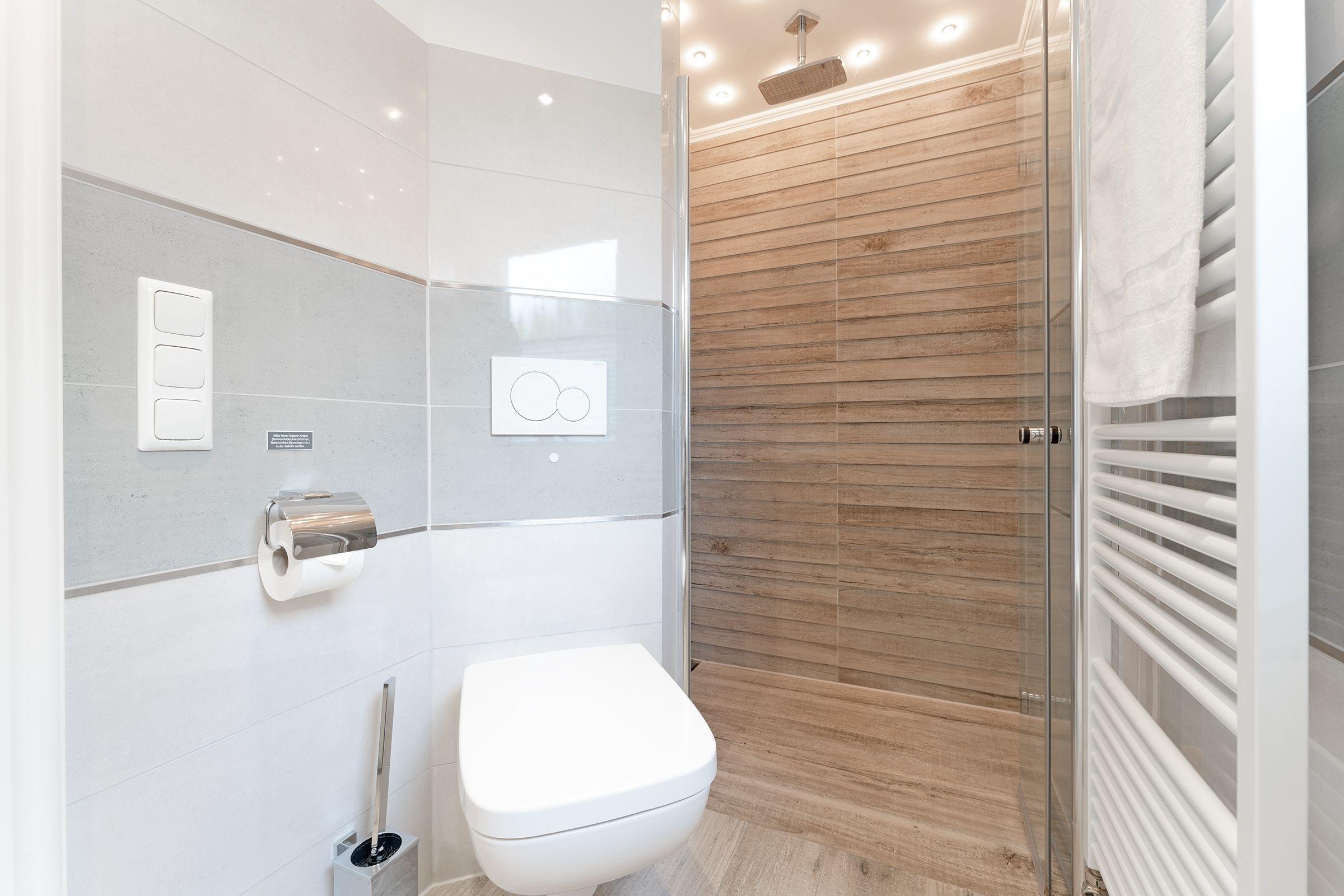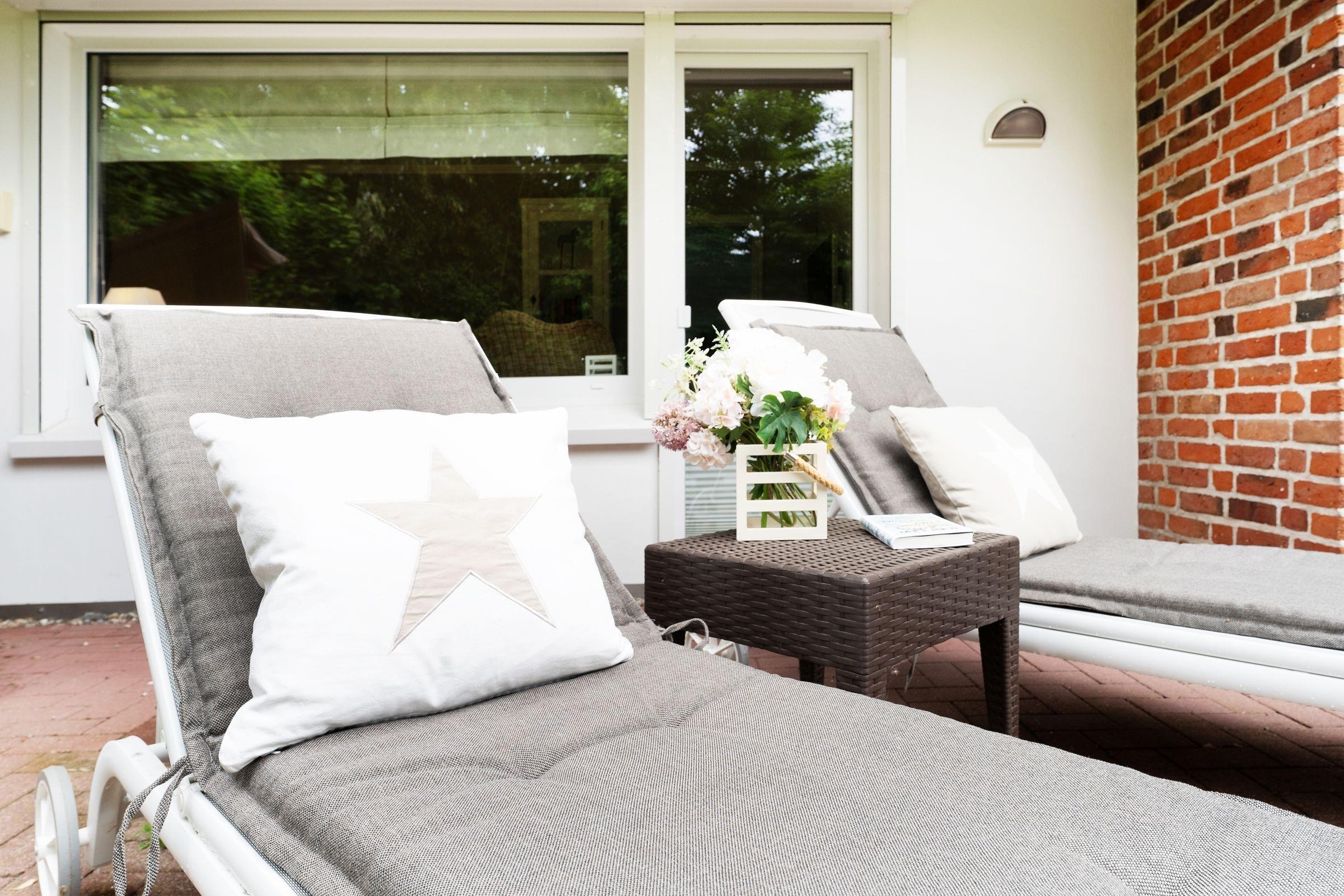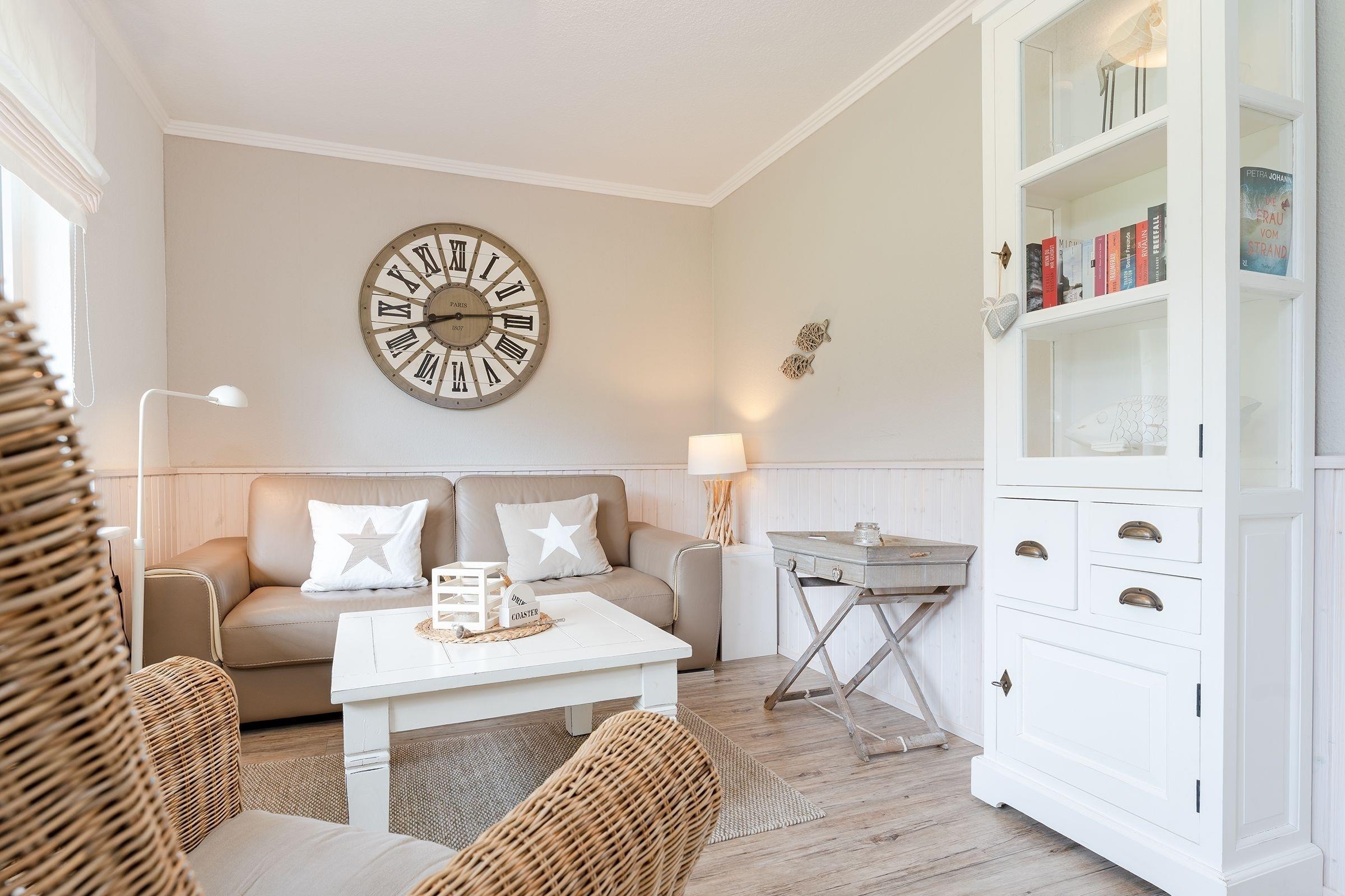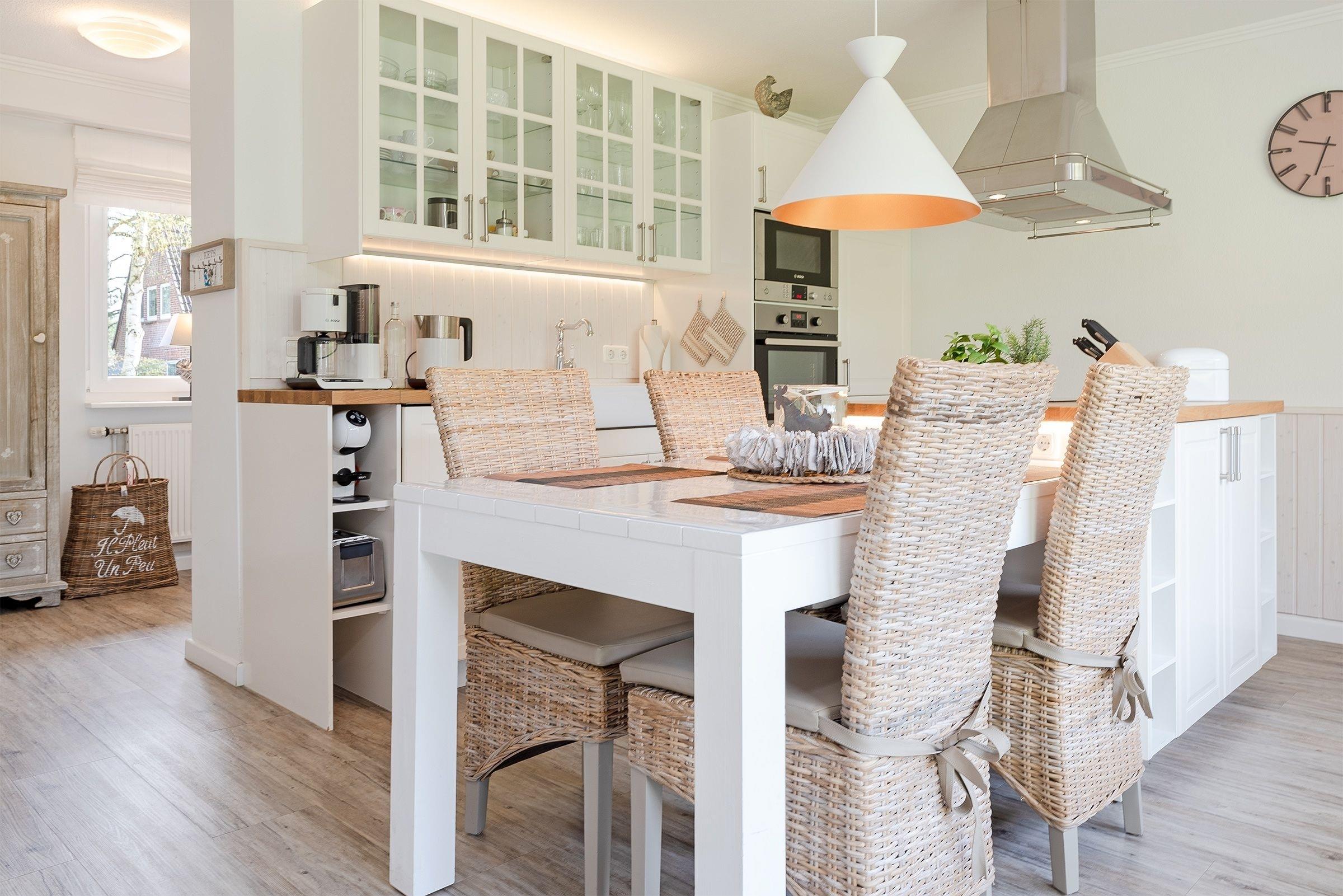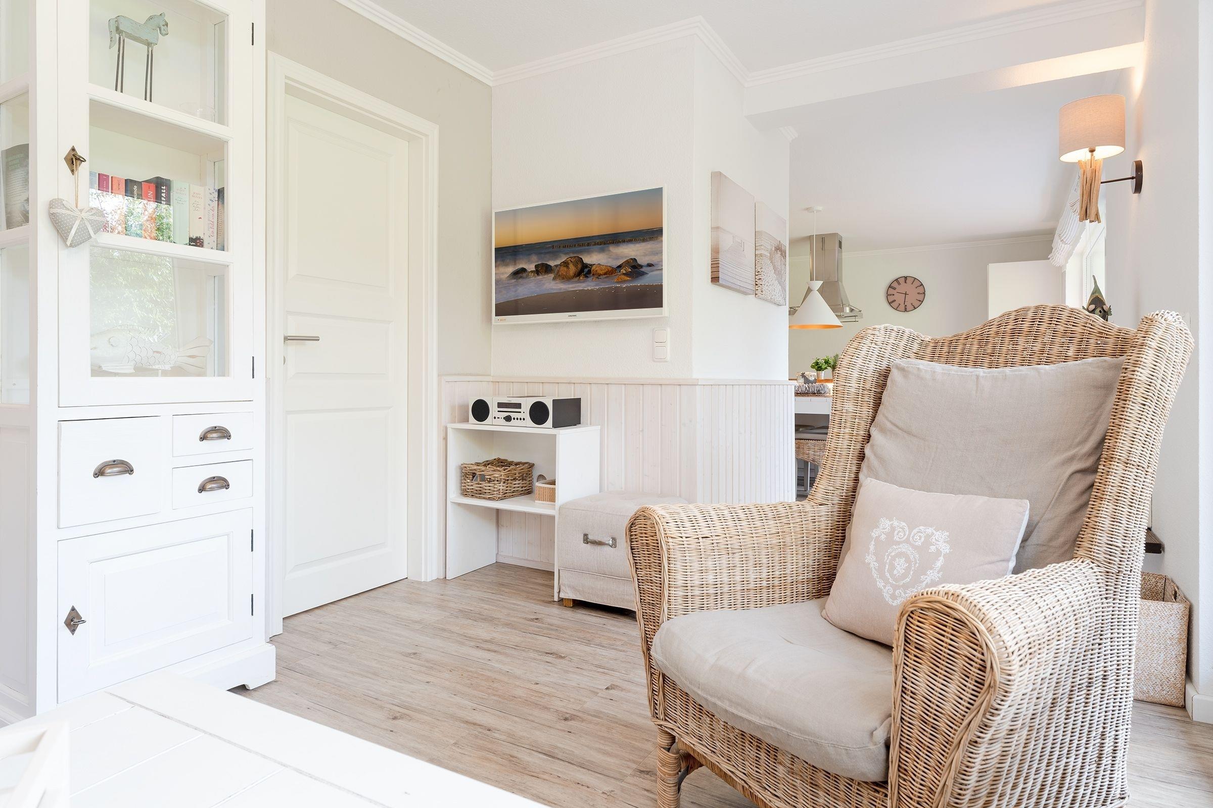 Eine wundervolle Auszeit mit viel Platz und vielen Extras verspricht die Wohnung Wellenreiter im Beachhouse-Stil. Im Wohnbereich können Sie es sich vor dem TV-Gerät (Video on Demand zur Selbstanmeldung) gemütlich machen. Ein Elektrokamin sorgt für eine wohlige Atmosphäre. Auch beim Zubereiten Ihrer Lieblingsspeisen können Sie sich von einem TV-Gerät unterhalten lassen. Die moderne Küche im Landhausstil mit vielen Annehmlichkeiten wie Induktionsherd, Espressomaschine (Dolce Gusto) und Geschirrspüler bringt jeden Hobby-Koch zum Lächeln. Alternativ können Sie im Garten grillen – oder sich auf den Sonnenliegen, im Strandkorb oder auf den Terrassen entspannen. Wie unter einem Sternenhimmel übernachten Sie im Doppelbett (160x200 cm) im Schlafzimmer. Das tageslichthelle Bad en suite punktet mit einer bodengleichen Dusche. Zudem gibt es ein Gäste-WC.