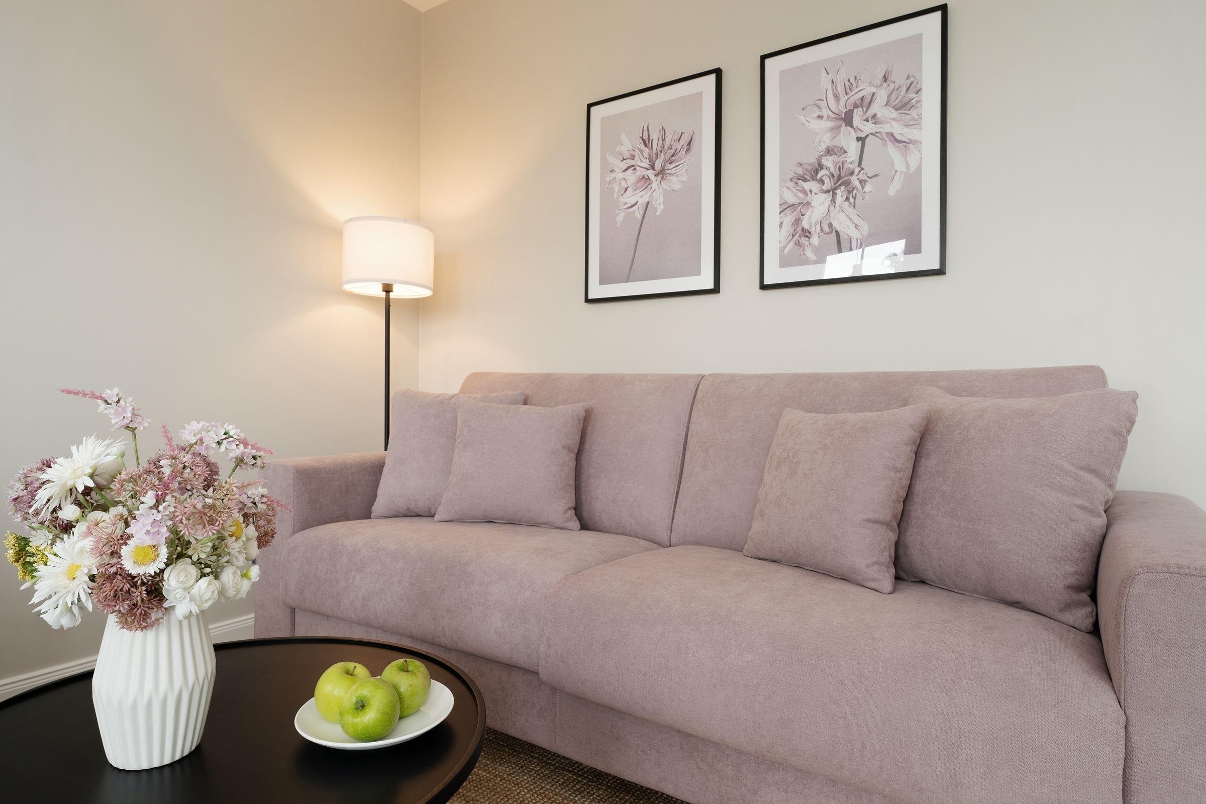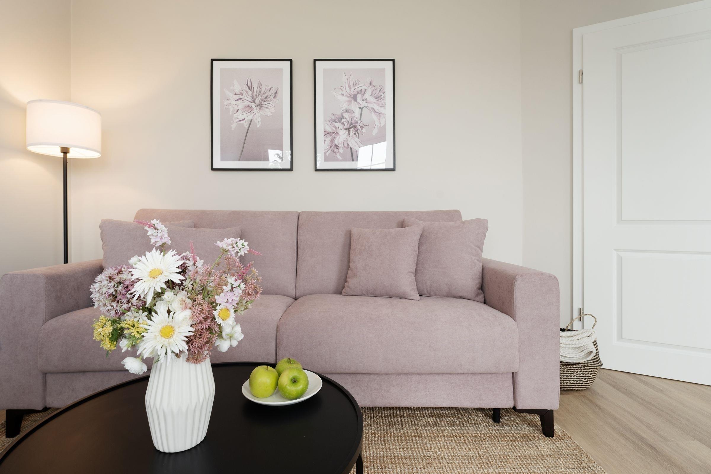 Wohnzimmer: Schlafsofa (160x197 cm), Verdunkelung: verdunkelnde Plissees, TV, Platz für Babybett vorhanden