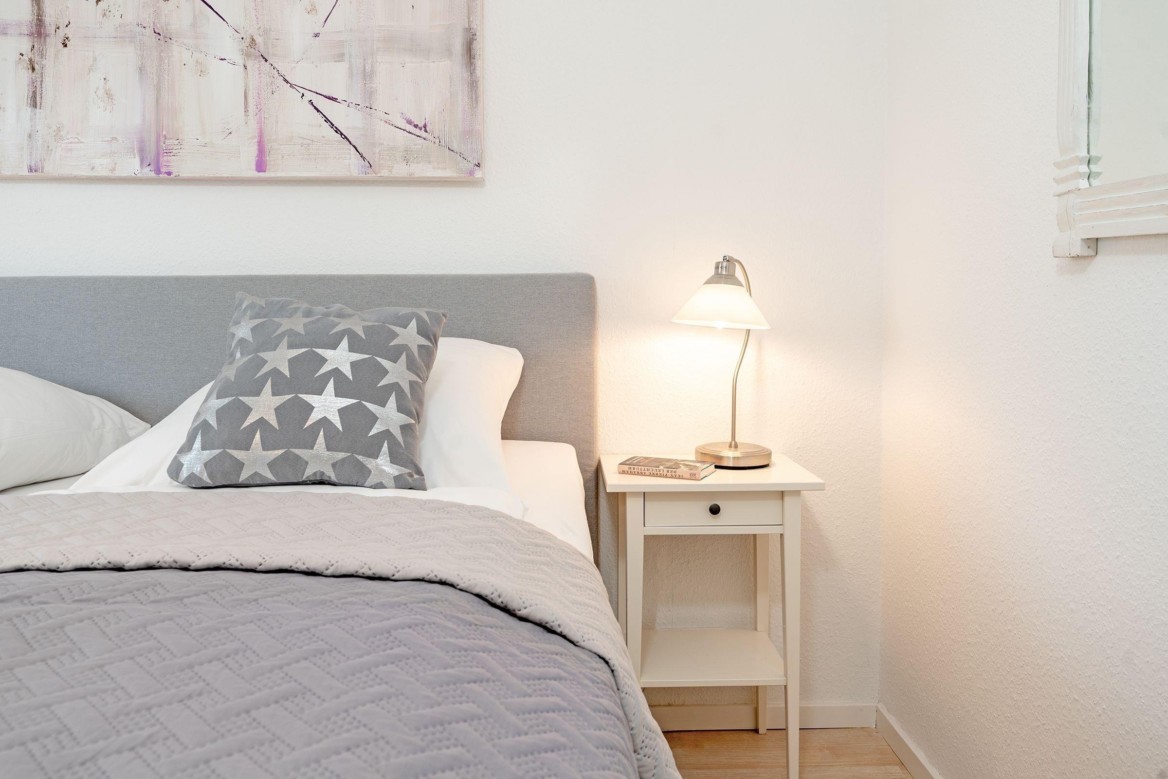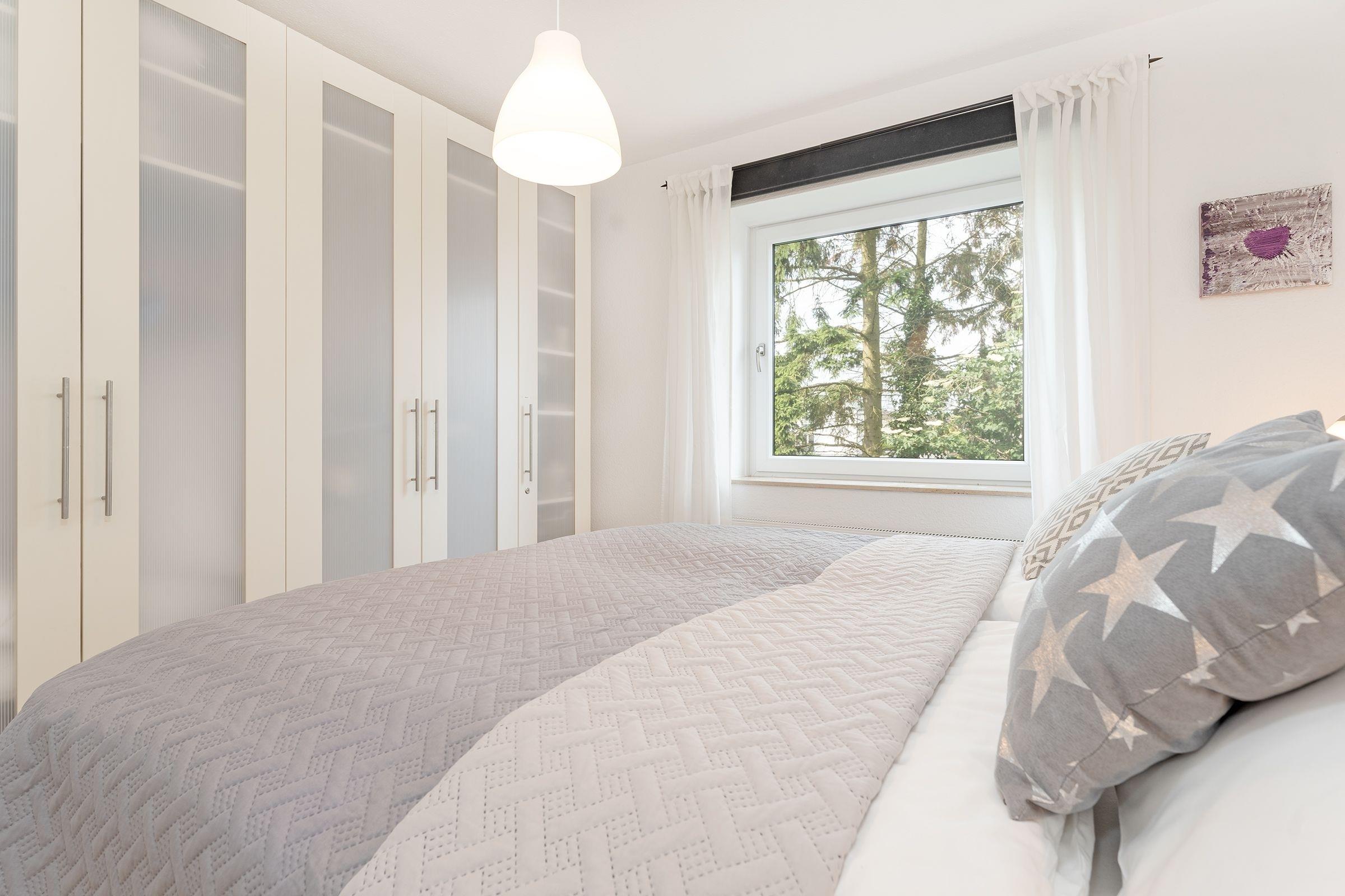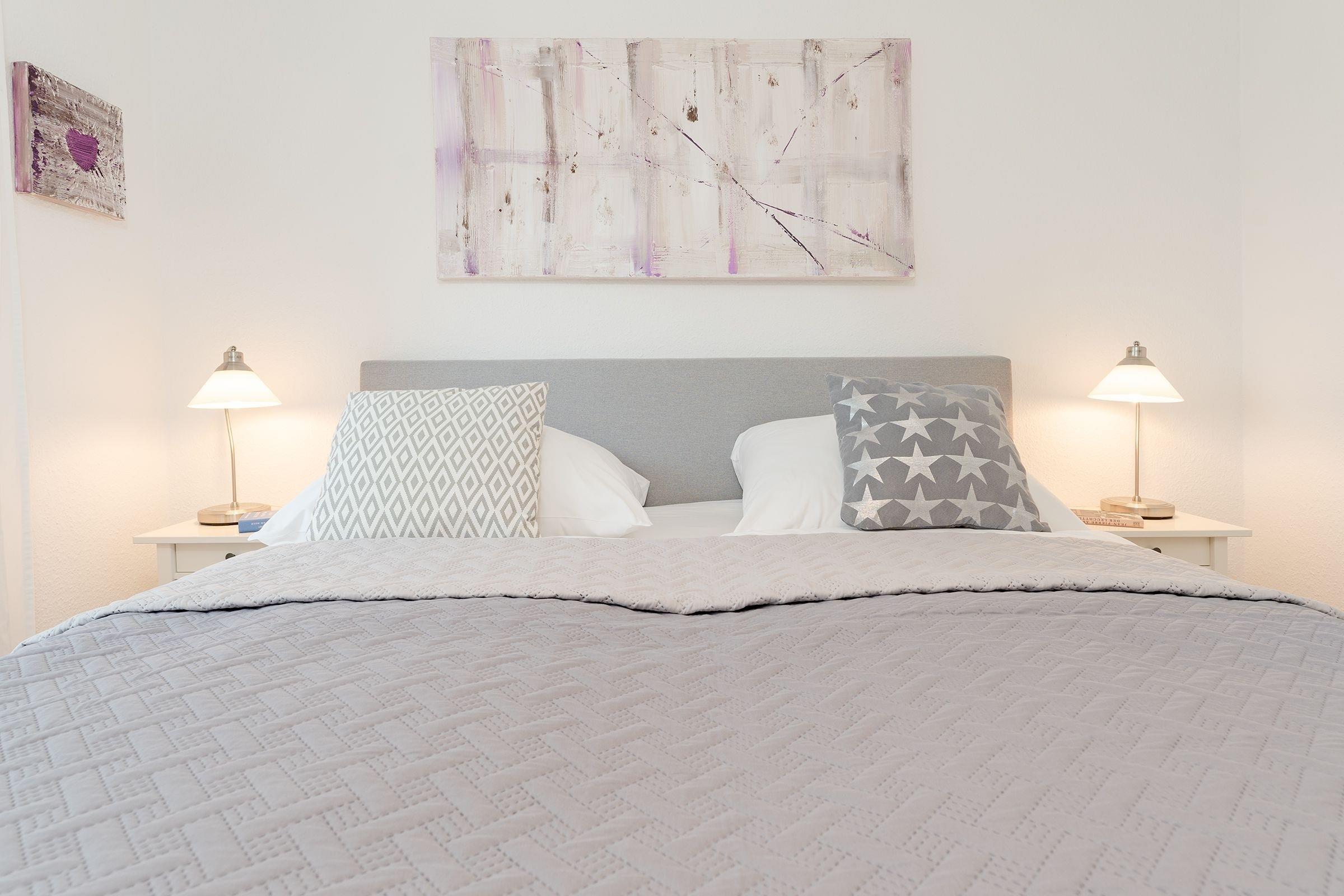 Schlafzimmer: 1 Doppel-Boxspringbett (180x200 cm), Kleiderschrank, Verdunkelung: Rollo, Platz für Babybett