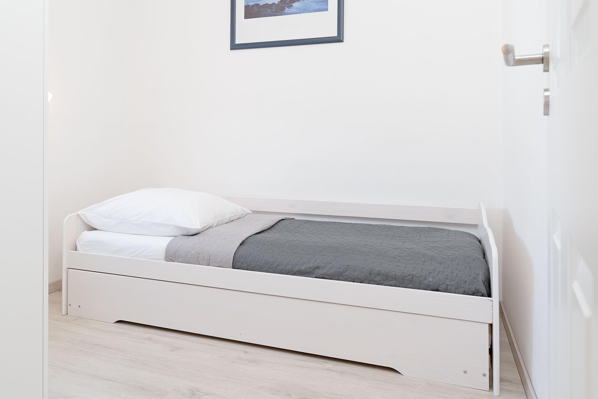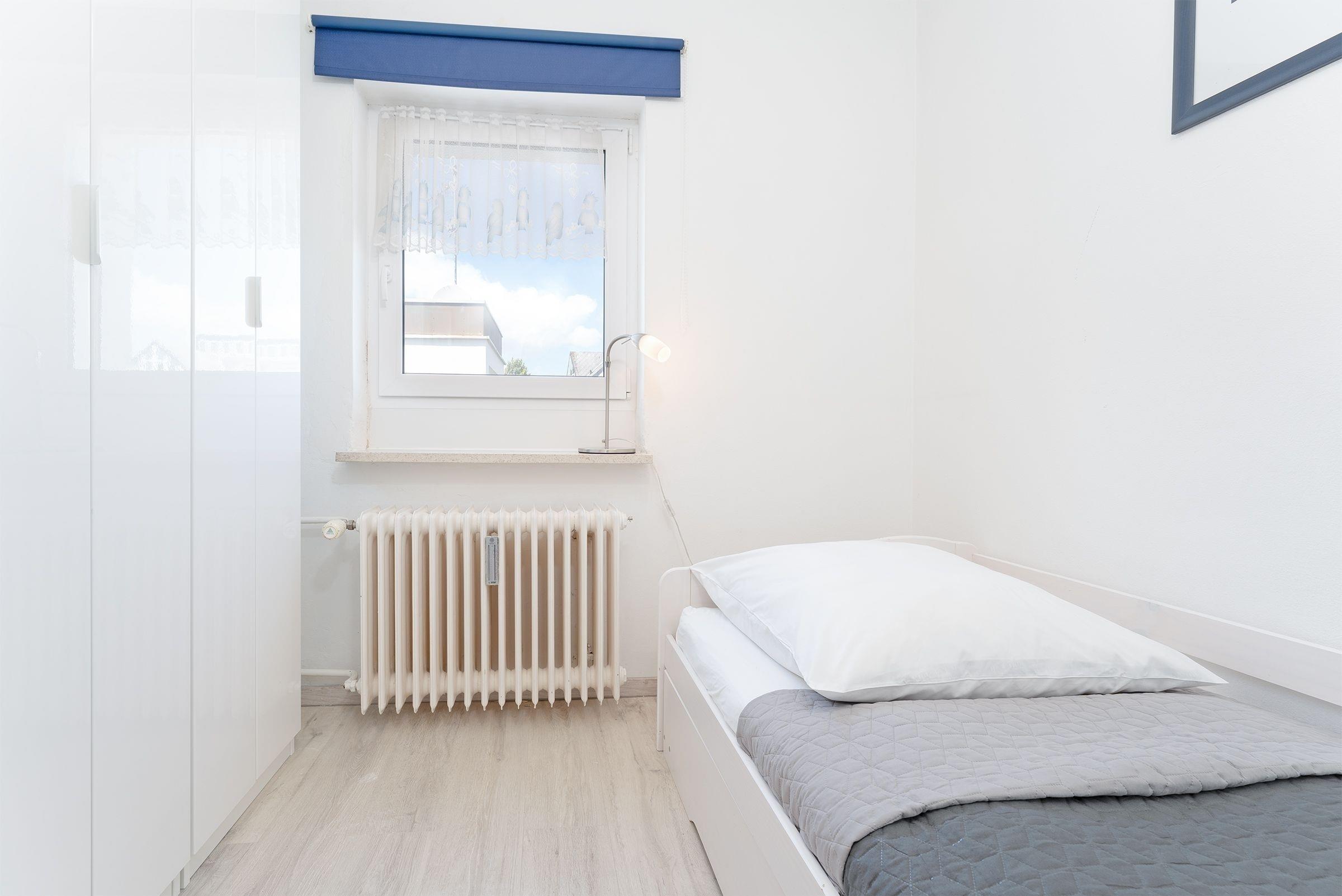 Schlafzimmer: 1 Einzelbett (90x200 cm), Kleiderschrank, Verdunkelungsrollo, kein Platz für Babybett vorhanden