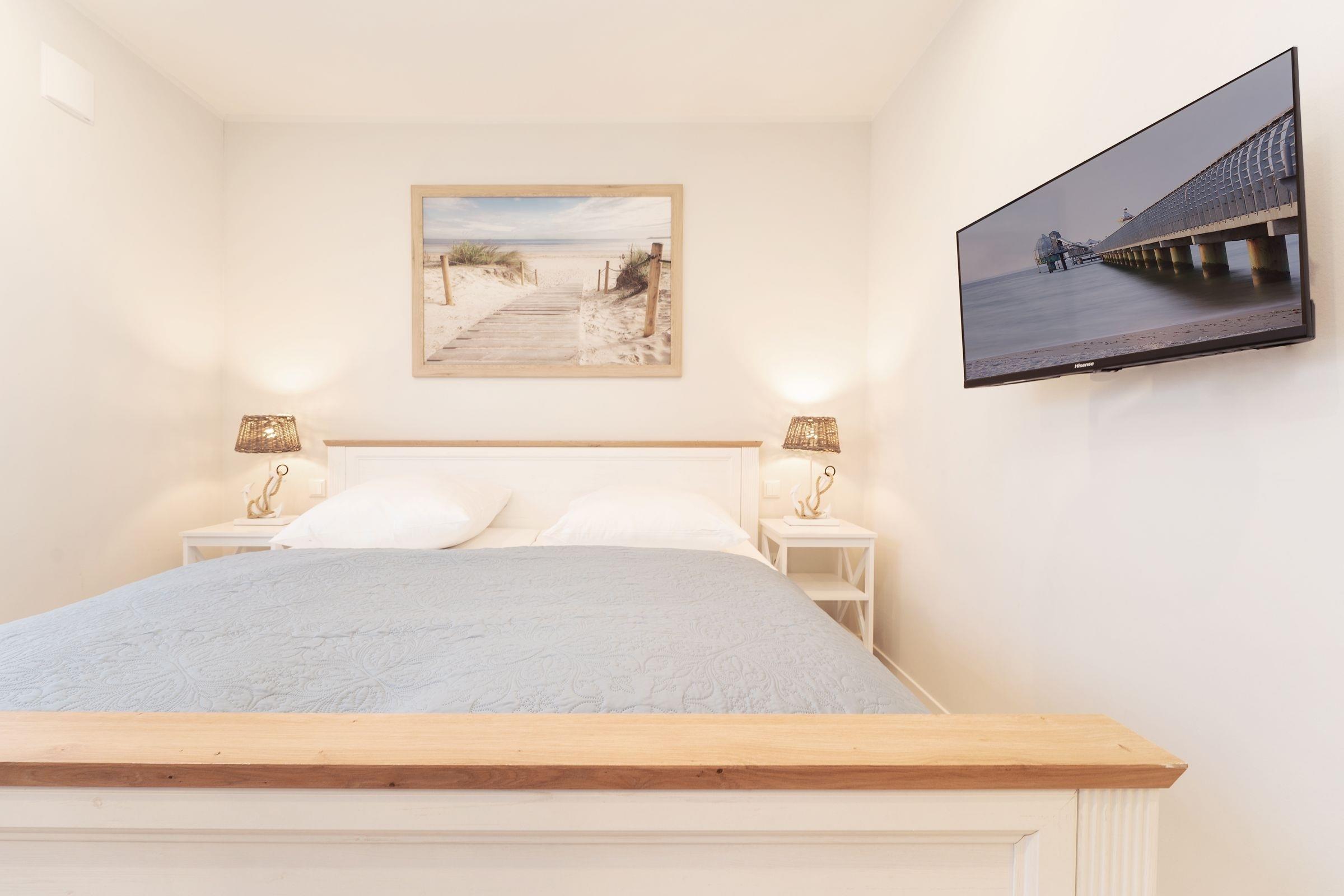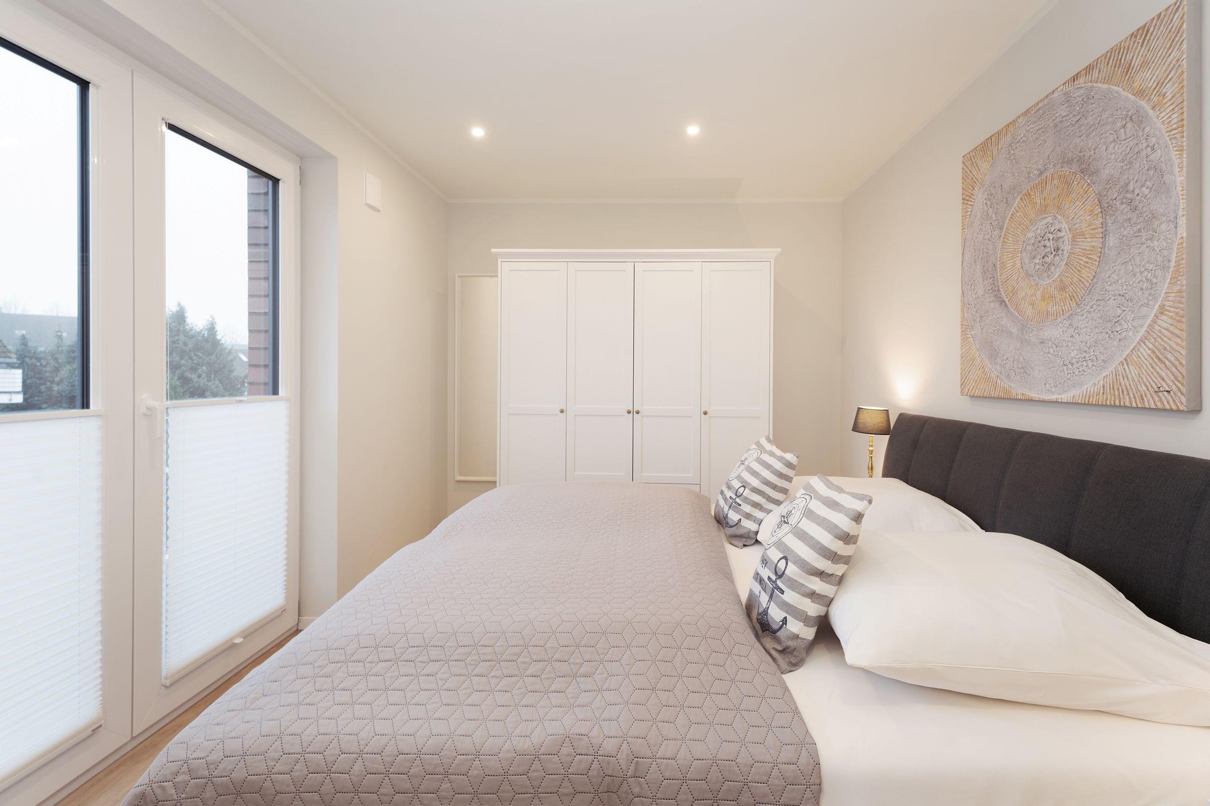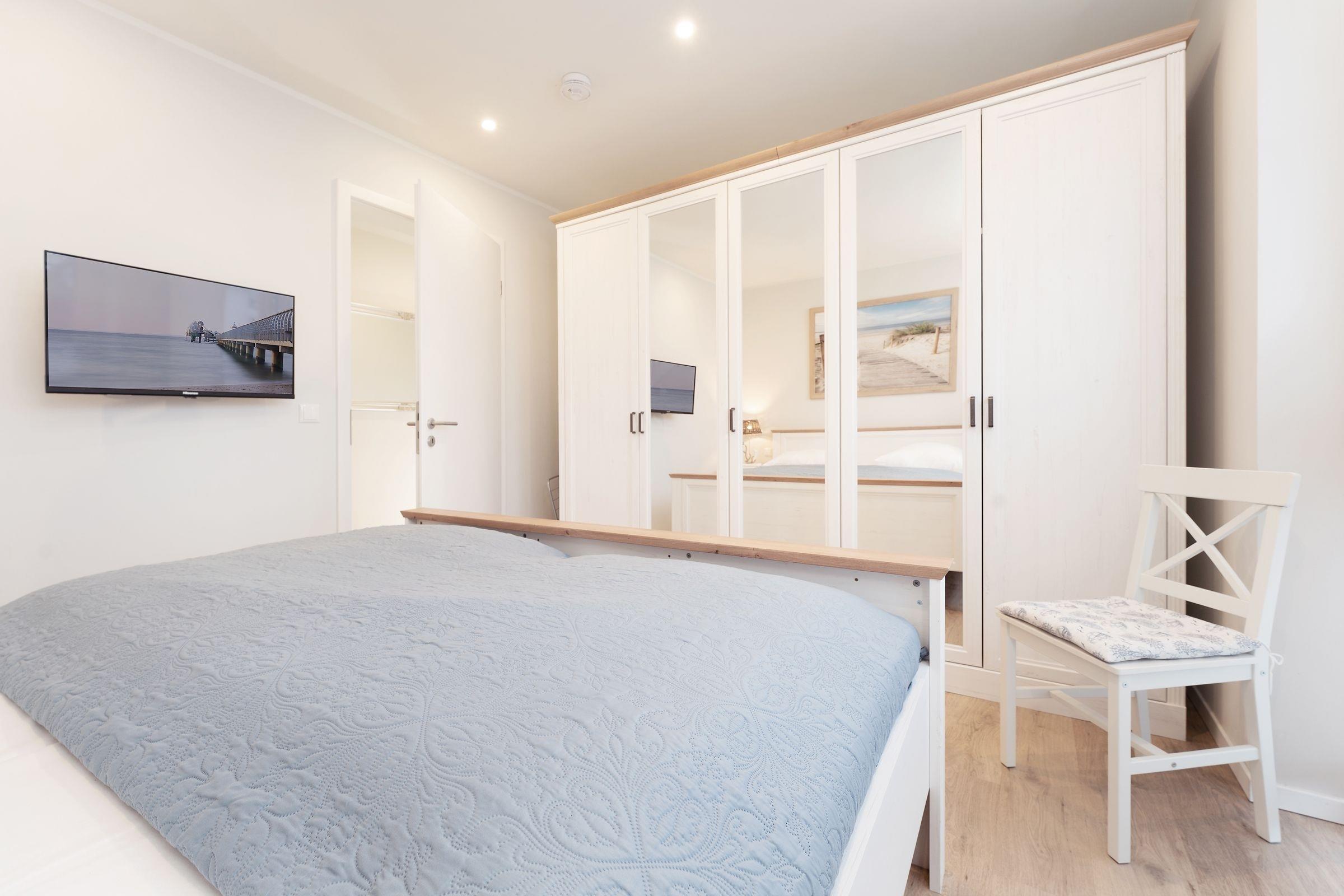 Schlafzimmer 1: 1 Doppelboxspringbett (180x200 cm), TV, Kleiderschrank, Verdunkelung: Rollläden, Platz für ein Babybett vorhanden