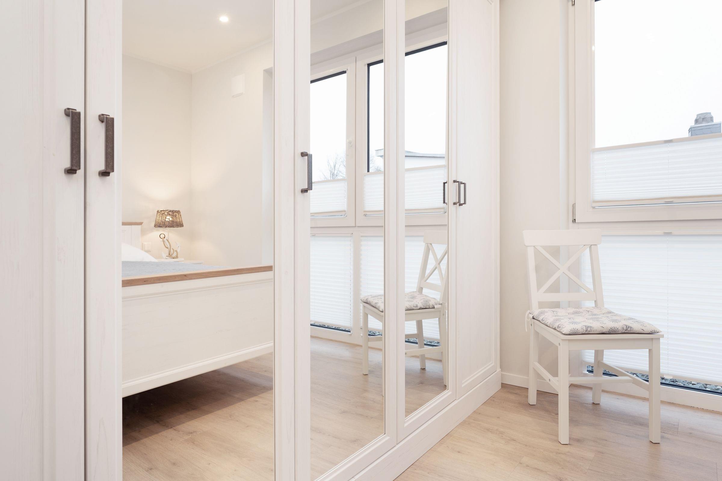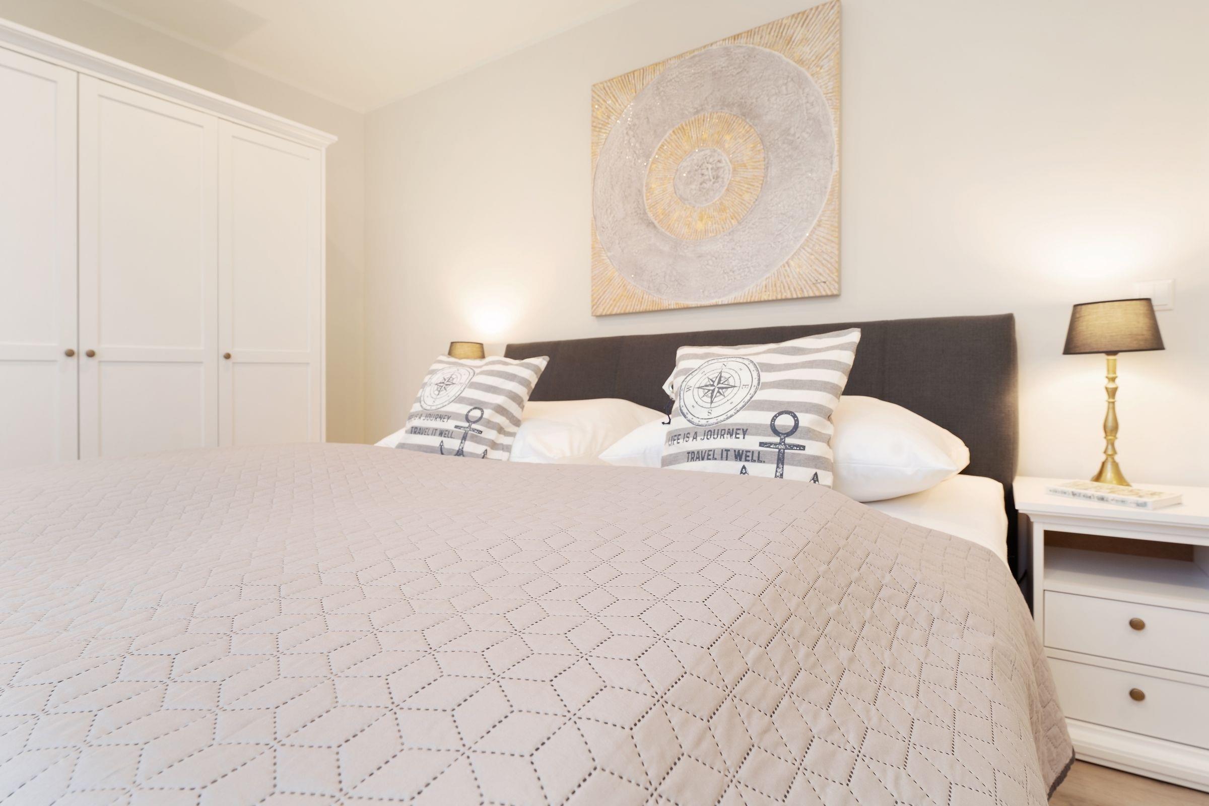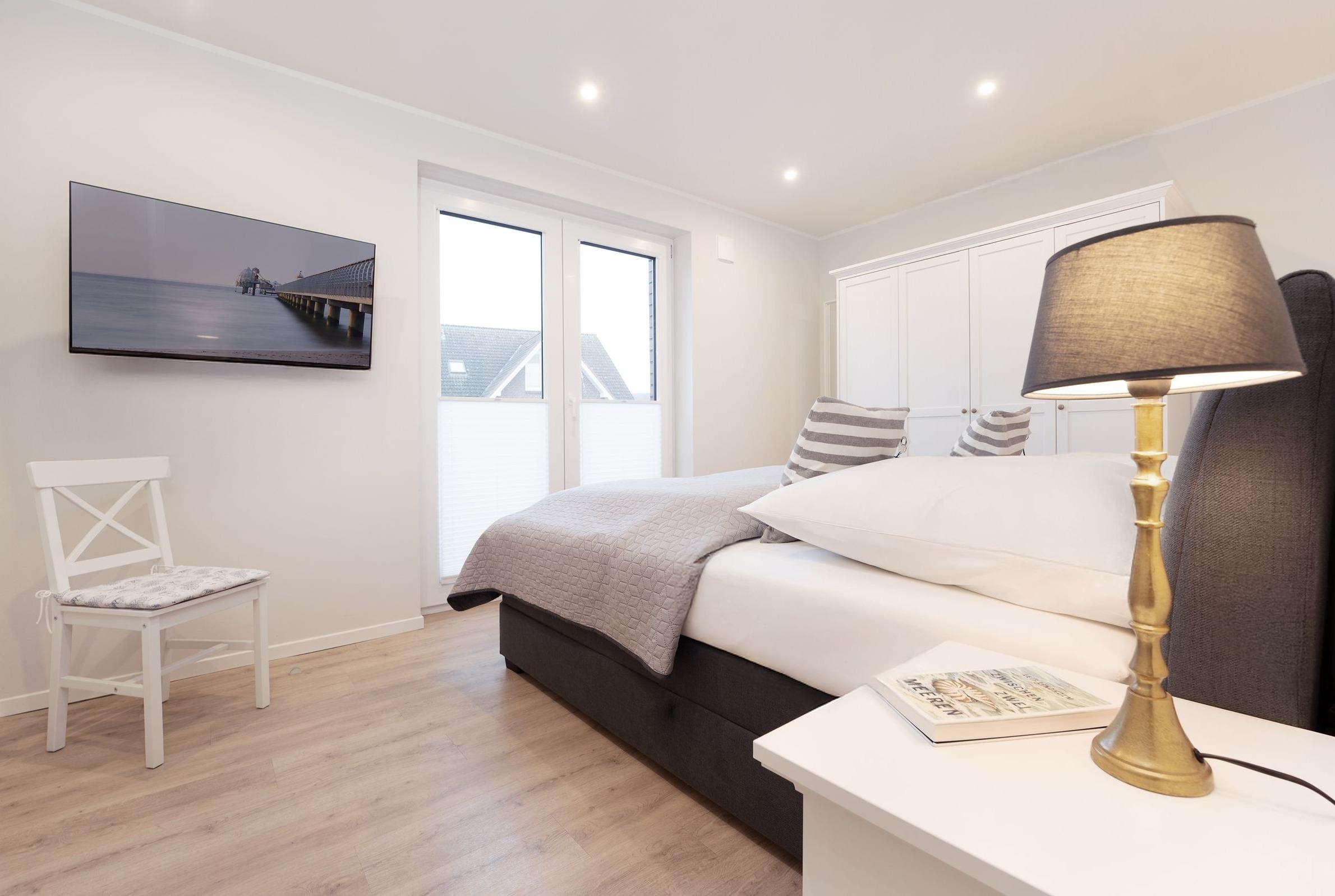 Schlafzimmer 1: 1 Doppelboxspringbett (180x200 cm), TV, Kleiderschrank, Verdunkelung: Rollläden, Platz für ein Babybett vorhanden