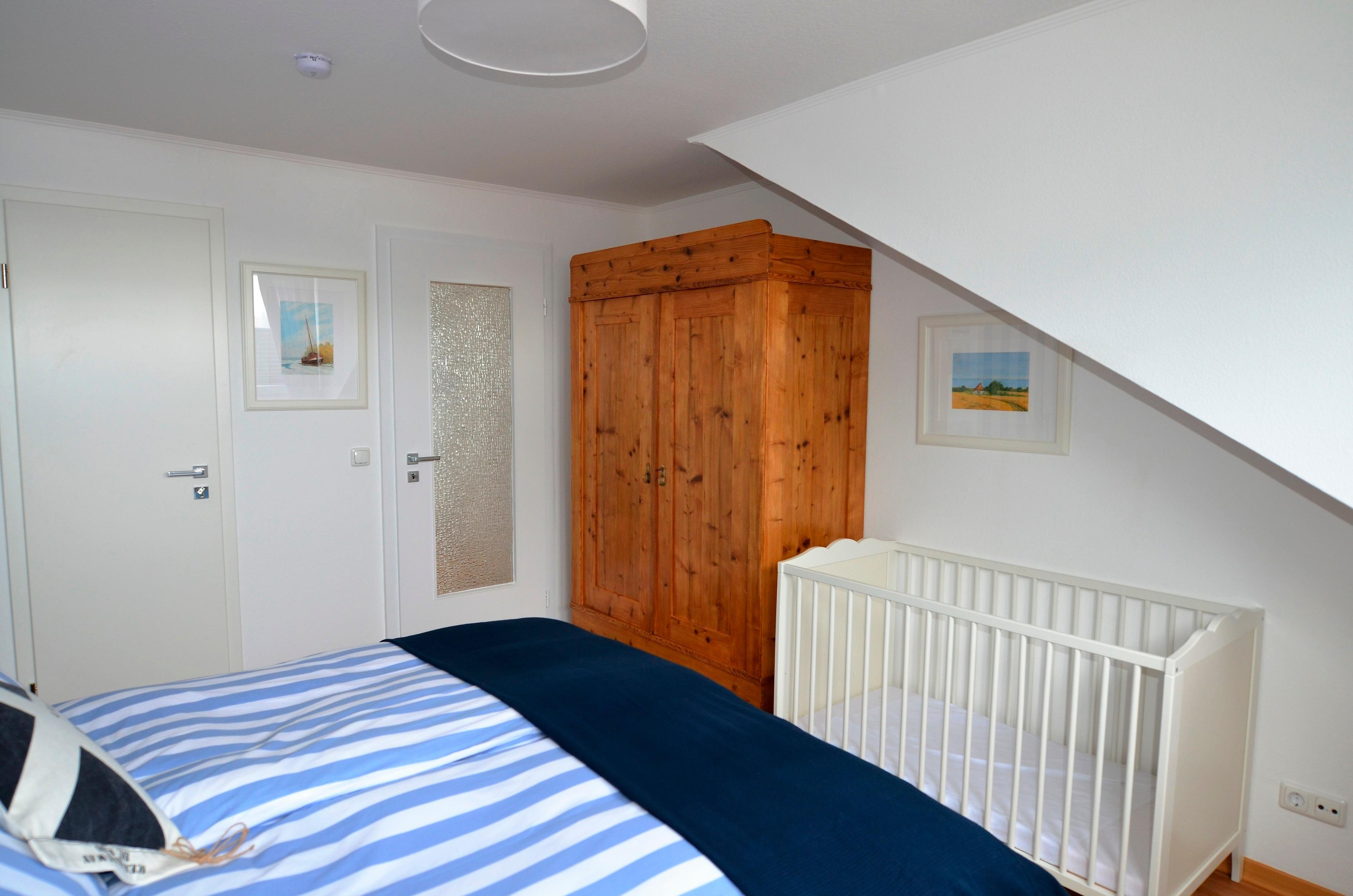 Über eine weiß lackierte Treppe geht es nach oben in den Schlafbereich. Das großzügige Elternschlafzimmer verfügt über ein Doppelbett 1,80 x 2,00 m mit neuen, komfortablen Matratzen und einen antiken Weichholzkleiderschrank. Ein Babyreisebett kann hier problemlos gestellt werden. Die beiden Fenster verfügen über Verdunkelungsplissees und ein Fenster über eine Insektenschutzgaze.