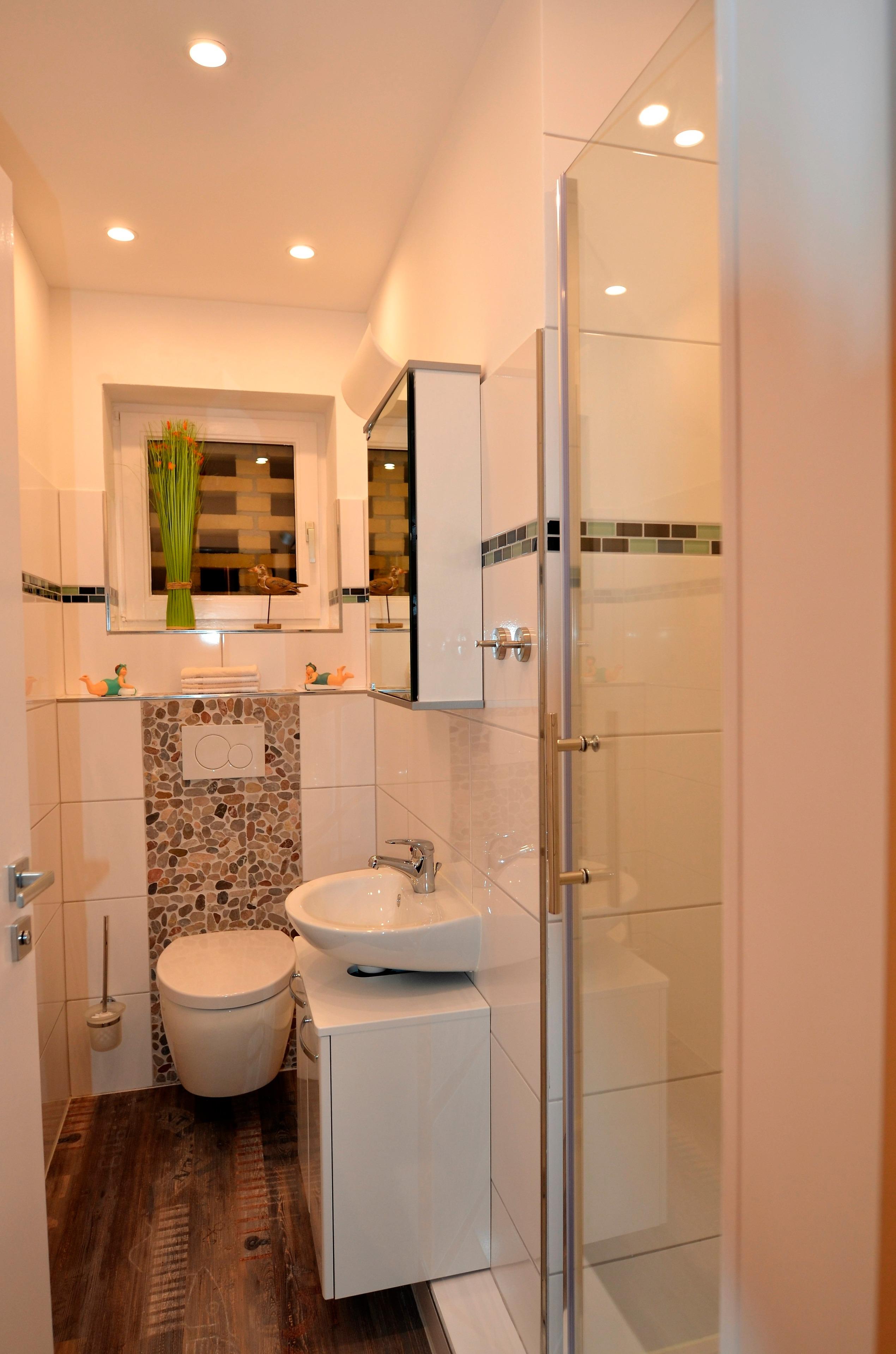 Über den Flur mit seiner markanten schwarz-weißen Streifentapete erreichen Sie das komplett neu gestaltete kleine Duschbad mit WC, kleinem Waschtisch, Spiegelschrank und Handtuchheizkörper.