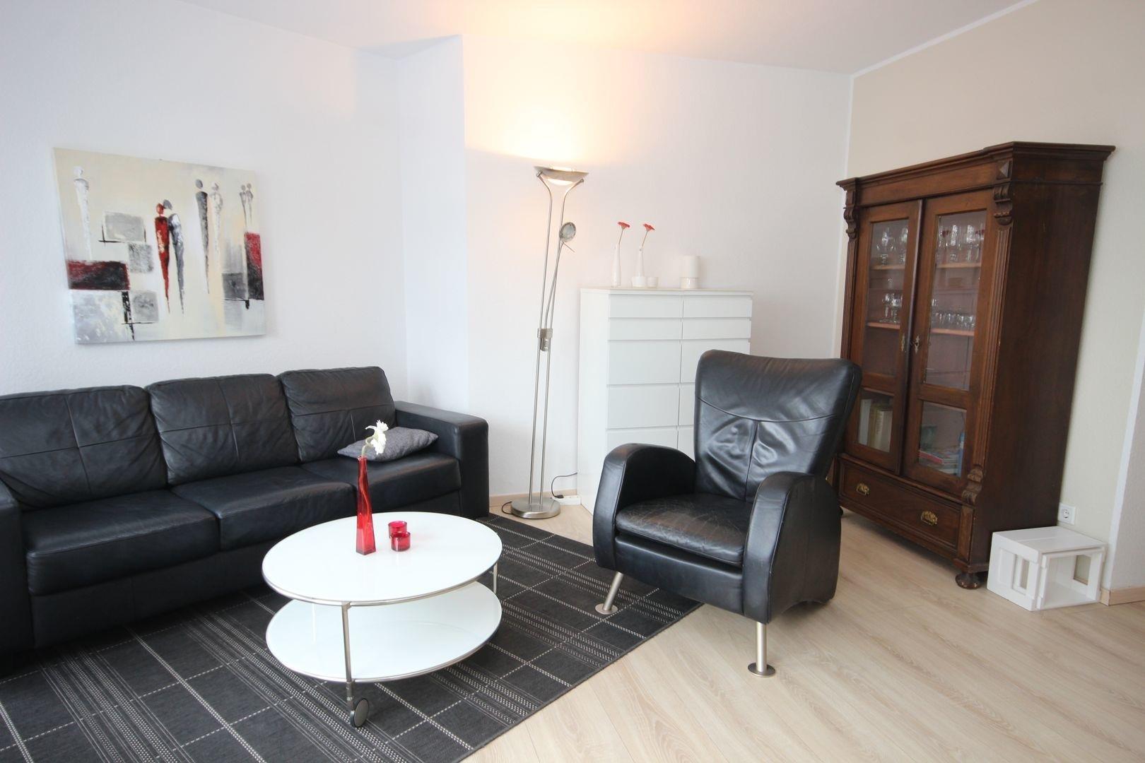 Das geräumige Wohnzimmer ist möbliert mit Couchgarnitur, Esstisch für 4 Personen, TV, Radio, CD- + DVD-Player, Anrichte und hat Zugang zur möblierten Loggia mit seitlichem Ostseeblick.