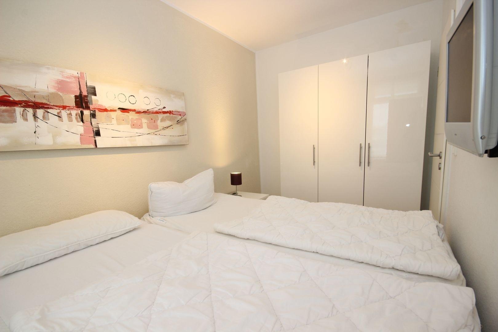 Das Schlafzimmer ist mit einem Ehebett & Kleiderschrank und Wand-TV ausgestattet.