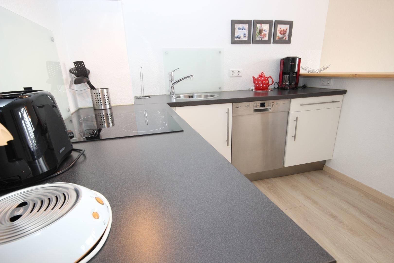 Die offene Küche ist mit Geschirrspüler, Backofen mit Cerankochfeld und Dunstabzugshaube, Kühlschrank und allen üblichen Küchengeräten gut ausgestattet.