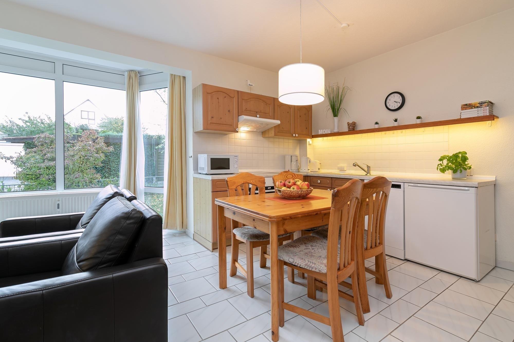 Es erwartet Sie ein tageslichterfülltes Wohnzimmer mit integrierter voll ausgestatteter Einbauküche und angrenzendem Essbereich für max. 2 Erwachsene und 2 Kinder.