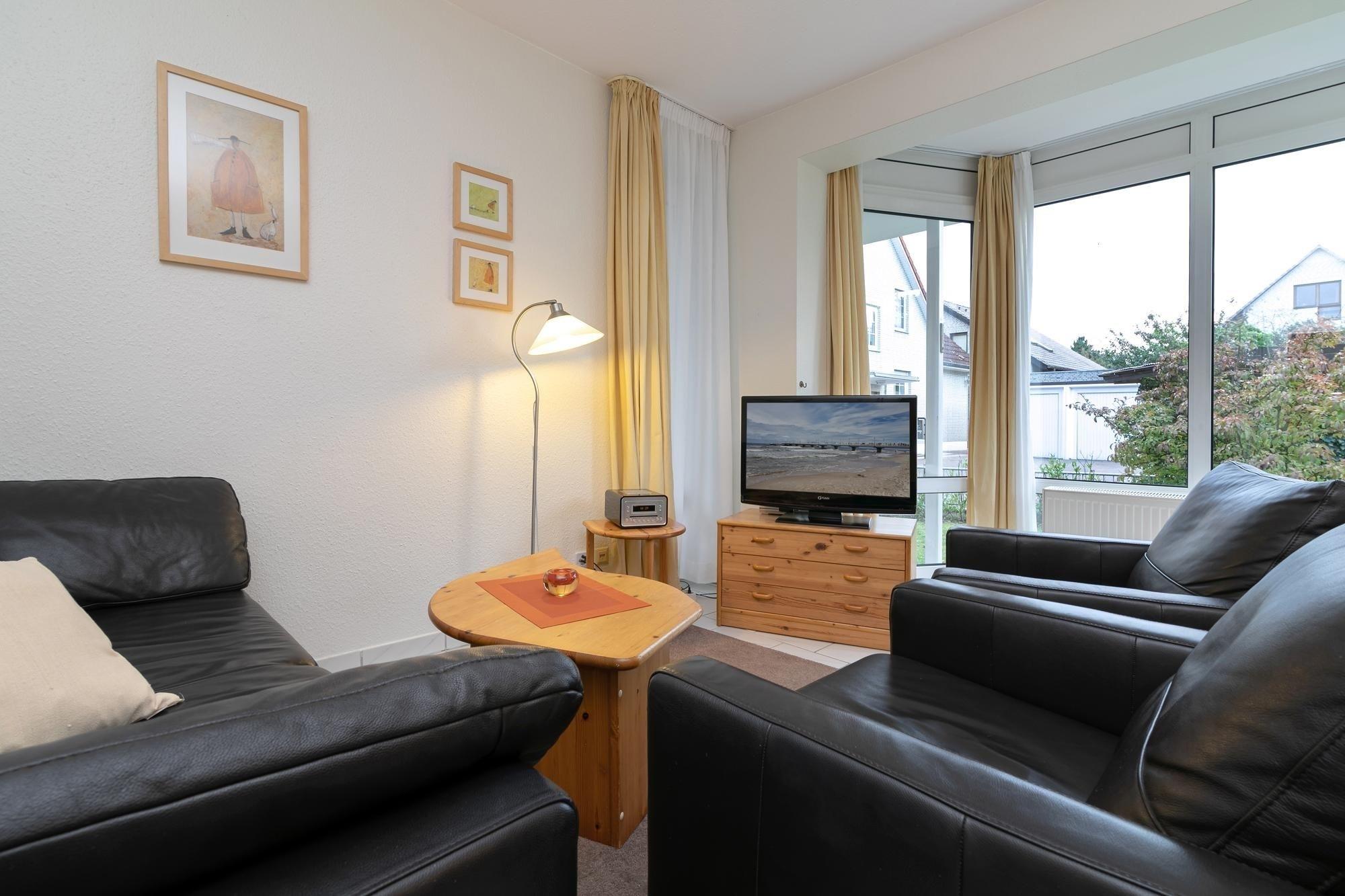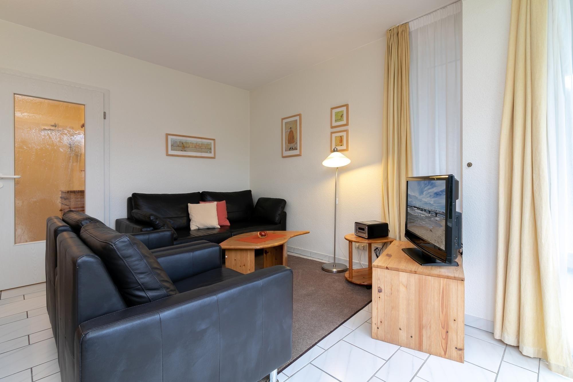 Eine hochwertige Schlafcouch (130x210 cm) und zwei Sessel bieten Platz und Gemütlichkeit für entspannte Fernsehabende. Vom Wohnbereich aus gelangen Sie auf Ihre Terrasse mit Südwestausrichtung, Sonne von mittags bis abends. Genießen Sie hier Ihren Kaffee am Morgen oder schmökern Sie in einem spannenden Buch, während Sie auf einer der Sonnenliegen relaxen. Die Wohnung verfügt über einen kostenlosen WLAN-Anschluss, so dass Sie auch im Urlaub mit Ihren Lieben daheim in Kontakt bleiben können. Über das Radio und den CD-Player können Sie die entspannte Urlaubsstimmung musikalisch untermalen. Im Schlafzimmer befinden sich ein komfortables Doppelbett (2x 90x200 cm), sowie ein geräumiger Kleiderschrank.