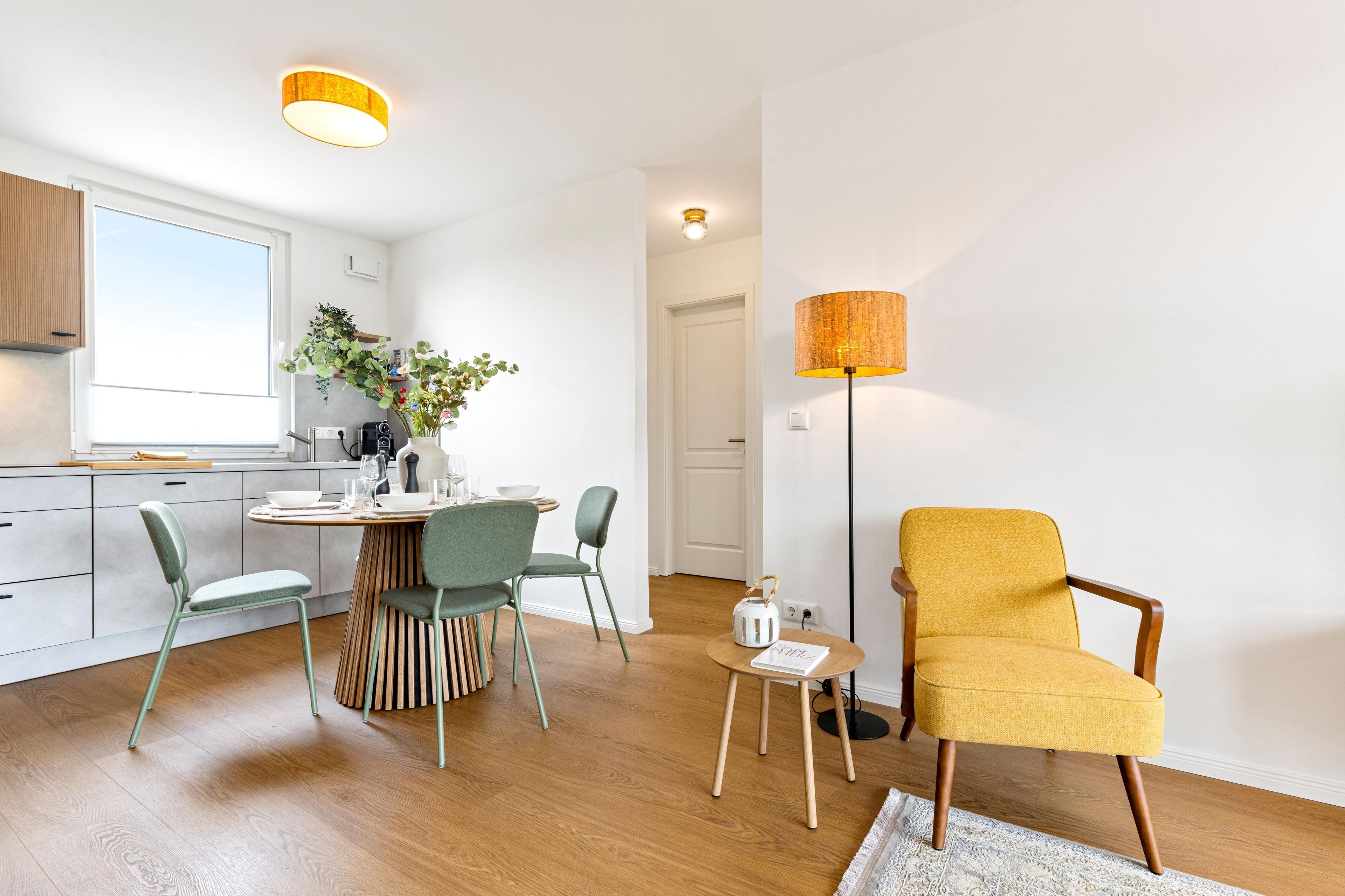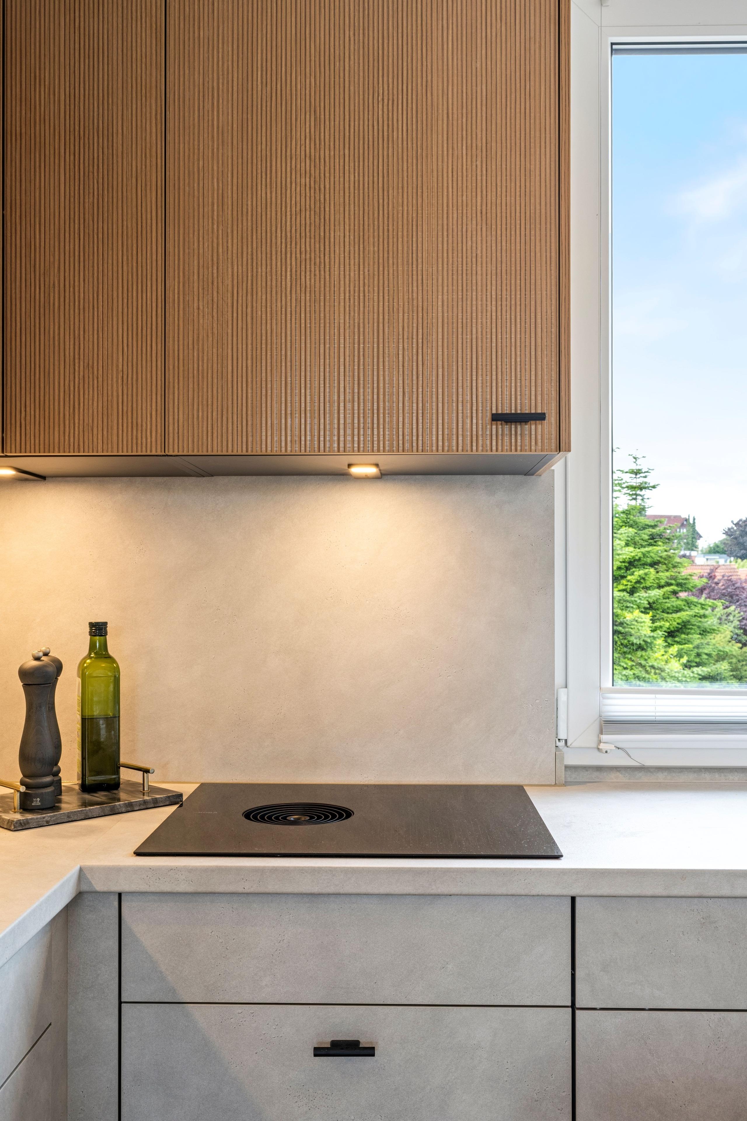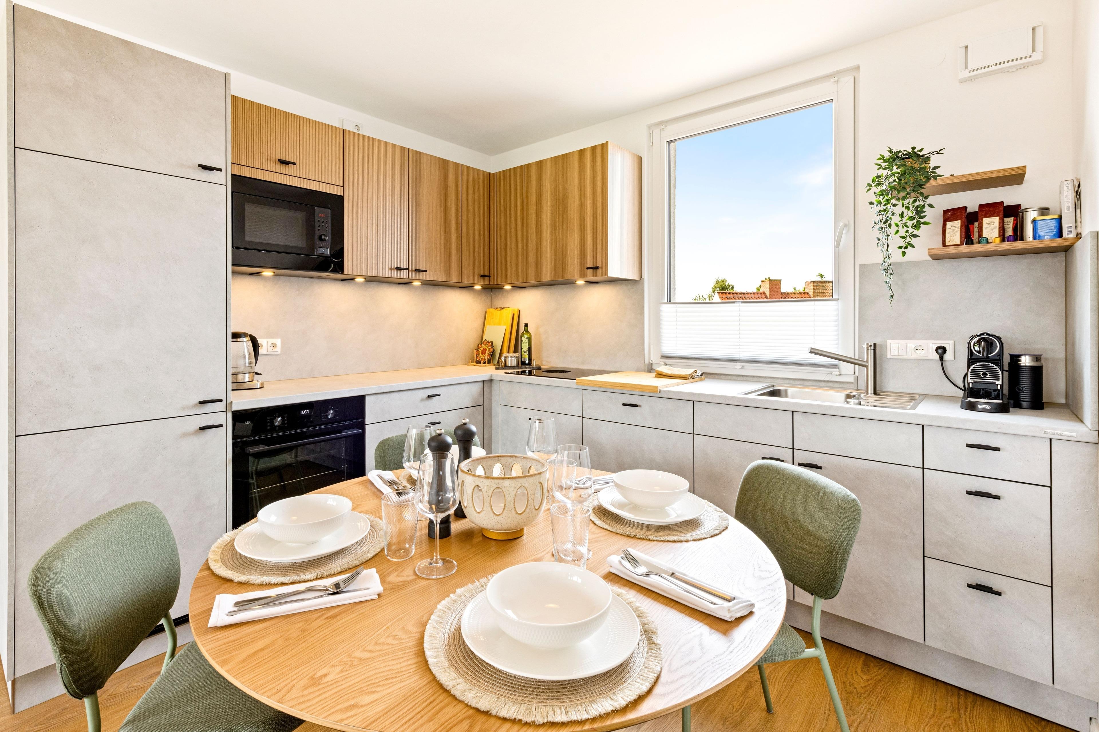 Die stilvolle Einrichtung, die im Juni 2025 fertiggestellt wurde, umfasst eine moderne Küche mit Induktionsherdplatten, Spülmaschine und Kühl-Gefrierkombination, einen Backofen, sowie eine Mikrowelle.