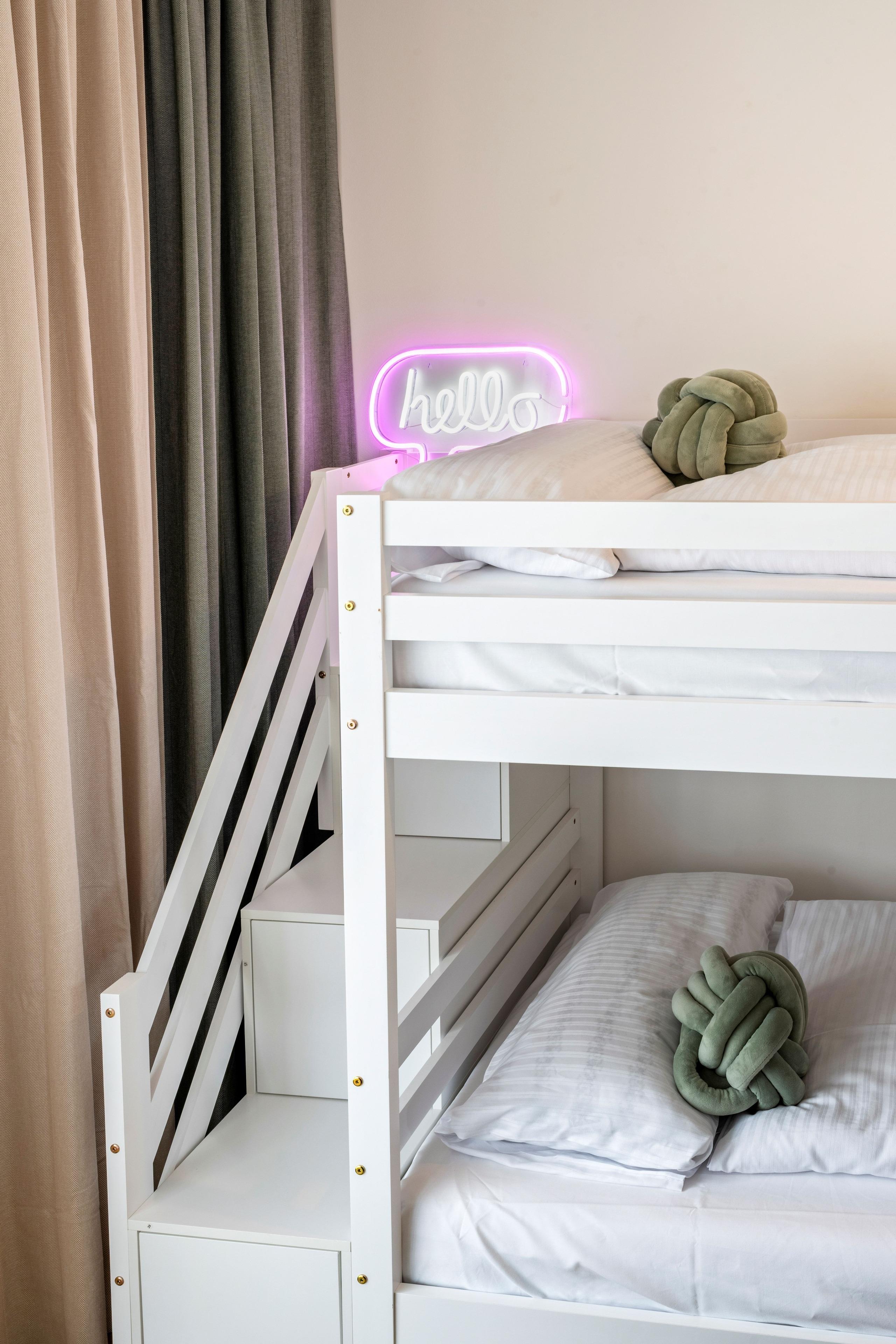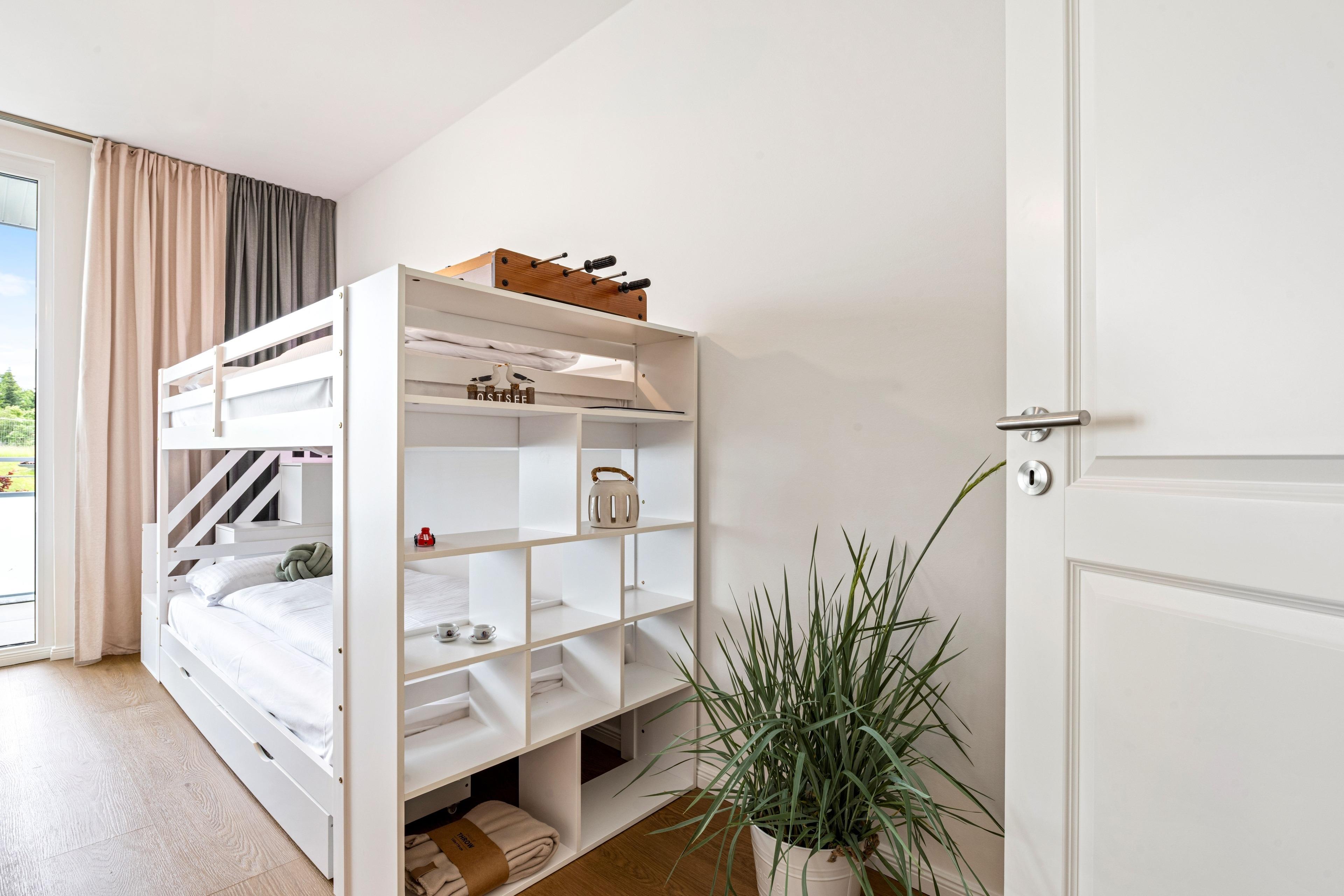 Das Wohnzimmer ist mit einem Schlafsofa (180/200cm) für zwei Personen ausgestattet, während in einer gemütlichen Ecke ein Etagenbett (90/100cm) für Kinder bzw. Teenager bereitsteht. Für Ihre Unterhaltung sorgen ein großer Flachbildfernseher, WLAN, Bücher und diverse Spiele.