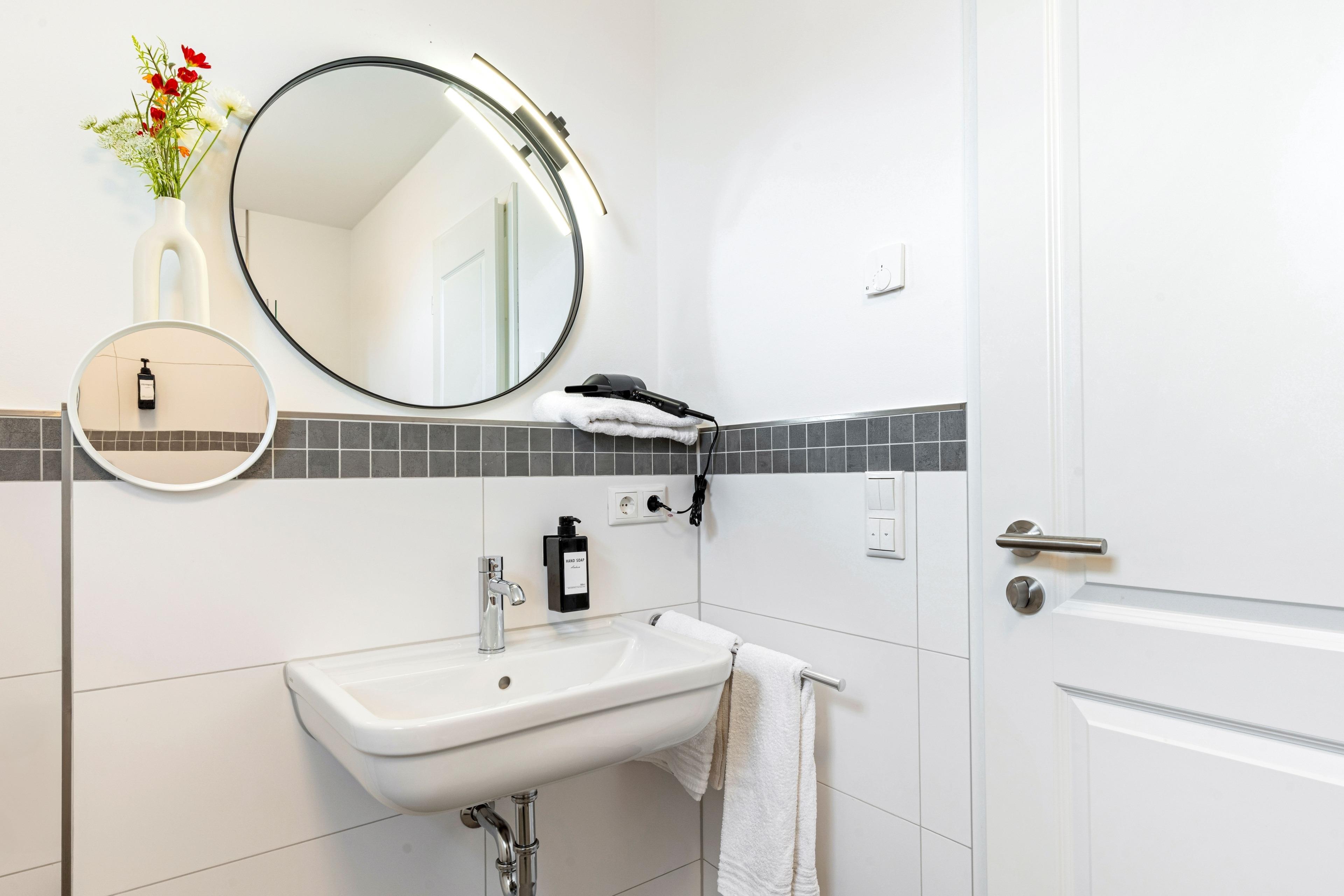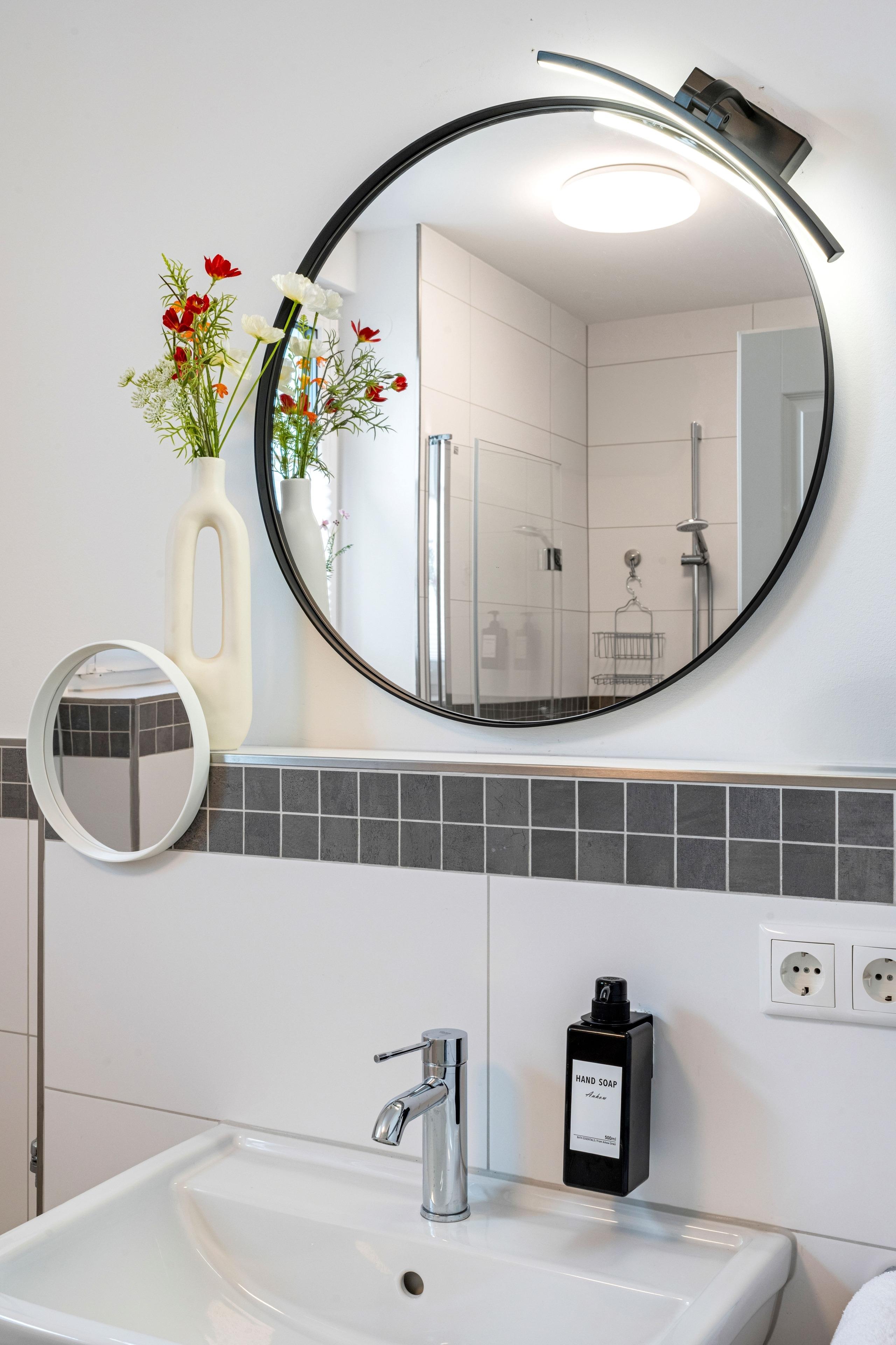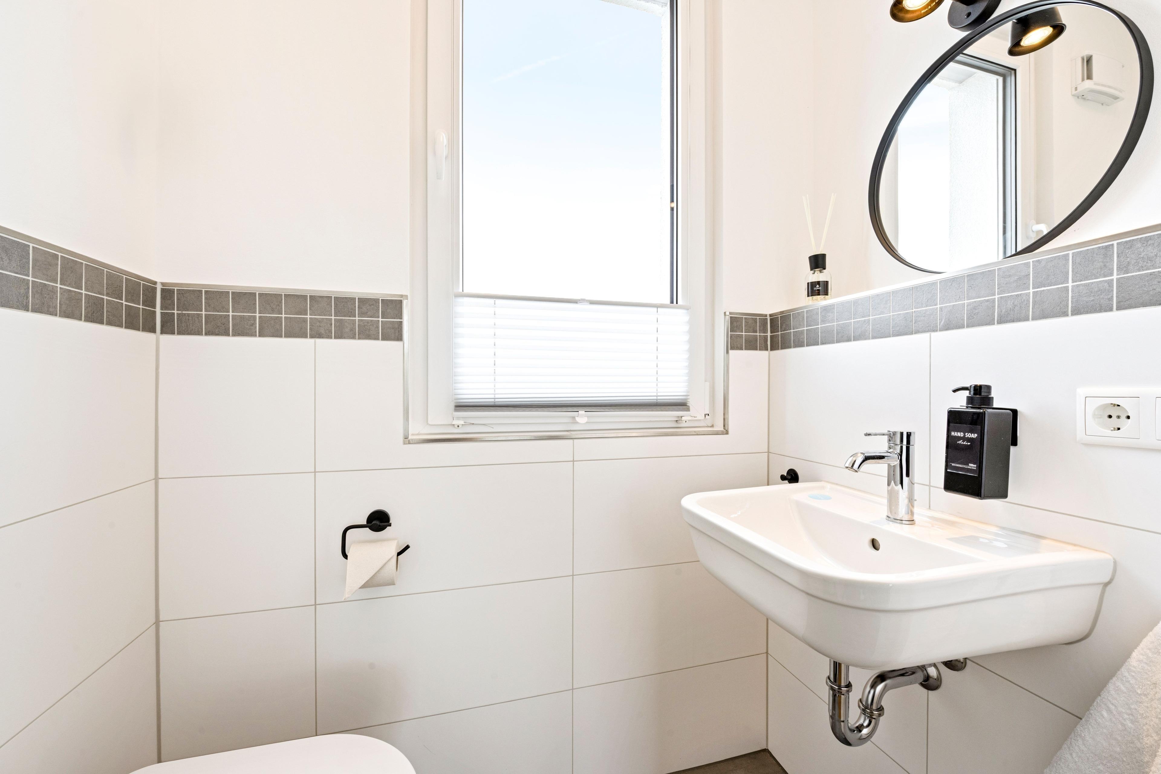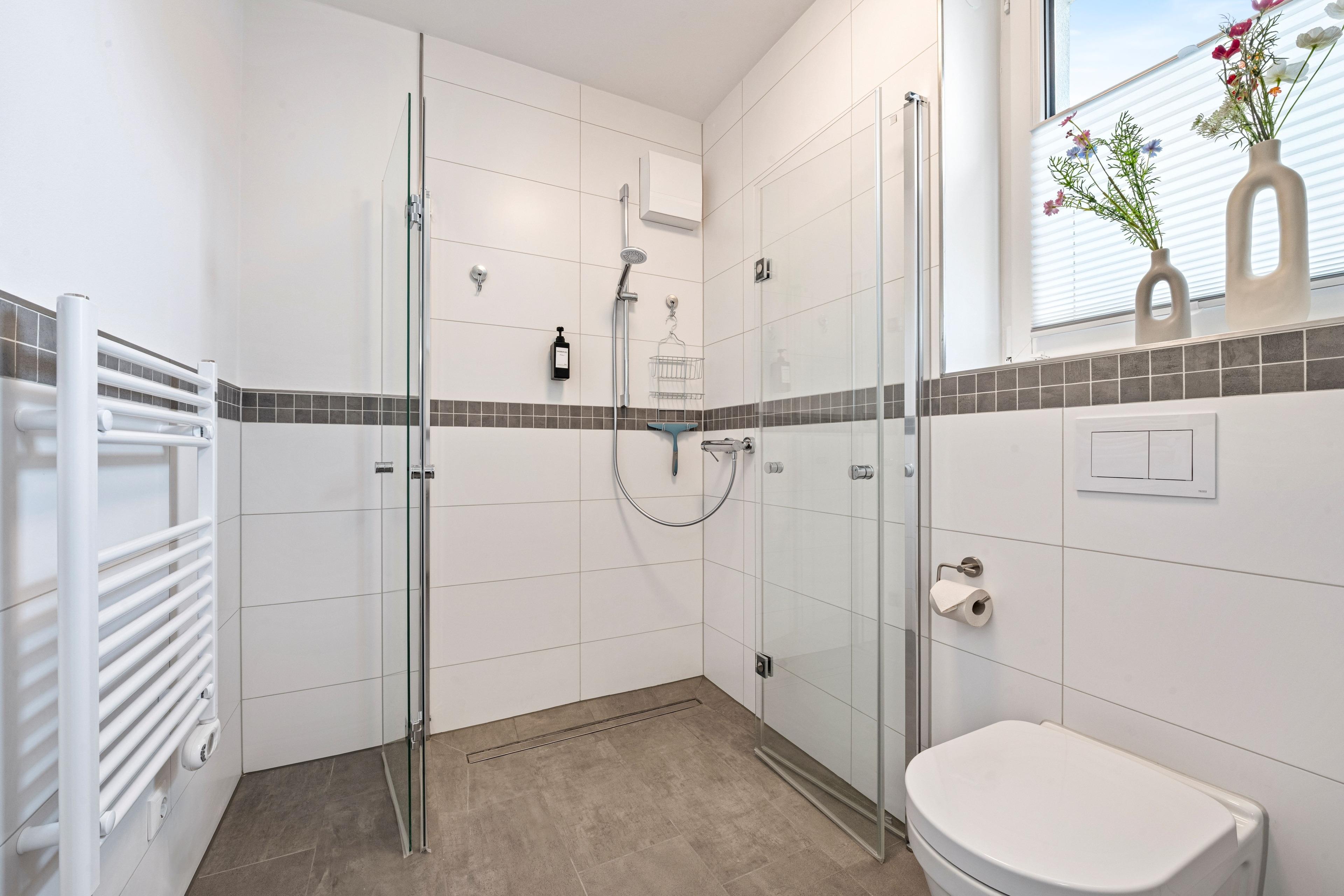 Das großzügige Badezimmer mit Fenster, ebenerdiger Dusche, Kosmetikspiegel, Handtuchwärmer und Haartrockner ist der perfekte Ort für Ihr persönliches Wellness-Erlebnis.