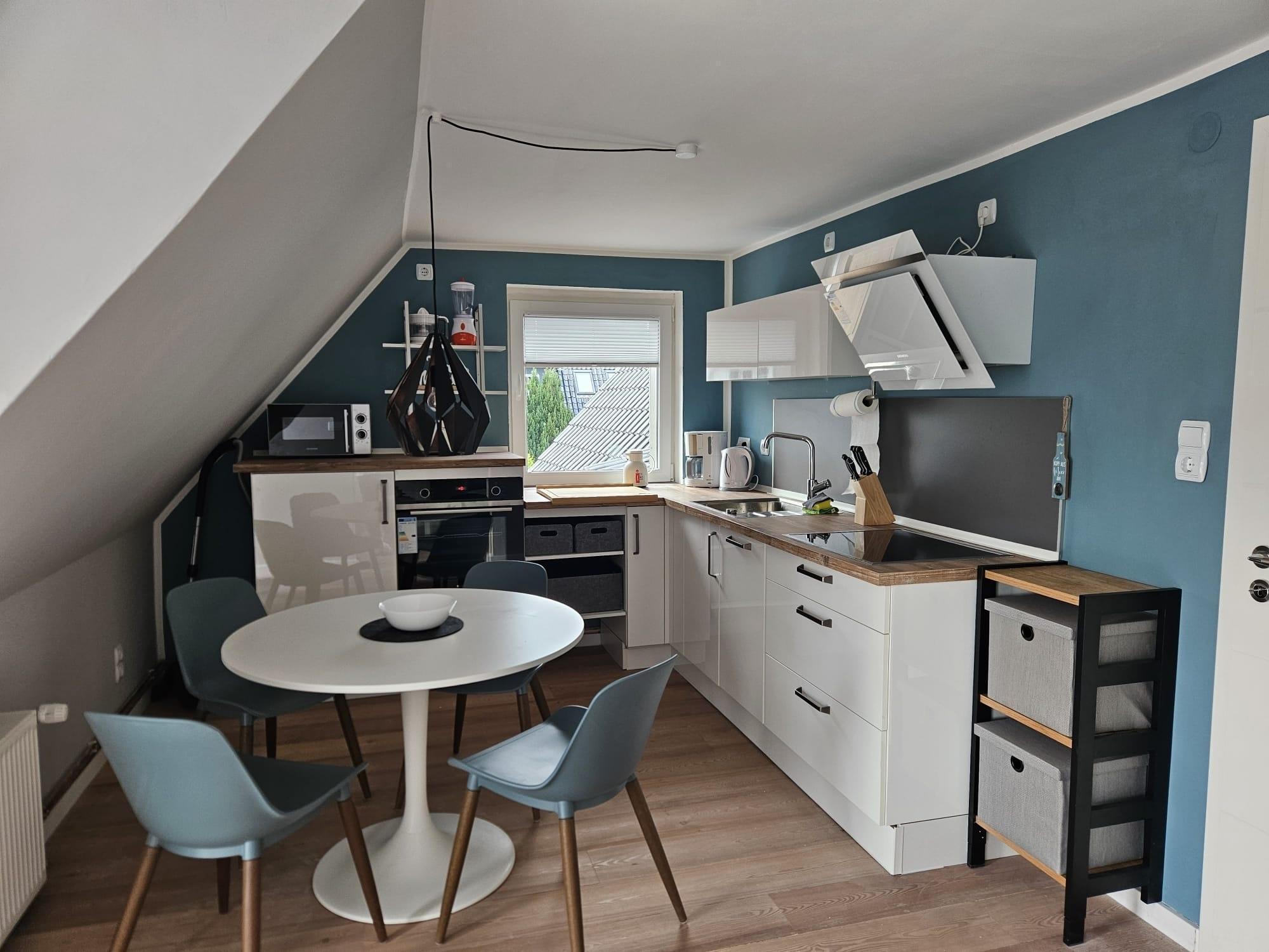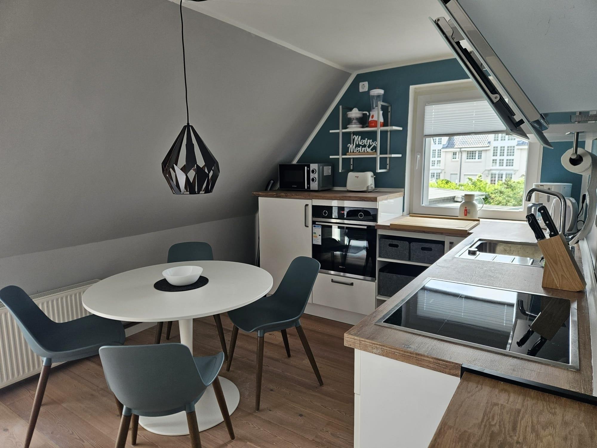 • Küche: Einbauküche mit Induktionskochfeld und Umlufthaube, Geschirrspüler, Backofen, Kühlschrank mit Gefrierfach, Kaffeemaschine, Wasserkocher, Thermokanne, Pürierstab, Geschirr, Besteck, Gläser, Kaffeebecher, Knoblauchpresse, Messerblock usw. Esstisch + Stühle für 4 Personen.