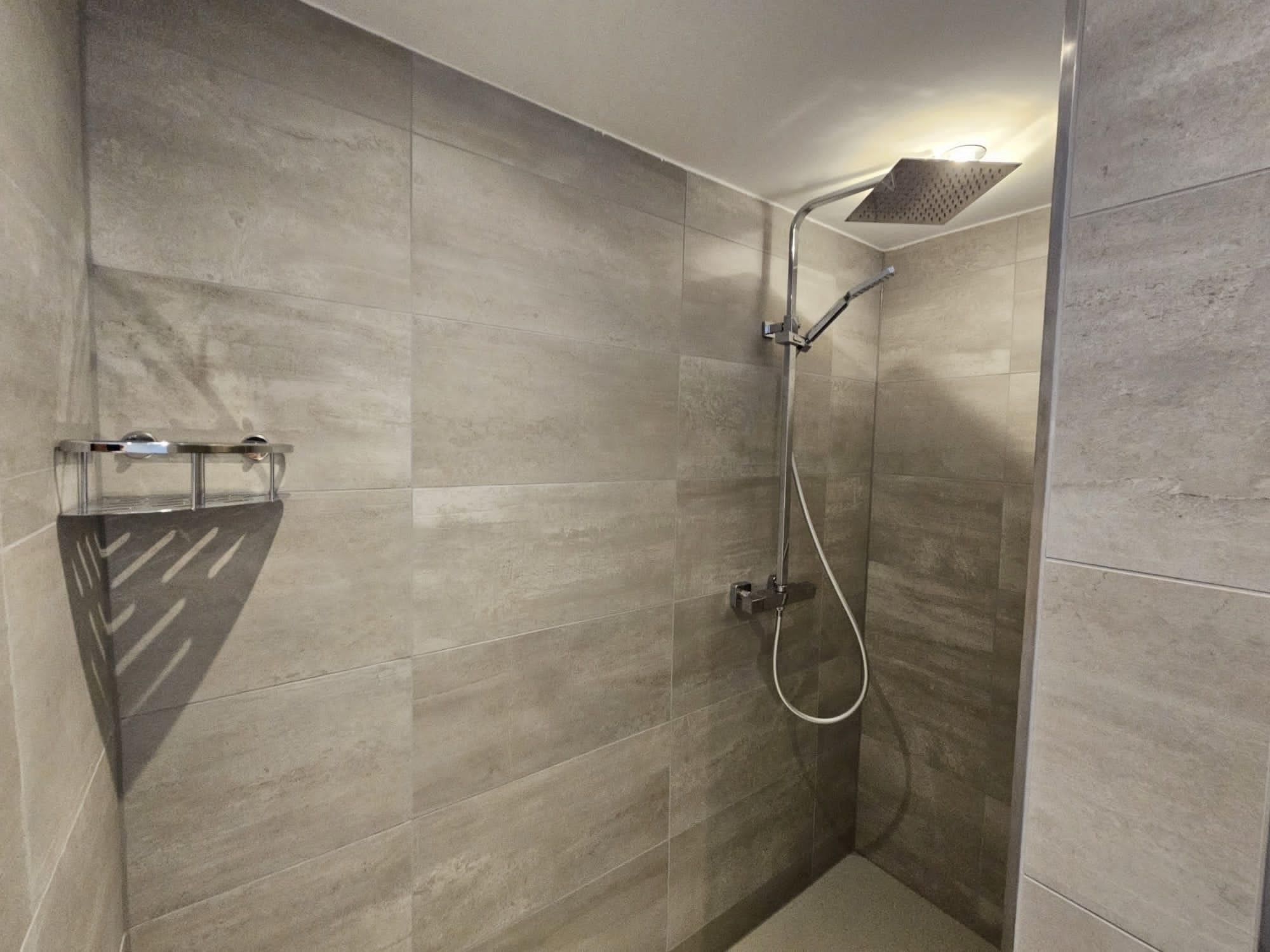 • Bad: modernes Bad mit großer Dusche, WC wandhängend, Waschtisch mit Unterschrank, Spiegelschrank, Waschmaschine, Wärmepumpentrockner, Fön