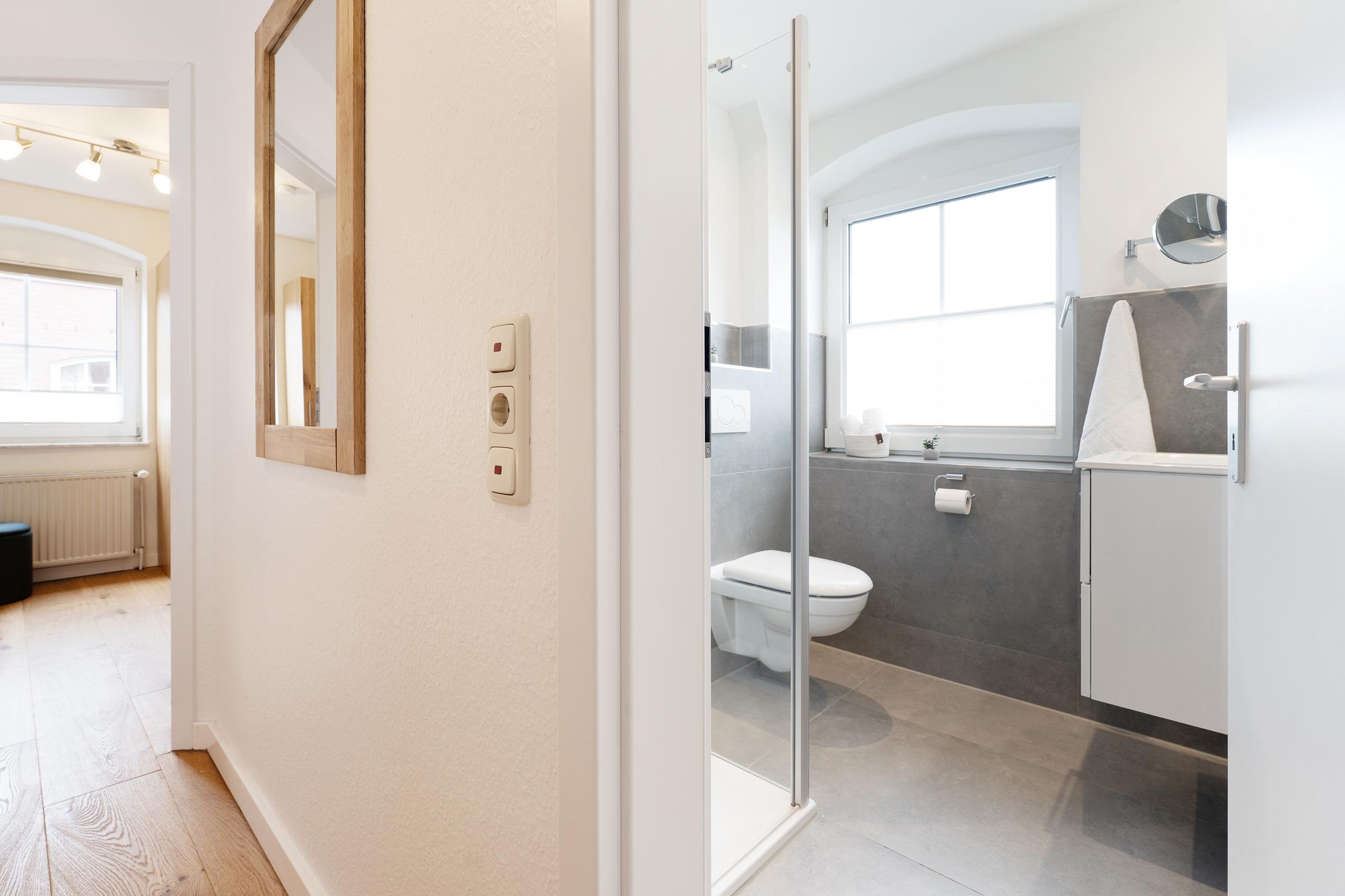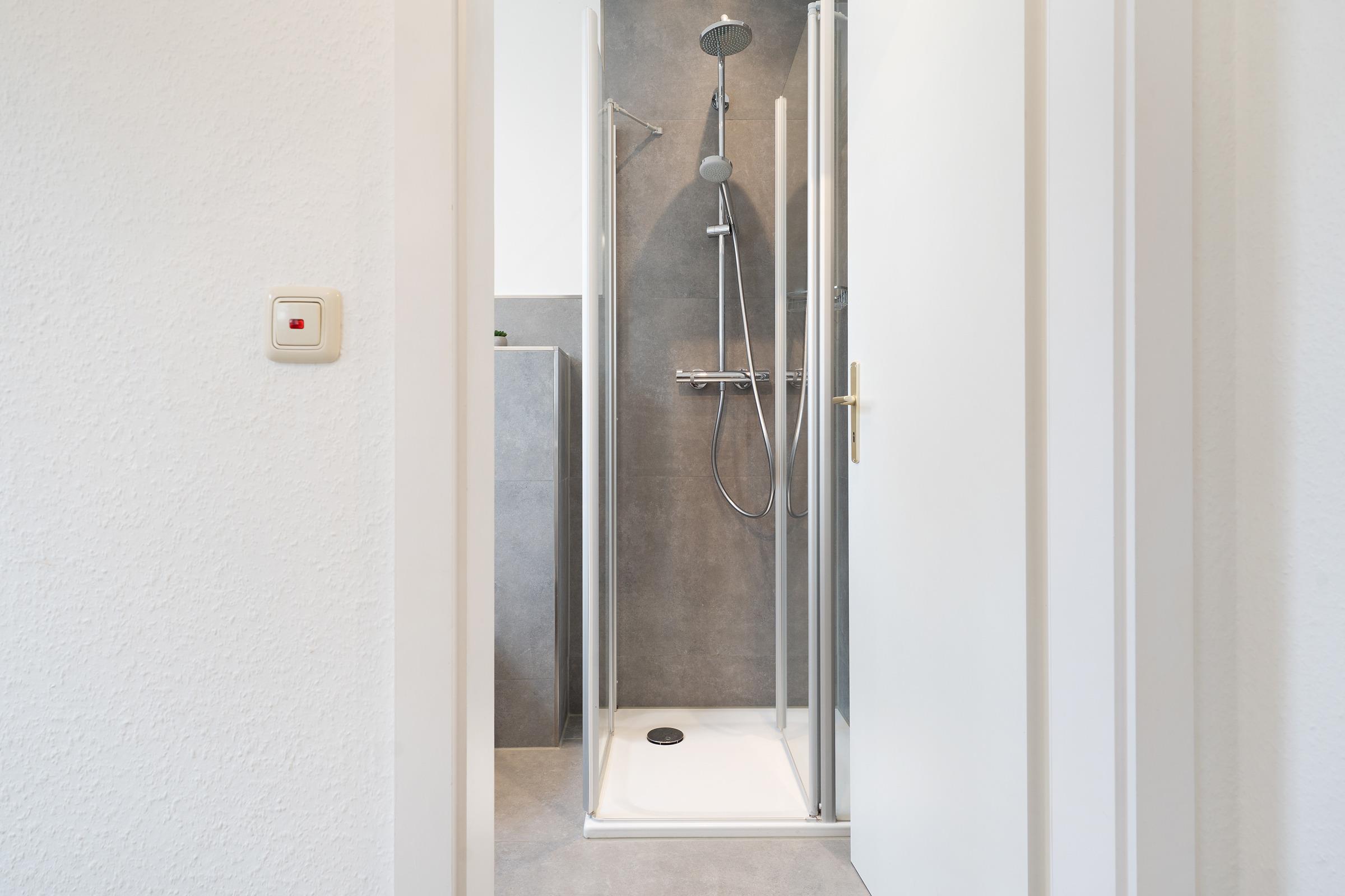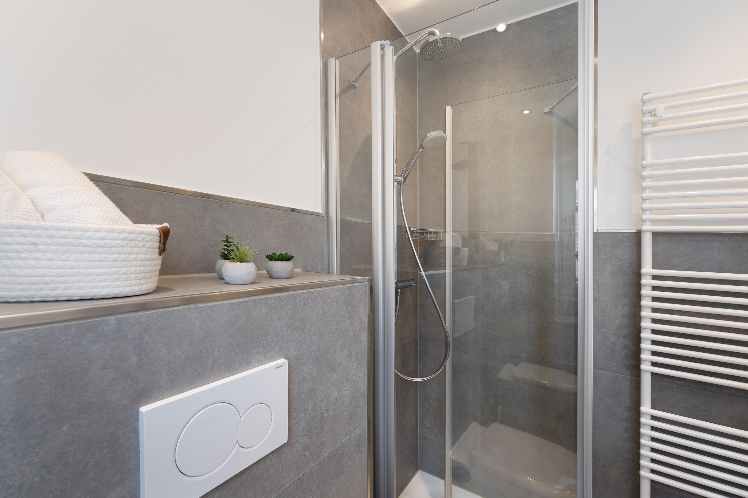 Das Badezimmer verfügt über eine Dusche und einen beheizbaren Handtuchhalter.