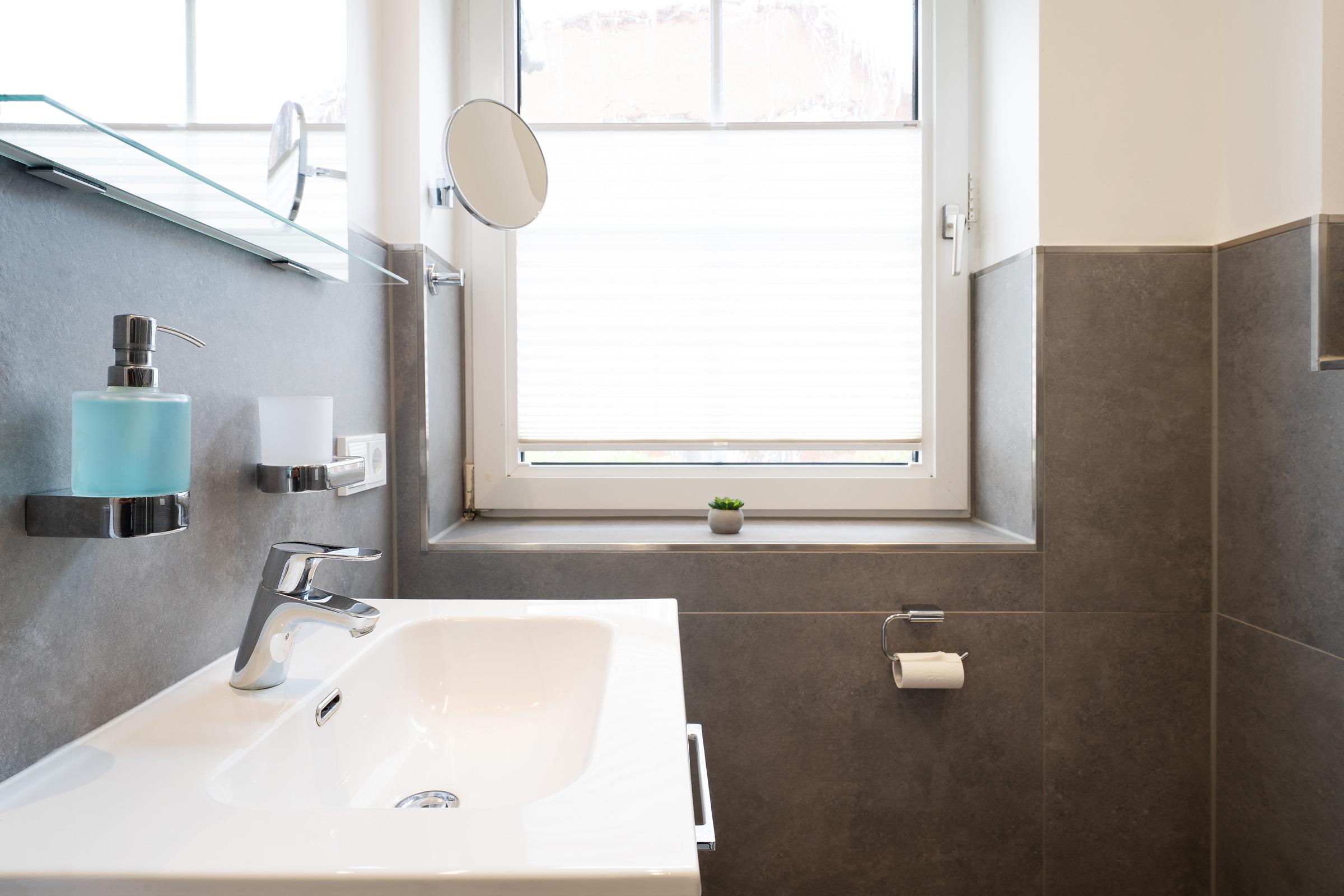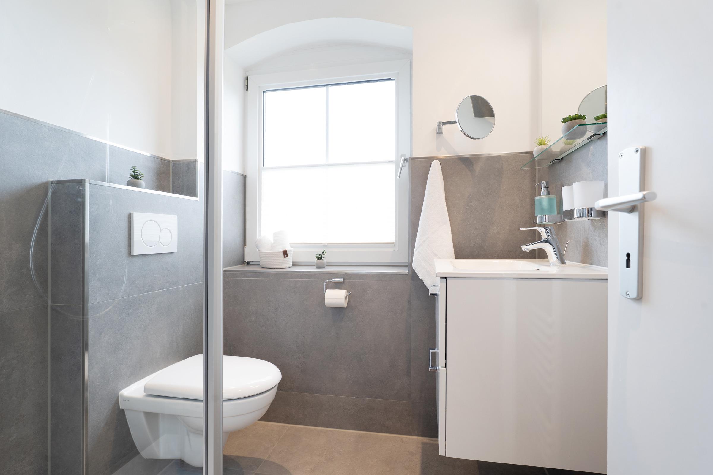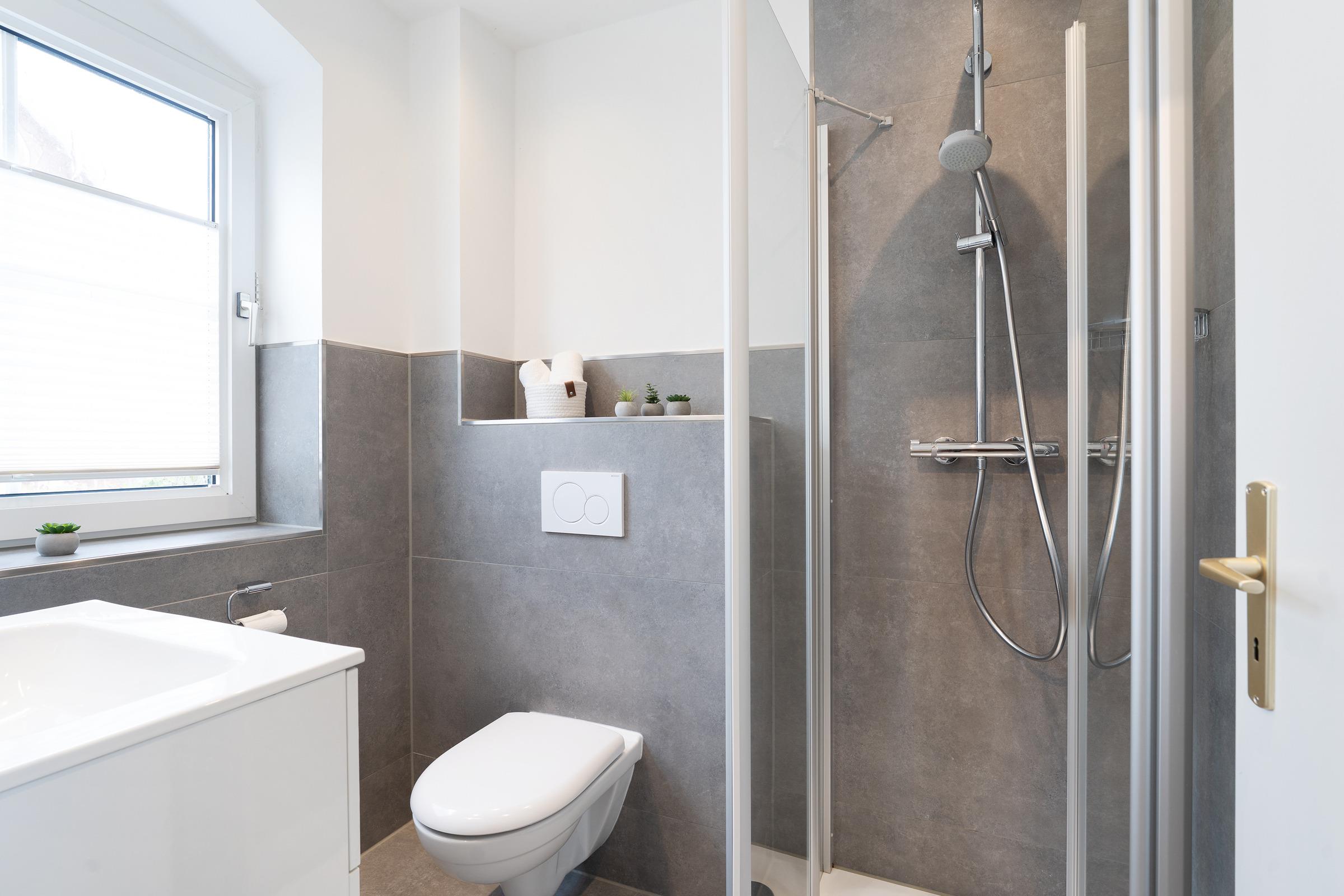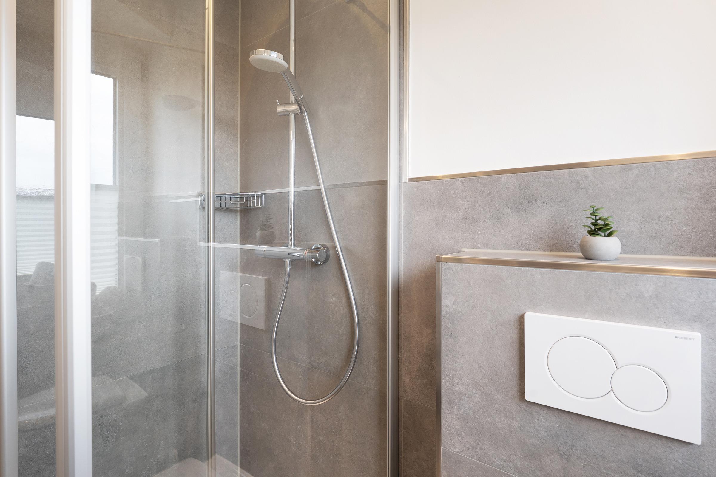 Das Badezimmer verfügt über eine Dusche und einen beheizbaren Handtuchhalter.