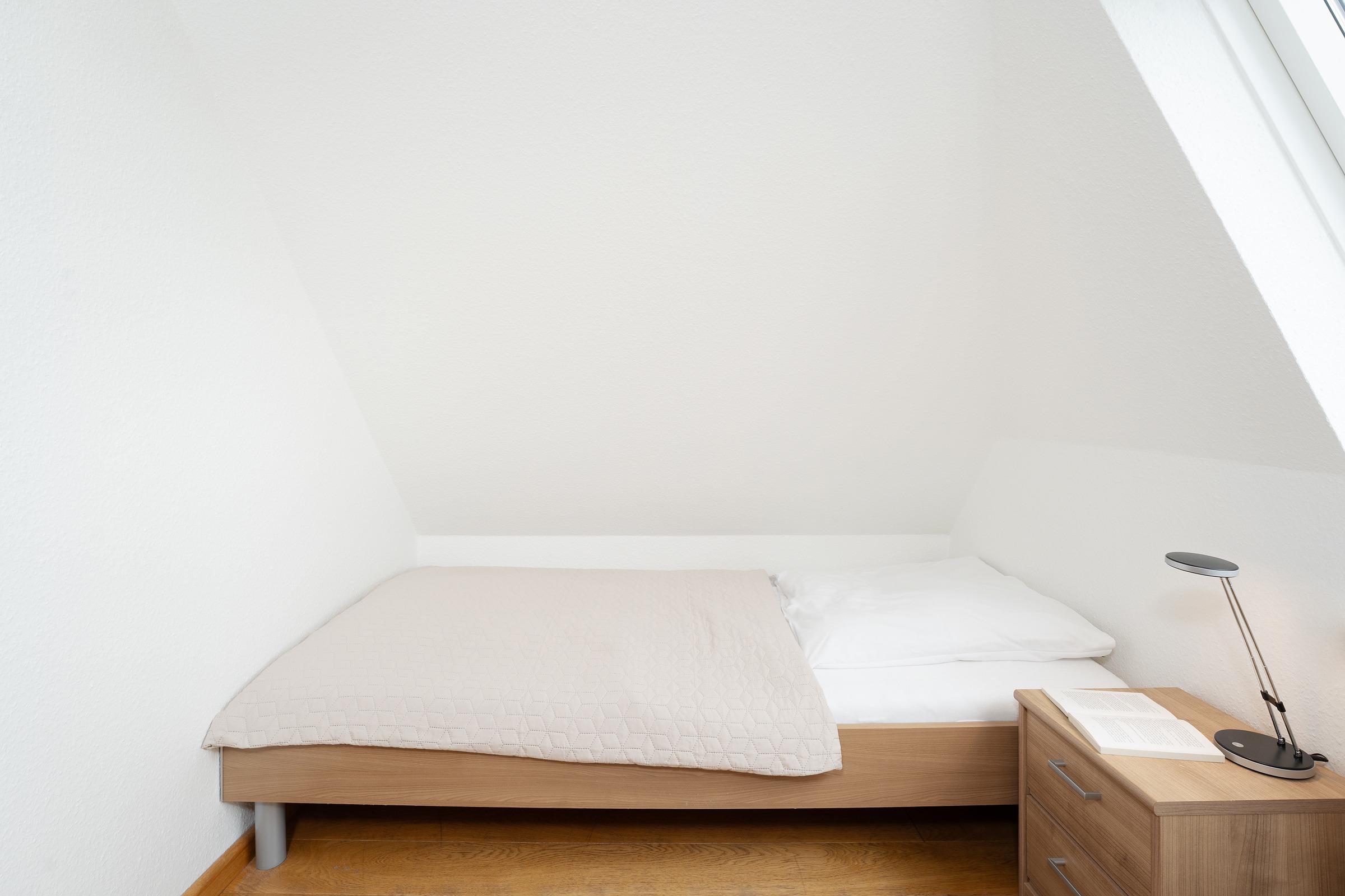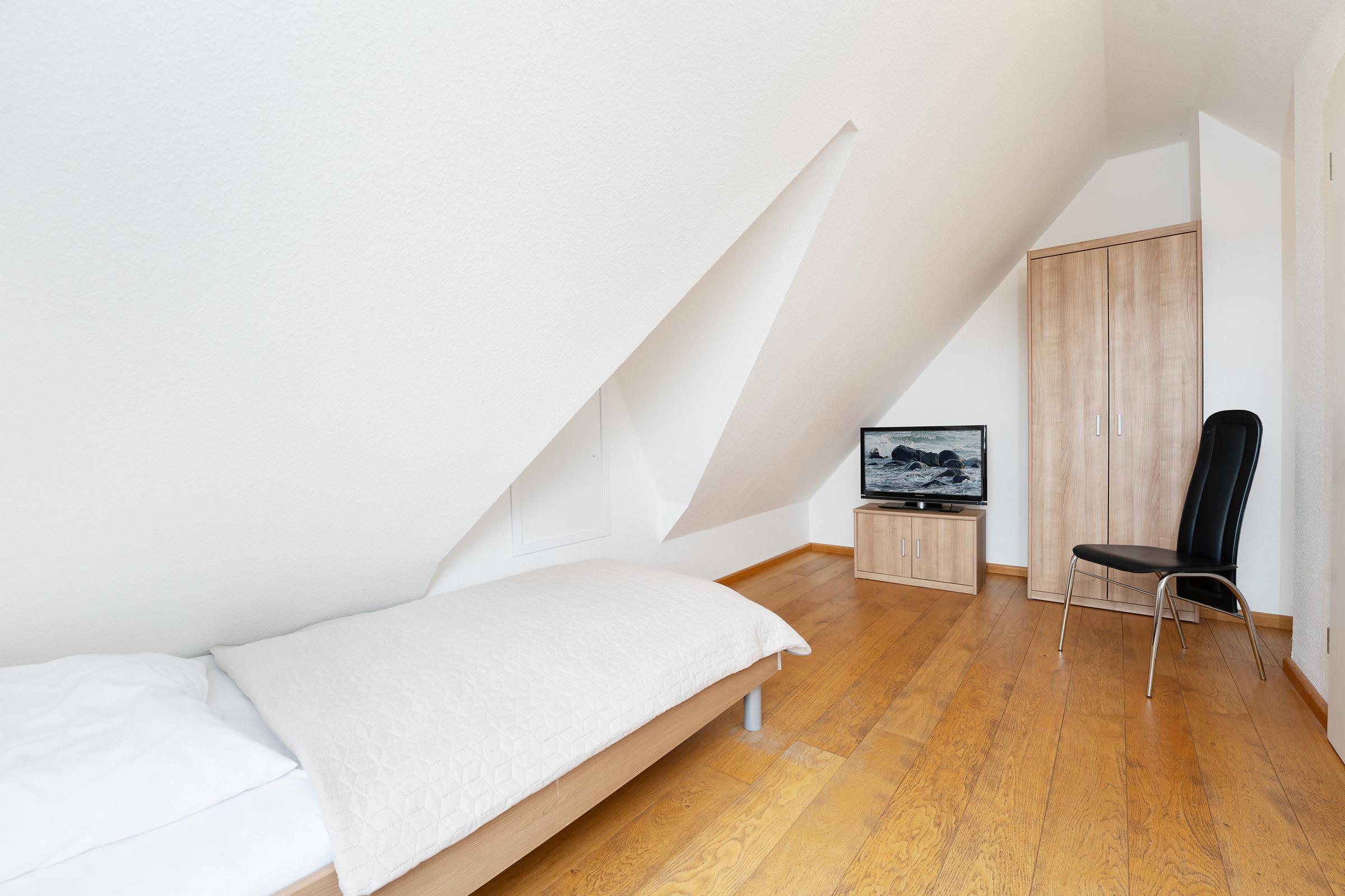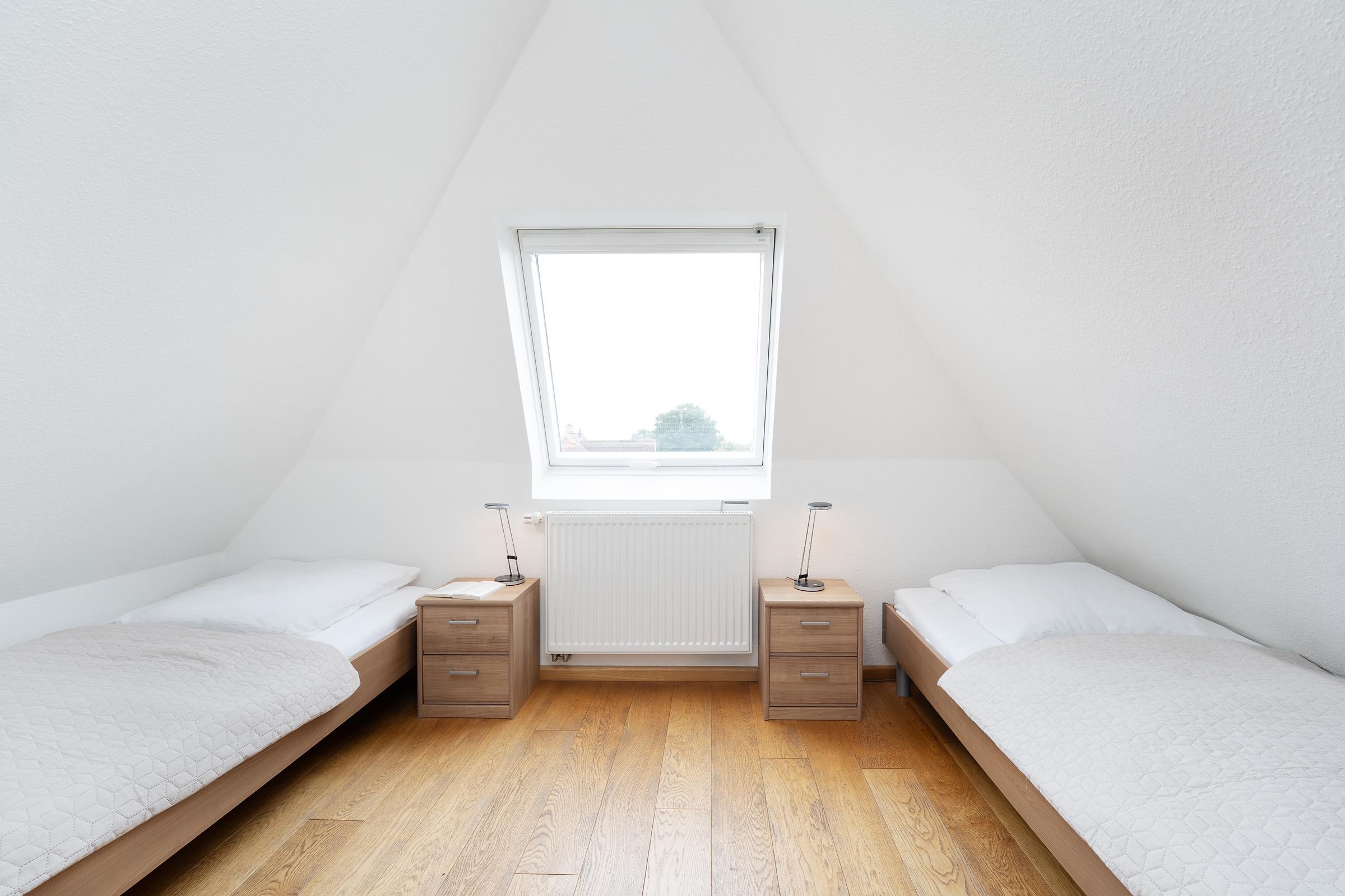 Schlafzimmer 3: 2 Einzelbetten (je 90x200 cm), Kleiderschrank, TV, Verdunkelung: Dachfensterrolladen, kein Platz für ein Babybett vorhanden