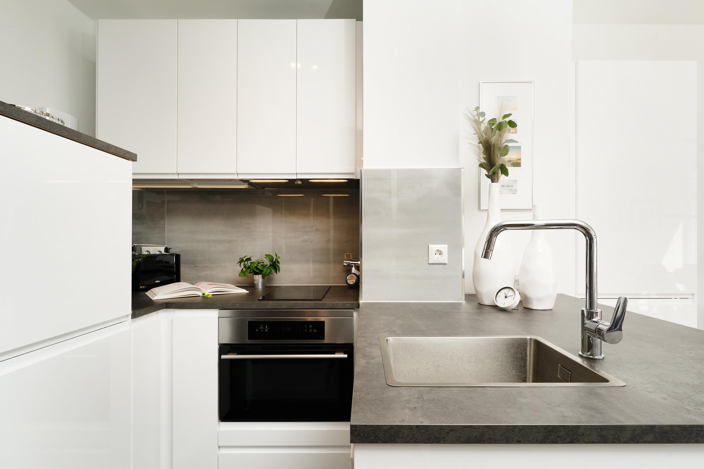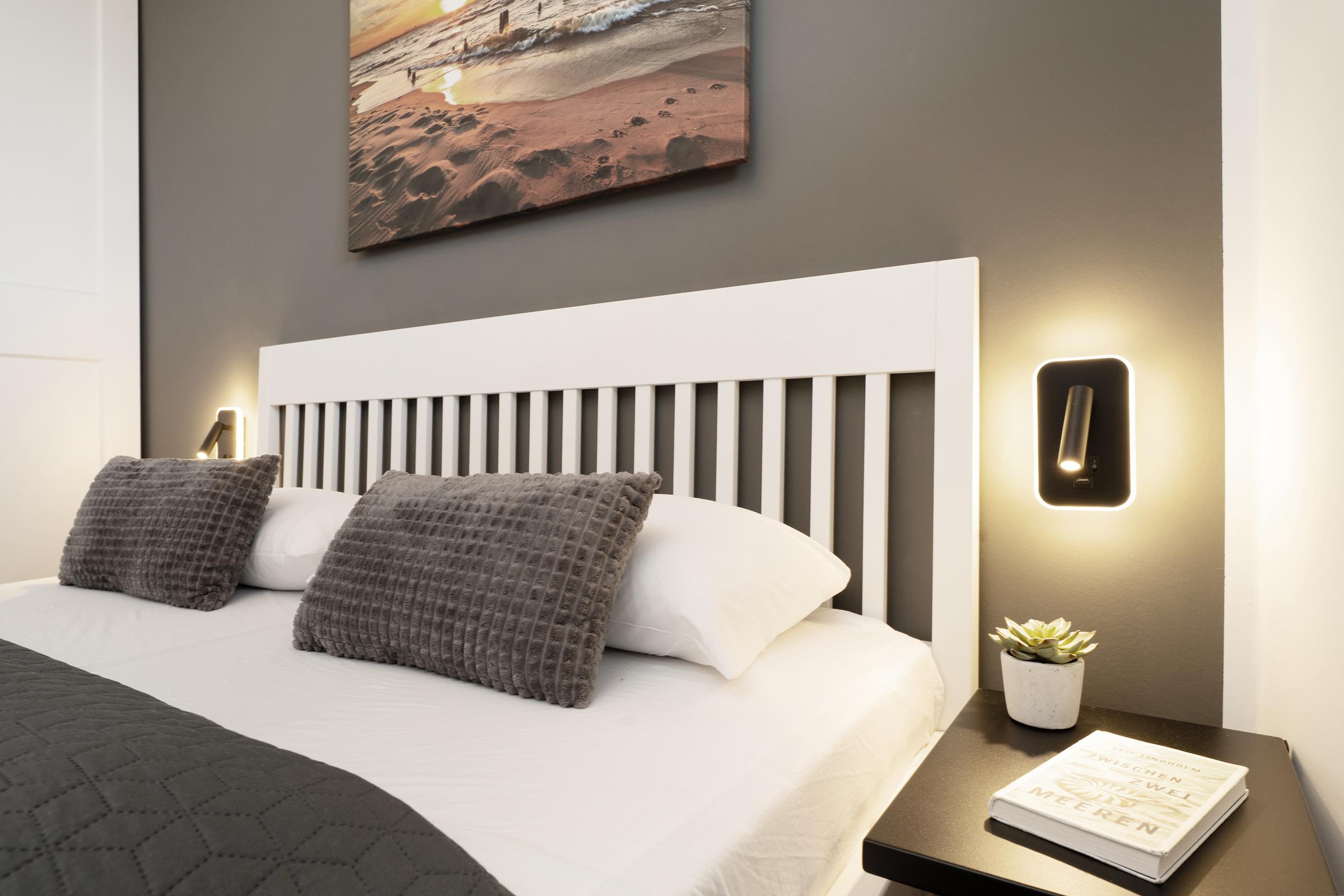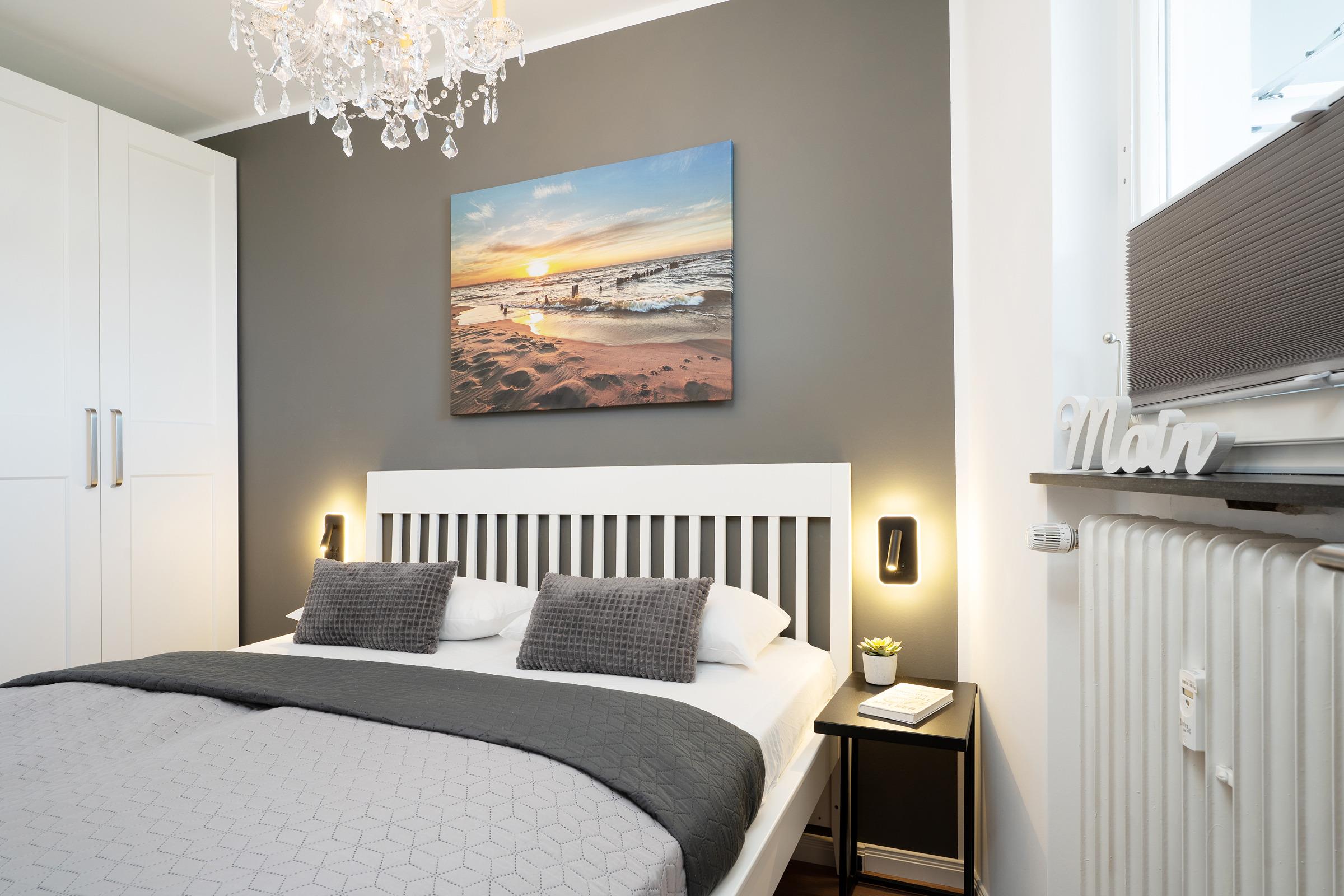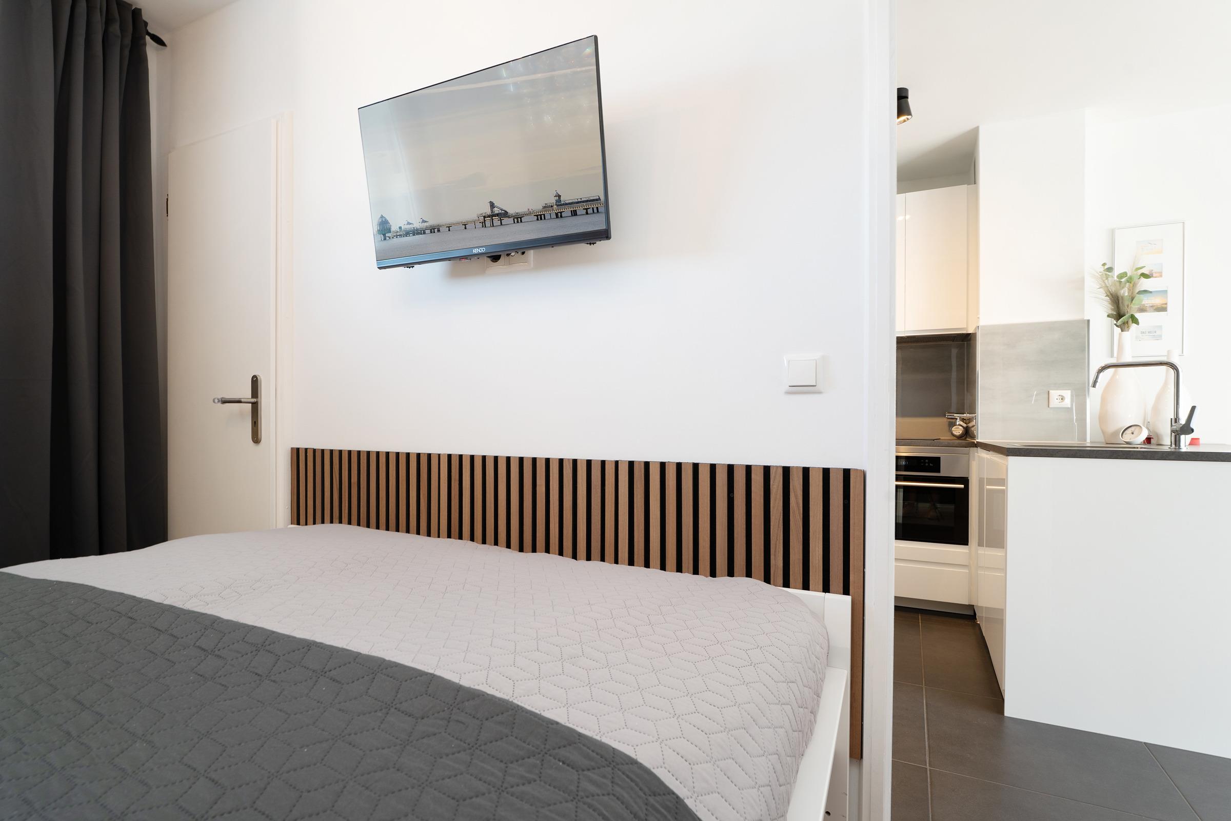 Der helle Wohnbereich lädt mit bequemen Sitzmöglichkeiten und einem Fernseher zu entspannten Stunden ein. Von hier aus gelangen Sie auf den möblierten Balkon, der zum Verweilen an der frischen Ostseeluft einlädt. Die offene Küchenzeile ist modern ausgestattet und verfügt über Backofen, Geschirrspülmaschine, Kühlschrank, Mikrowelle, Kaffeemaschine, Toaster und weitere nützliche Utensilien. Im Schlafzimmer sorgt ein komfortables Doppelbett (2x 80x200 cm) für erholsamen Schlaf. Das Badezimmer ist mit Dusche und WC ausgestattet.