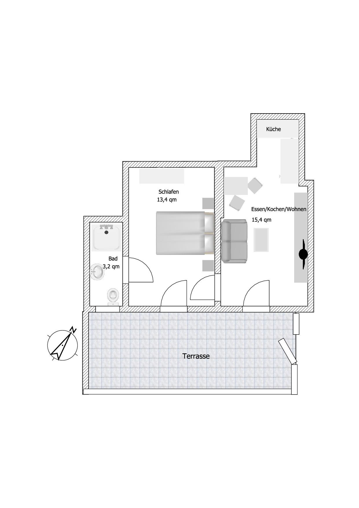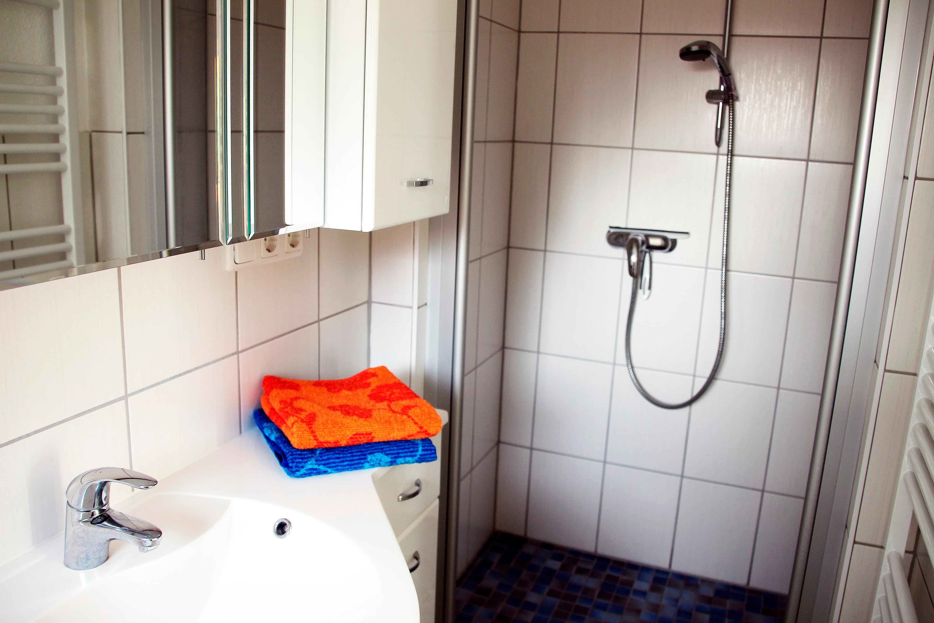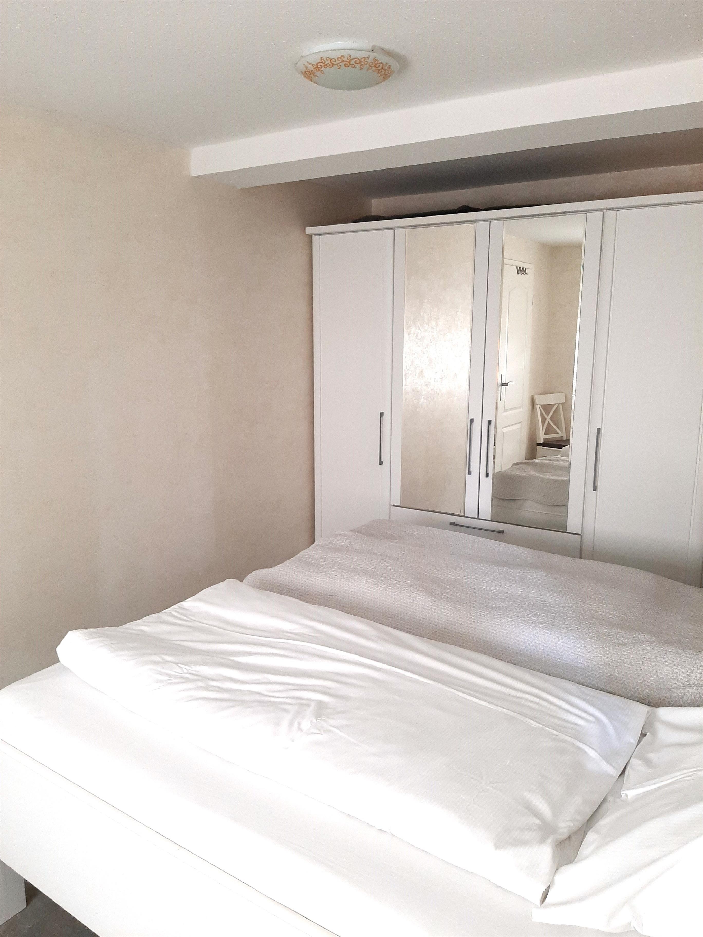 Die Wohnung ist ca. 38 qm groß, renoviert, modern möbliert und hat ein separates Schlafzimmer. Die Parterrewohnung ist komplett gefliest. Im Duschbad ist die Dusche barrierefrei, und es ist ebenfalls ein Spiegelschrank für genügend Stauraum vorhanden. Im Wohnzimmer befinden sich ein 2er Sofa mit Beistelltisch sowie ein Esstisch mit Stühlen. TV, Radio-CD-Player, WLAN.
