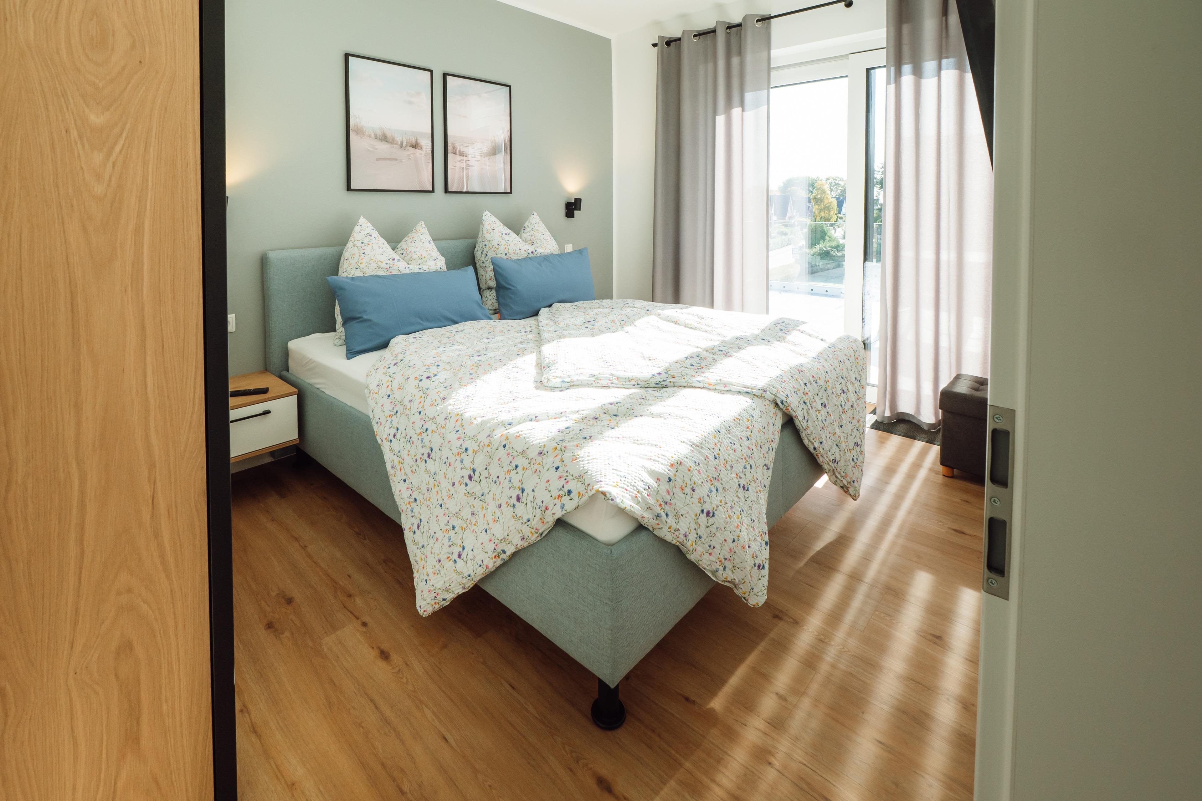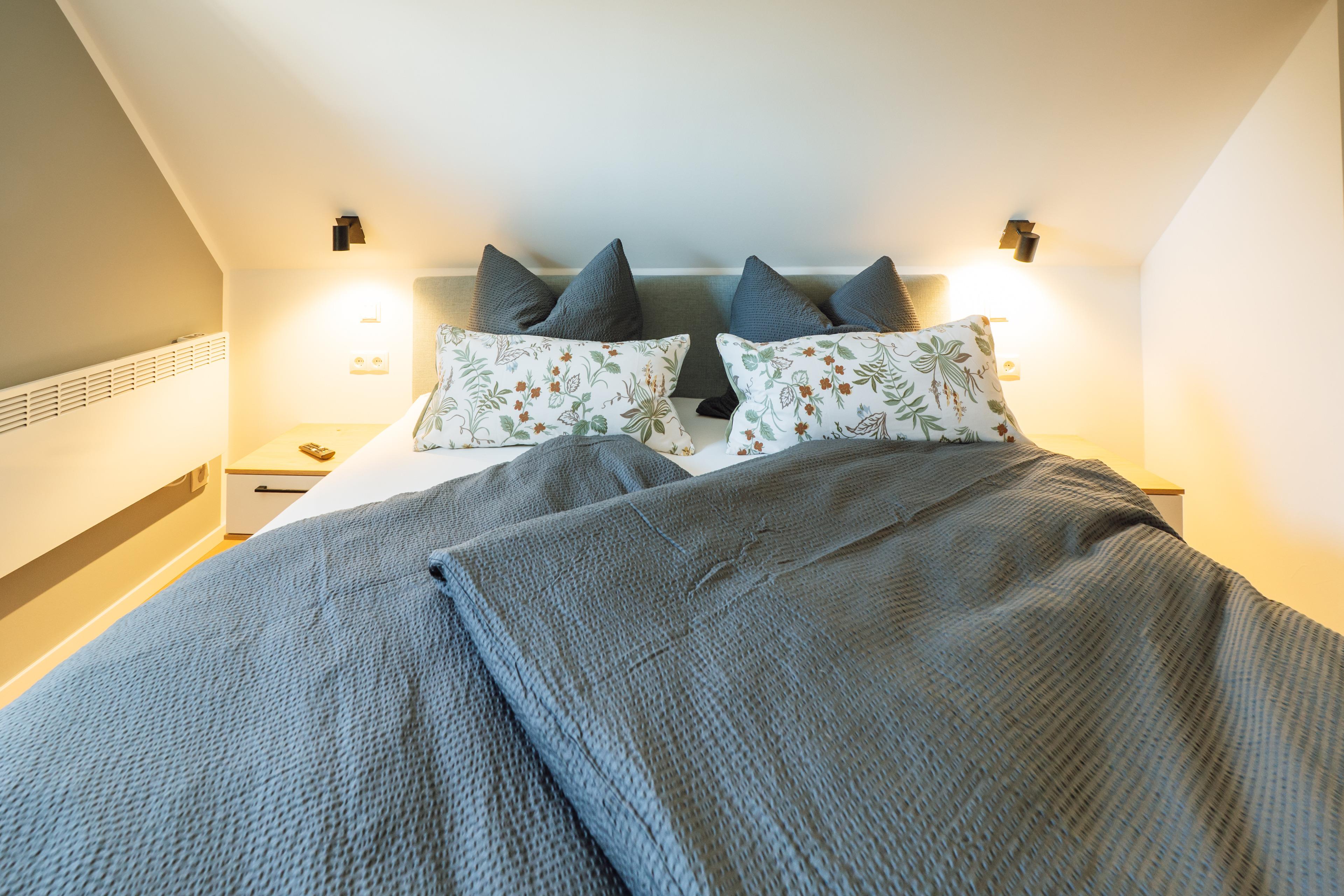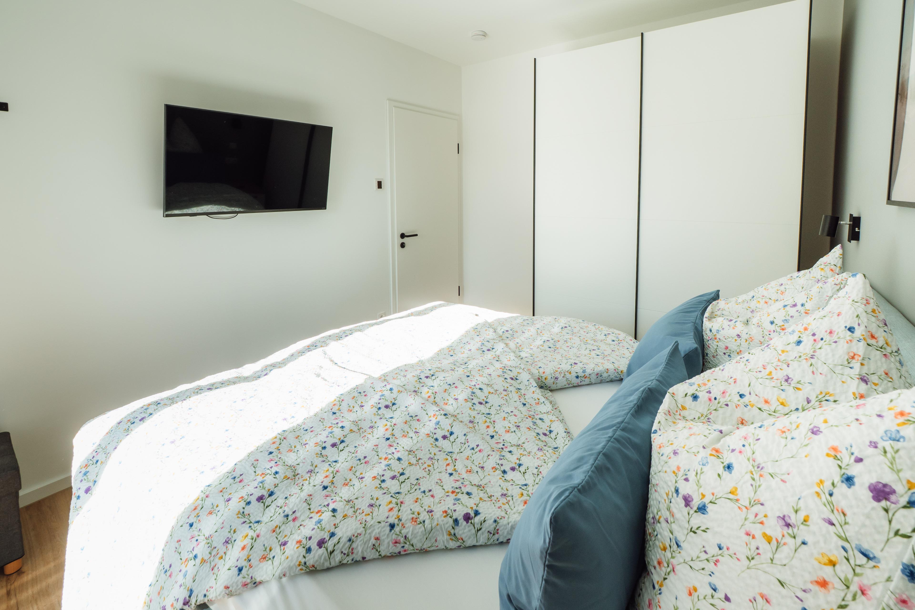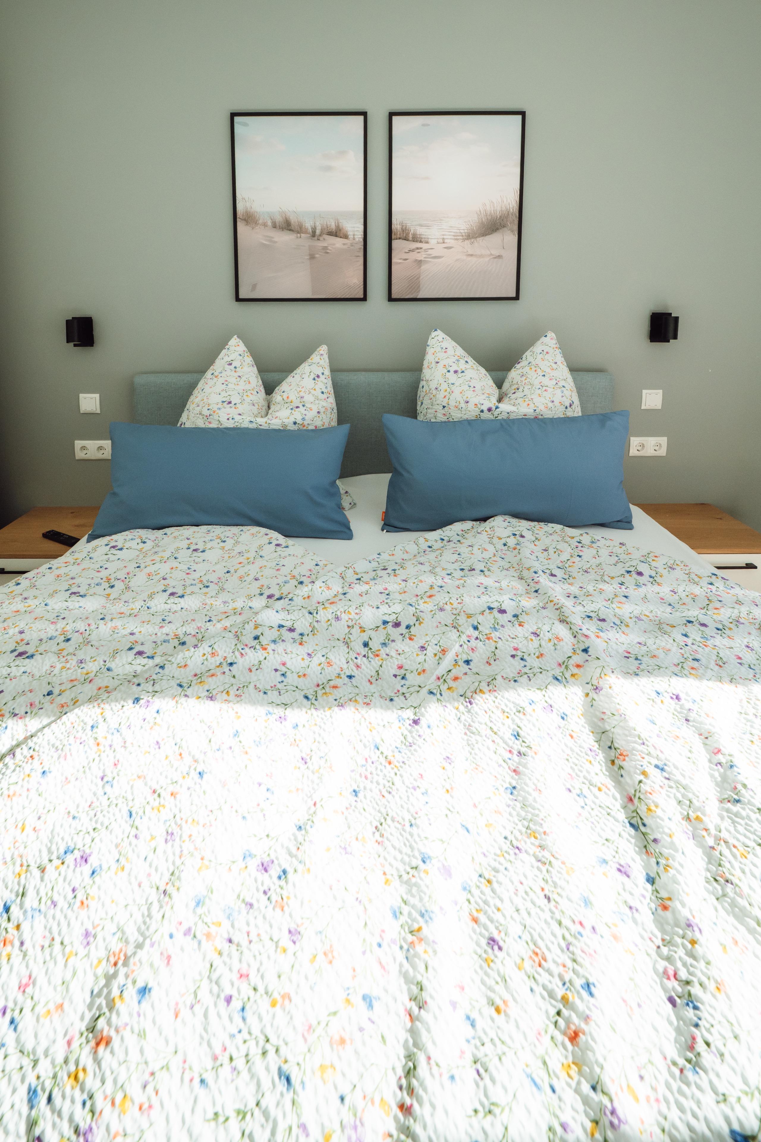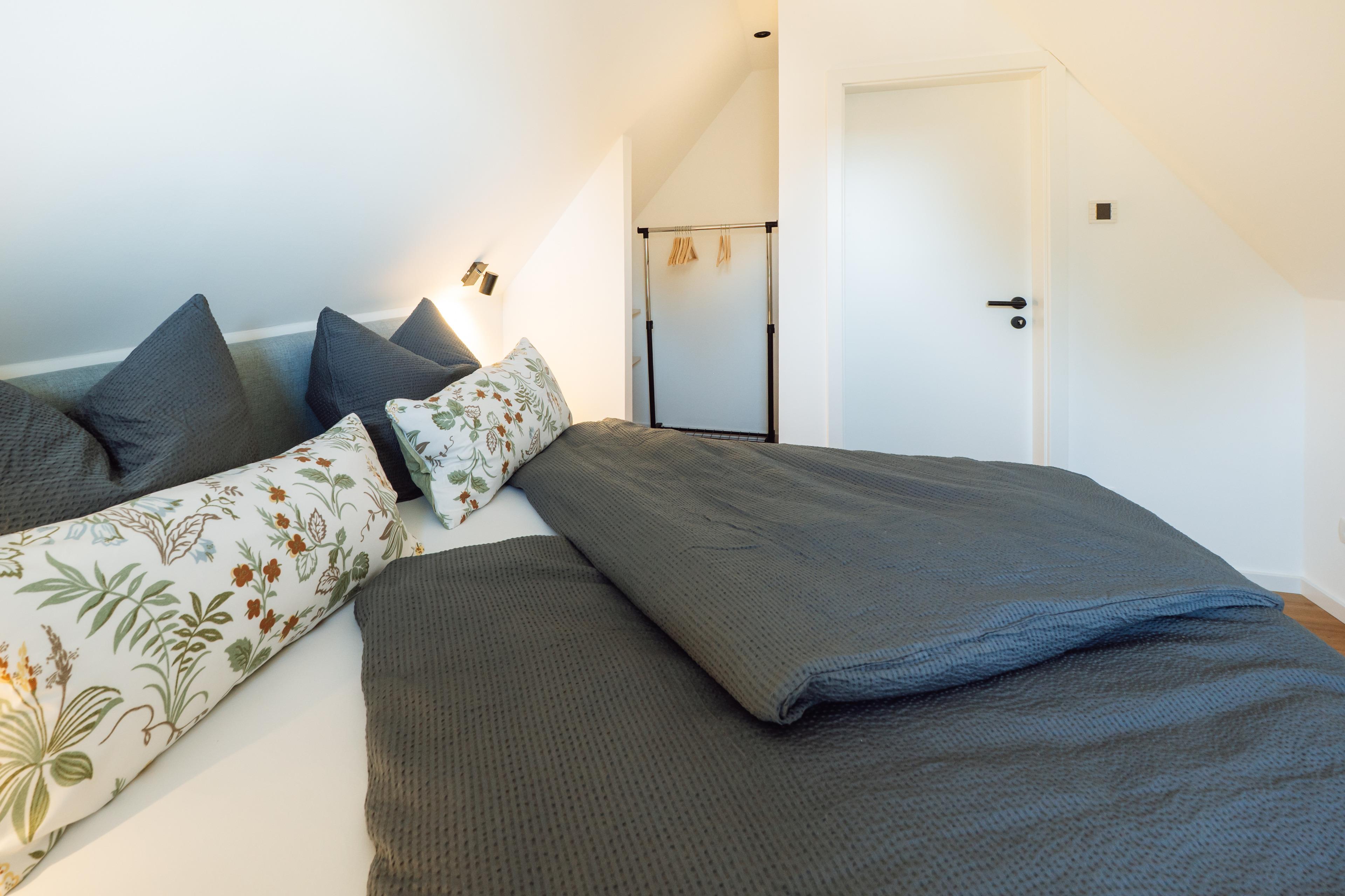 Zwei Schlafzimmer – eines davon mit eigenem Ankleidebereich – bieten Rückzugsorte zum Träumen. Im Badezimmer erwartet dich eine bodengleiche, besonders großzügige Dusche – ideal für einen erfrischenden Start in den Morgen oder zum entspannten "Regenduschen" nach einem Tag am Meer.