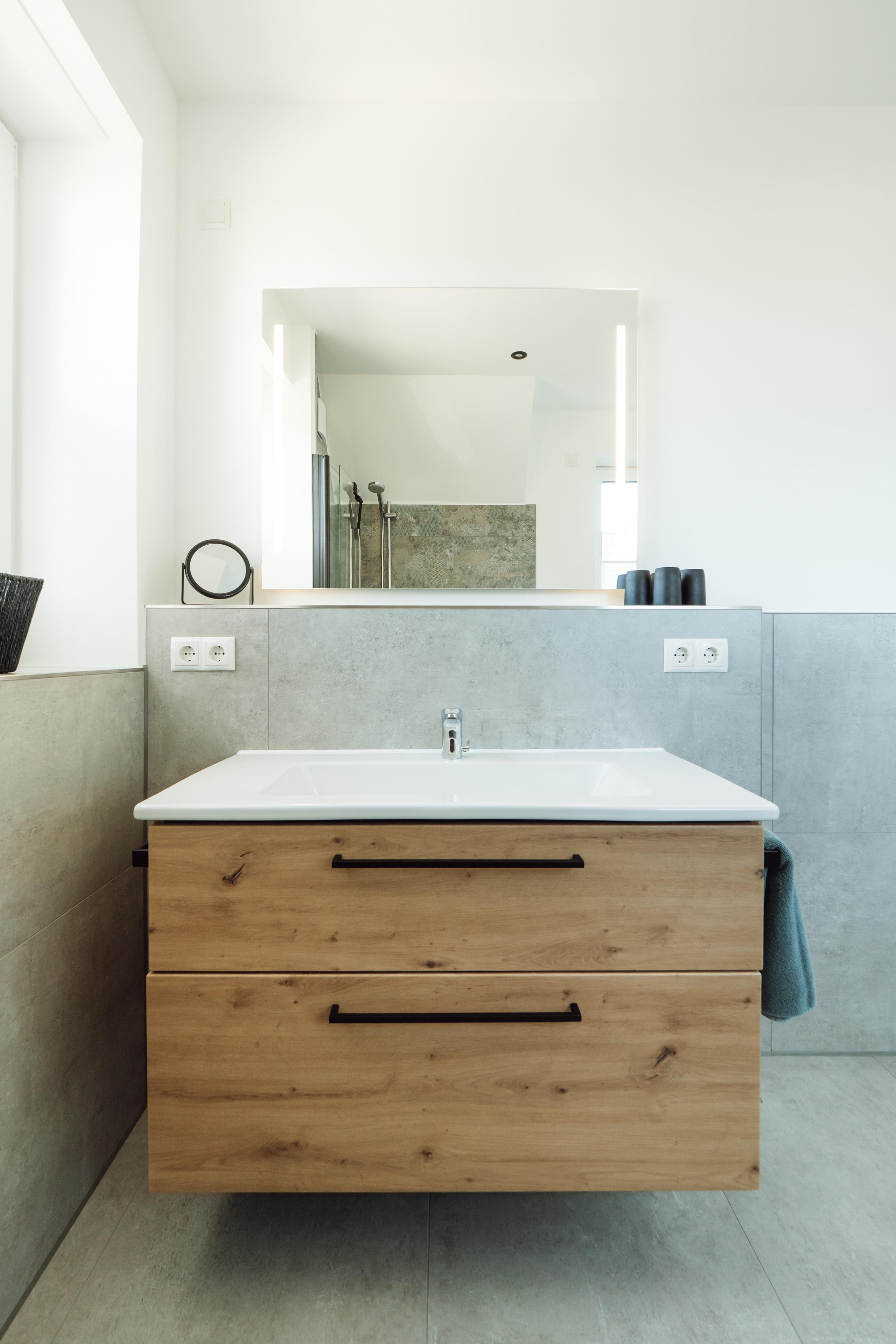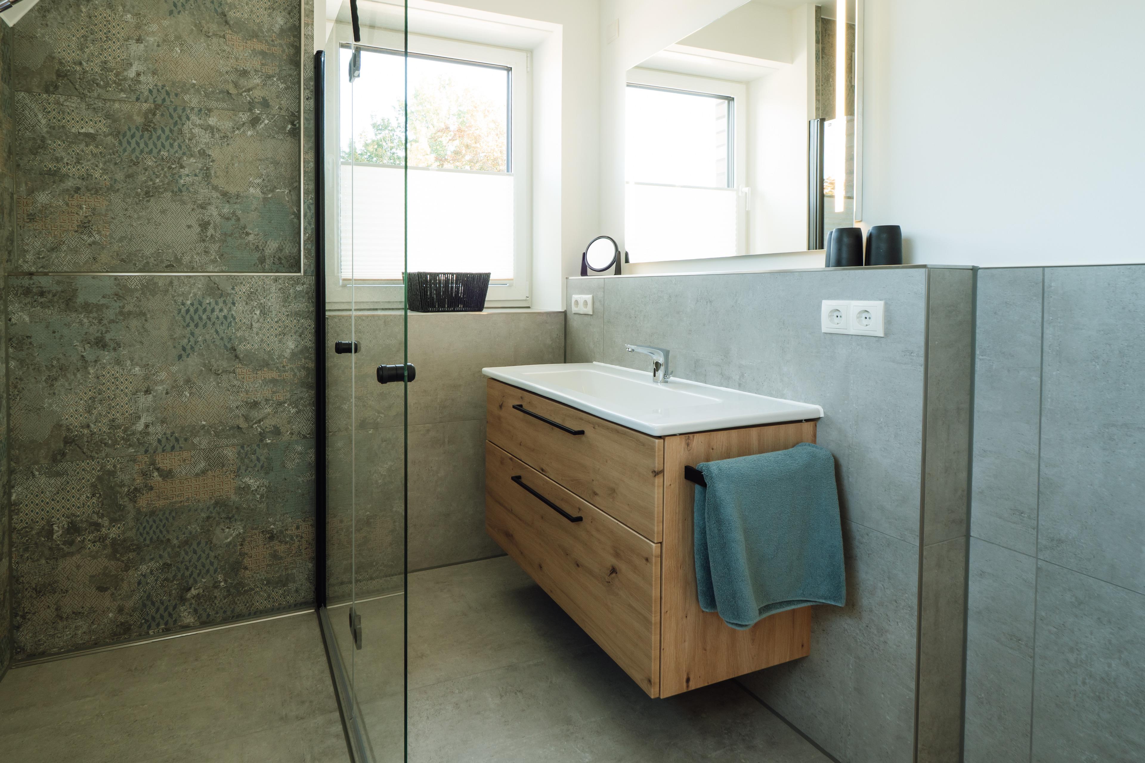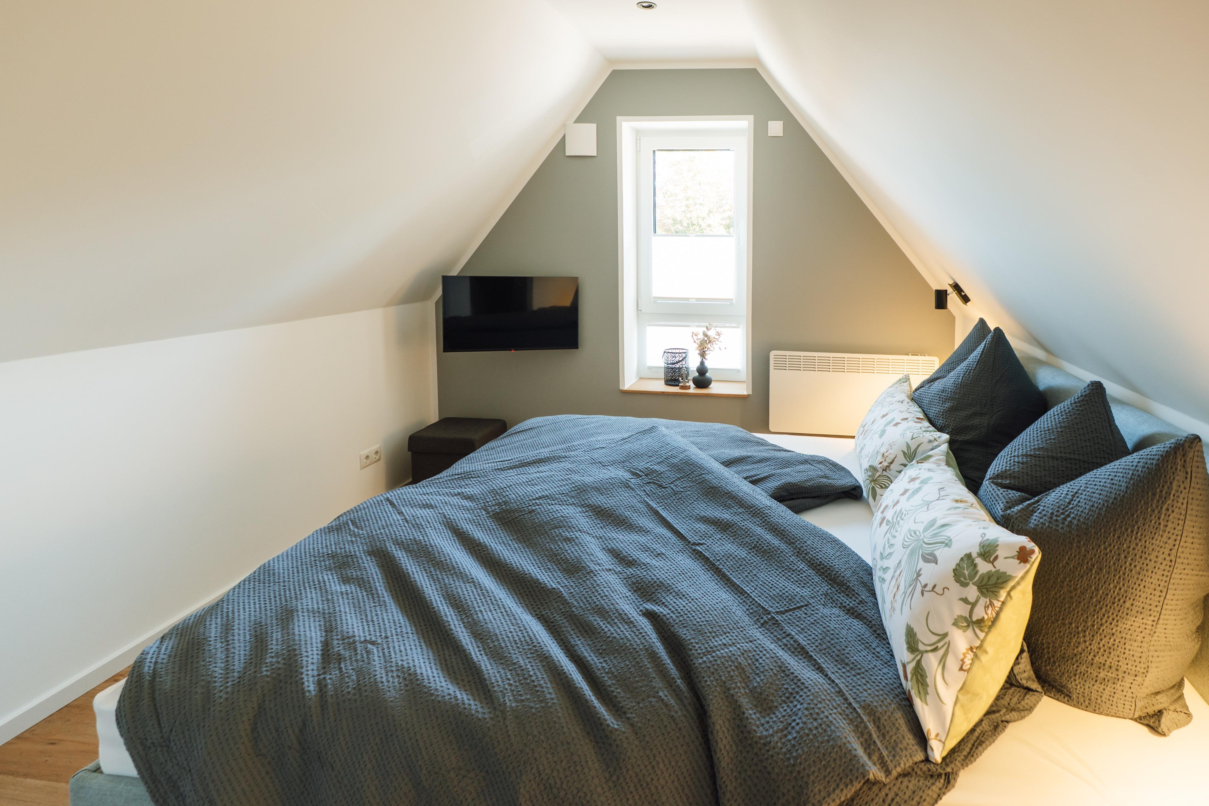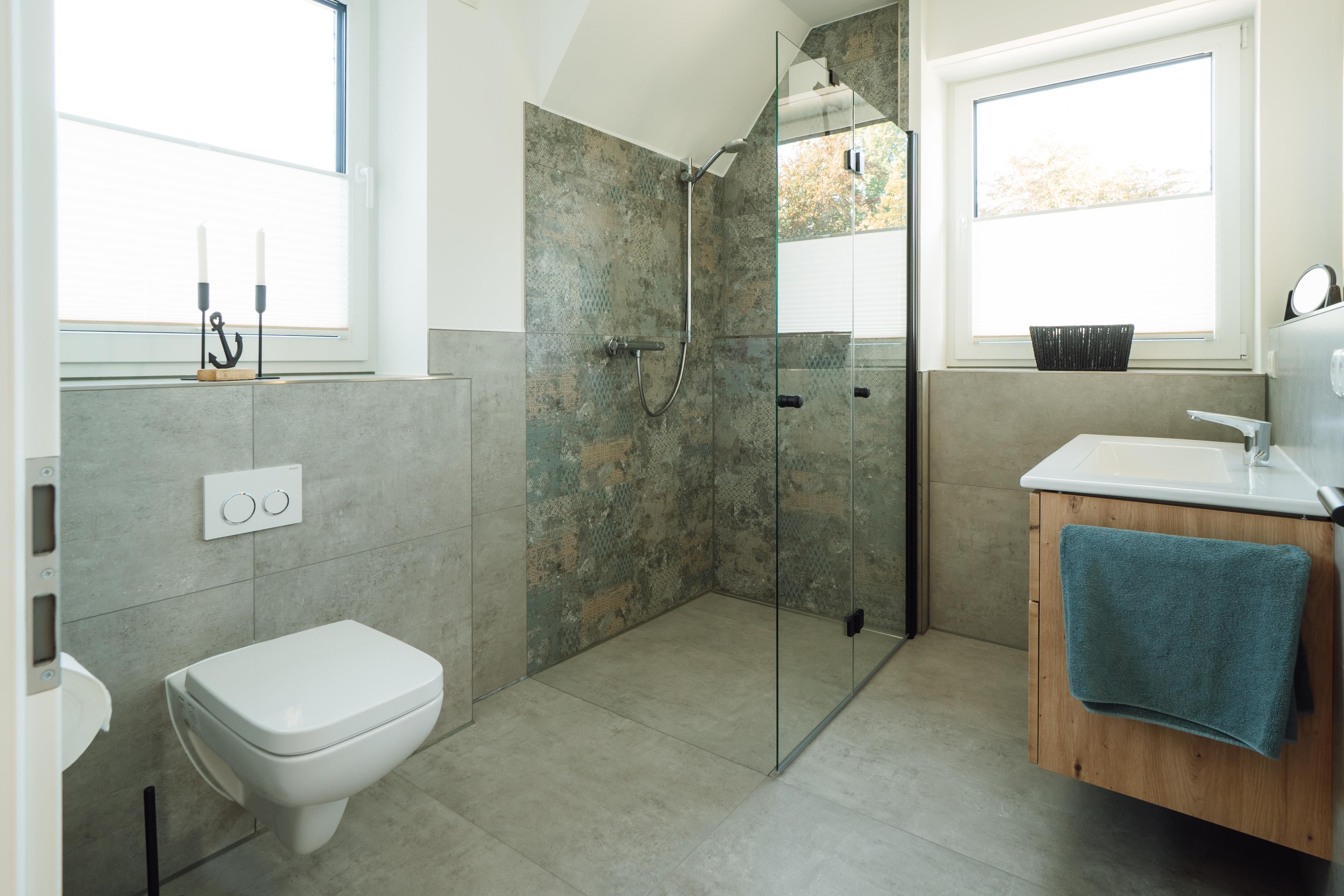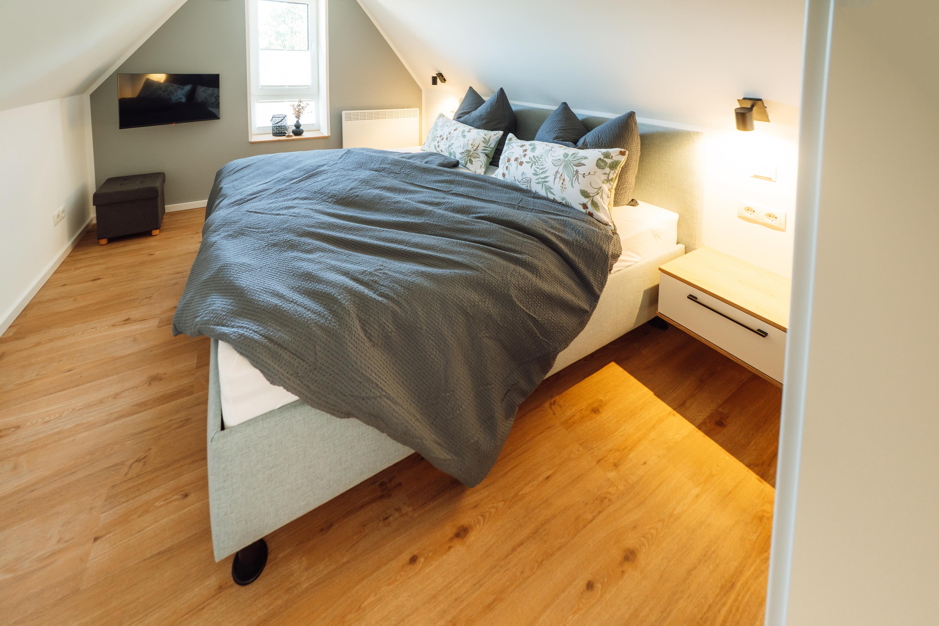 Zwei Schlafzimmer – eines davon mit eigenem Ankleidebereich – bieten Rückzugsorte zum Träumen. Im Badezimmer erwartet dich eine bodengleiche, besonders großzügige Dusche – ideal für einen erfrischenden Start in den Morgen oder zum entspannten "Regenduschen" nach einem Tag am Meer.