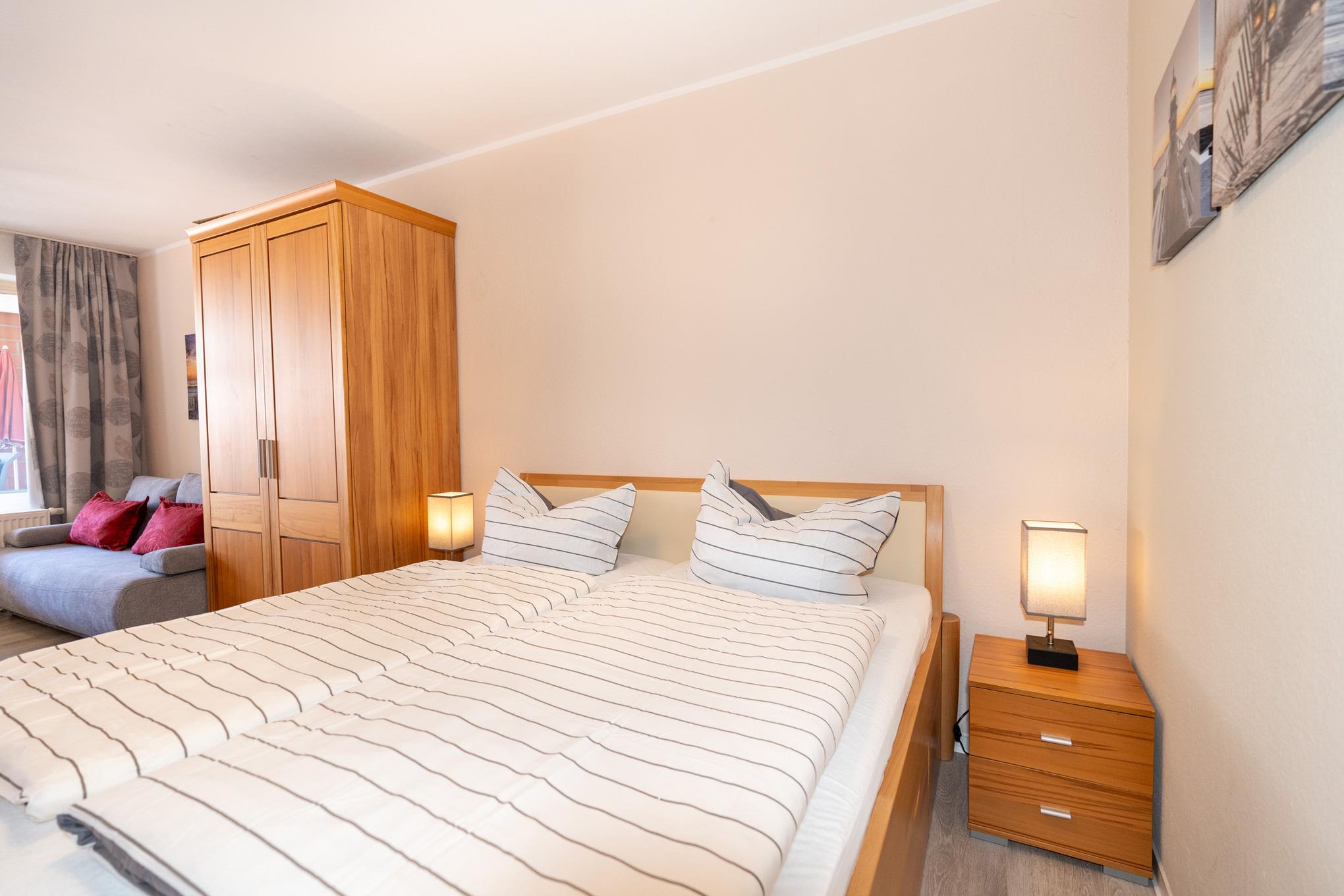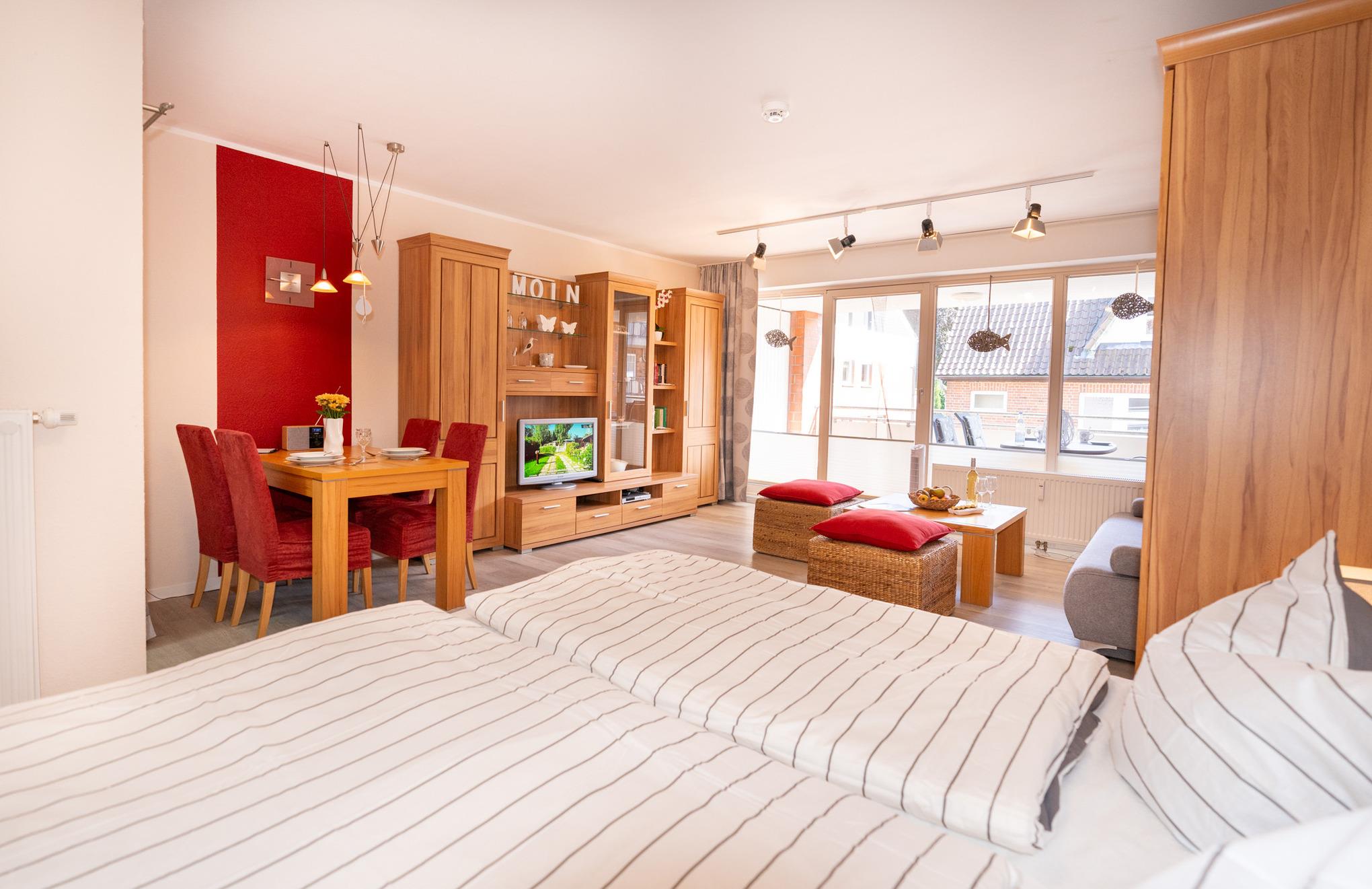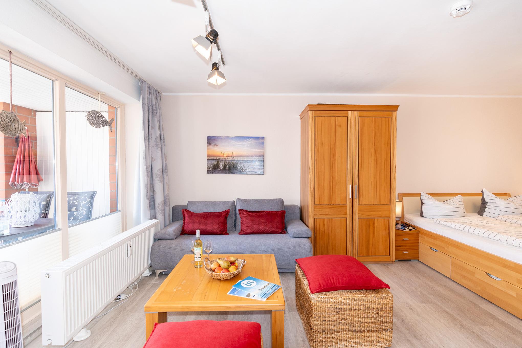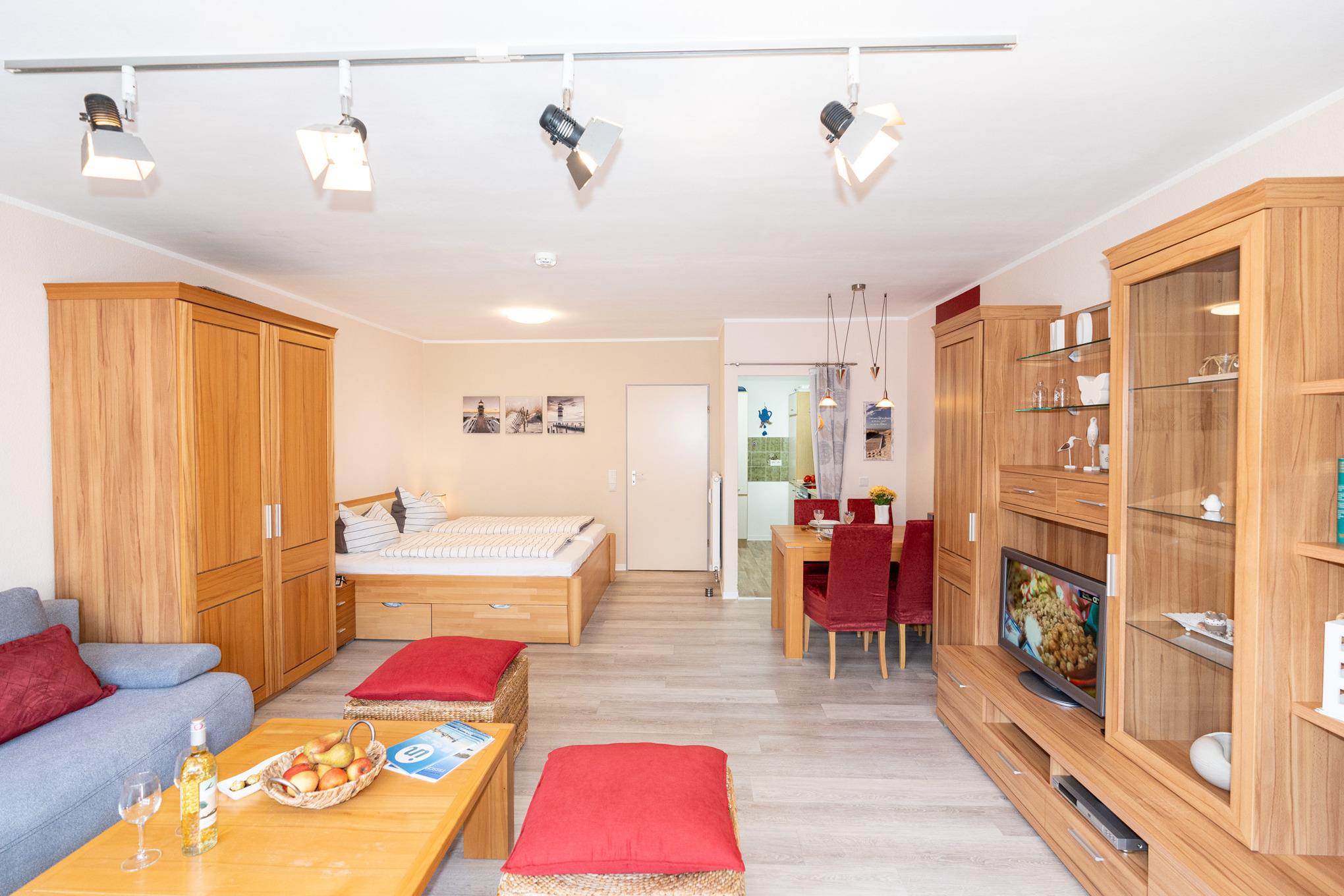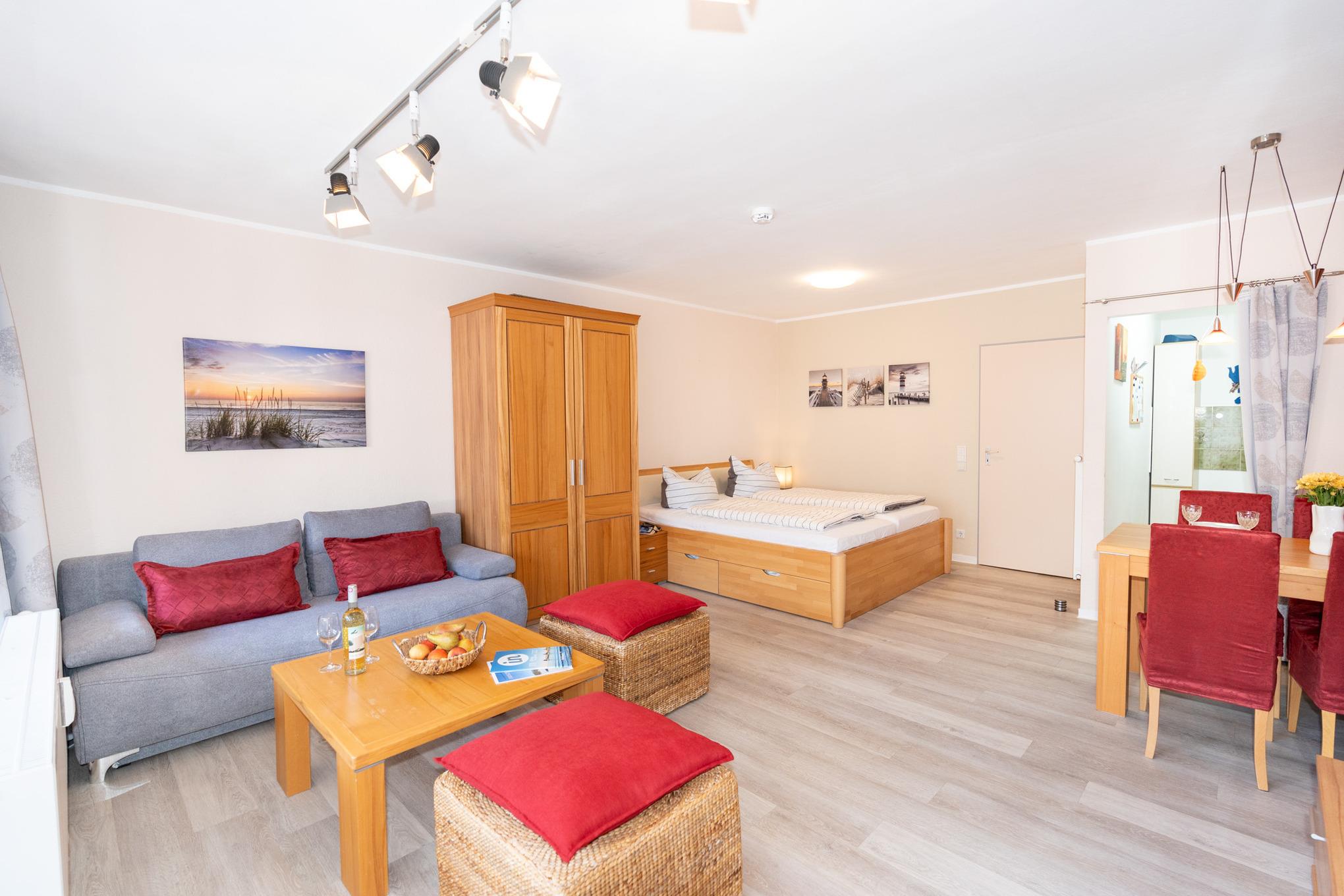 Komfortabel & Kompakt: Ihr Apartment bietet Ihnen alles, was Sie für einen erholsamen Urlaub brauchen: ein gemütliches Zimmer, eine separate, voll ausgestattete Einbauküche (mit allem, was Sie zum Kochen benötigen!), eine Diele und ein eigenes Bad.