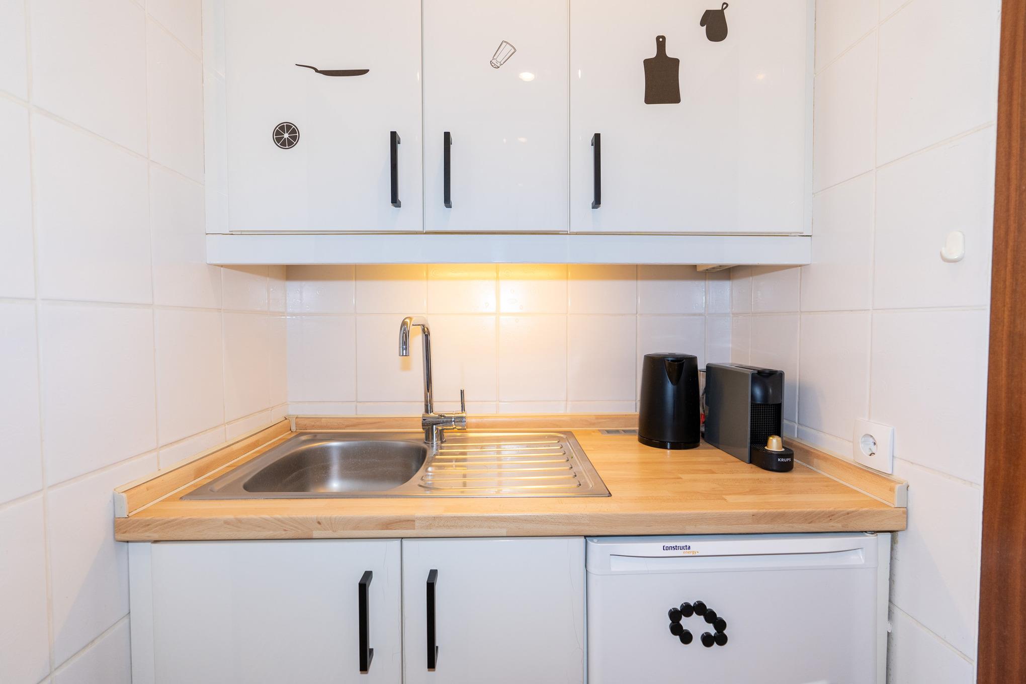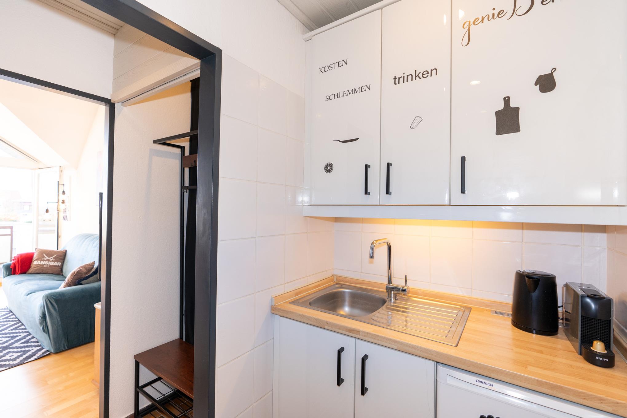 Direkt im Eingangsbereich der Wohnung befindet sich beidseitig die Küchenzeile. Kleinere Mahlzeiten lassen sich in dieser voll ausgestatteten Küche gut zubereiten. Diverse Elektro-Kleingeräte wie Kaffee- und Kapselmaschine, Mikrowelle usw. ergänzen das Angebot.
