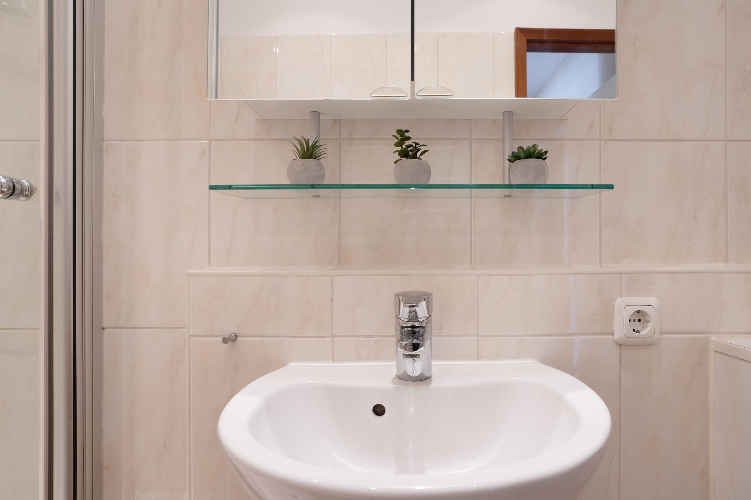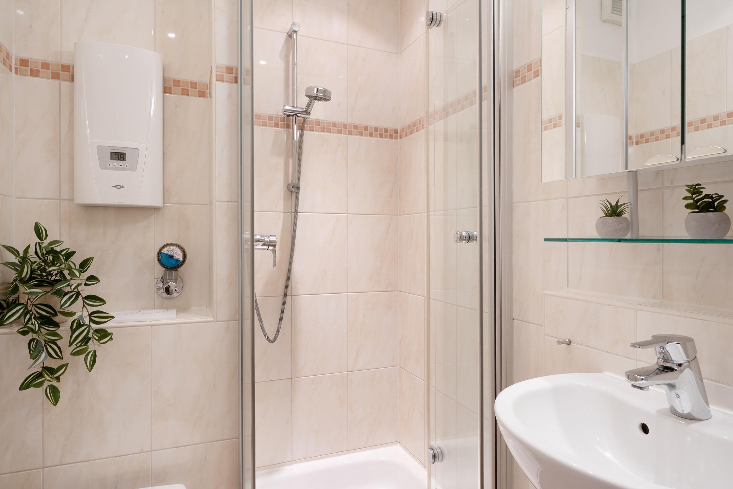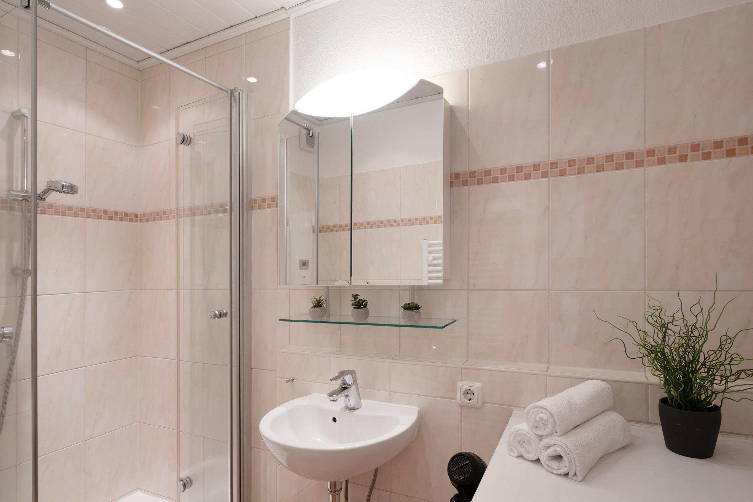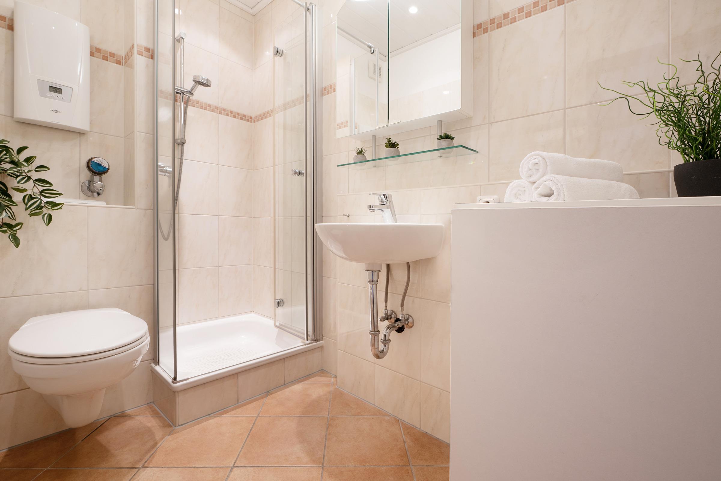 Das Bad ist in warmen Farben gefliest und mit Dusche, WC, Waschtisch und Spiegel, sowie einem beheizbaren Handtuchhalter hochwertig ausgestattet.