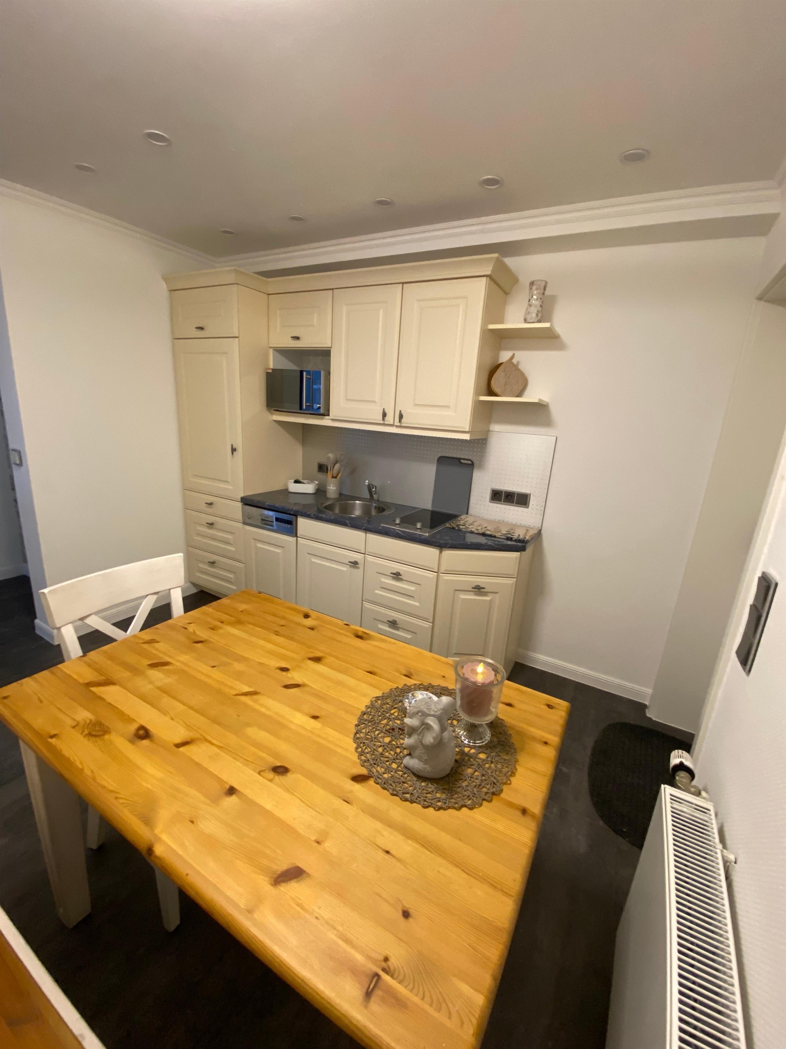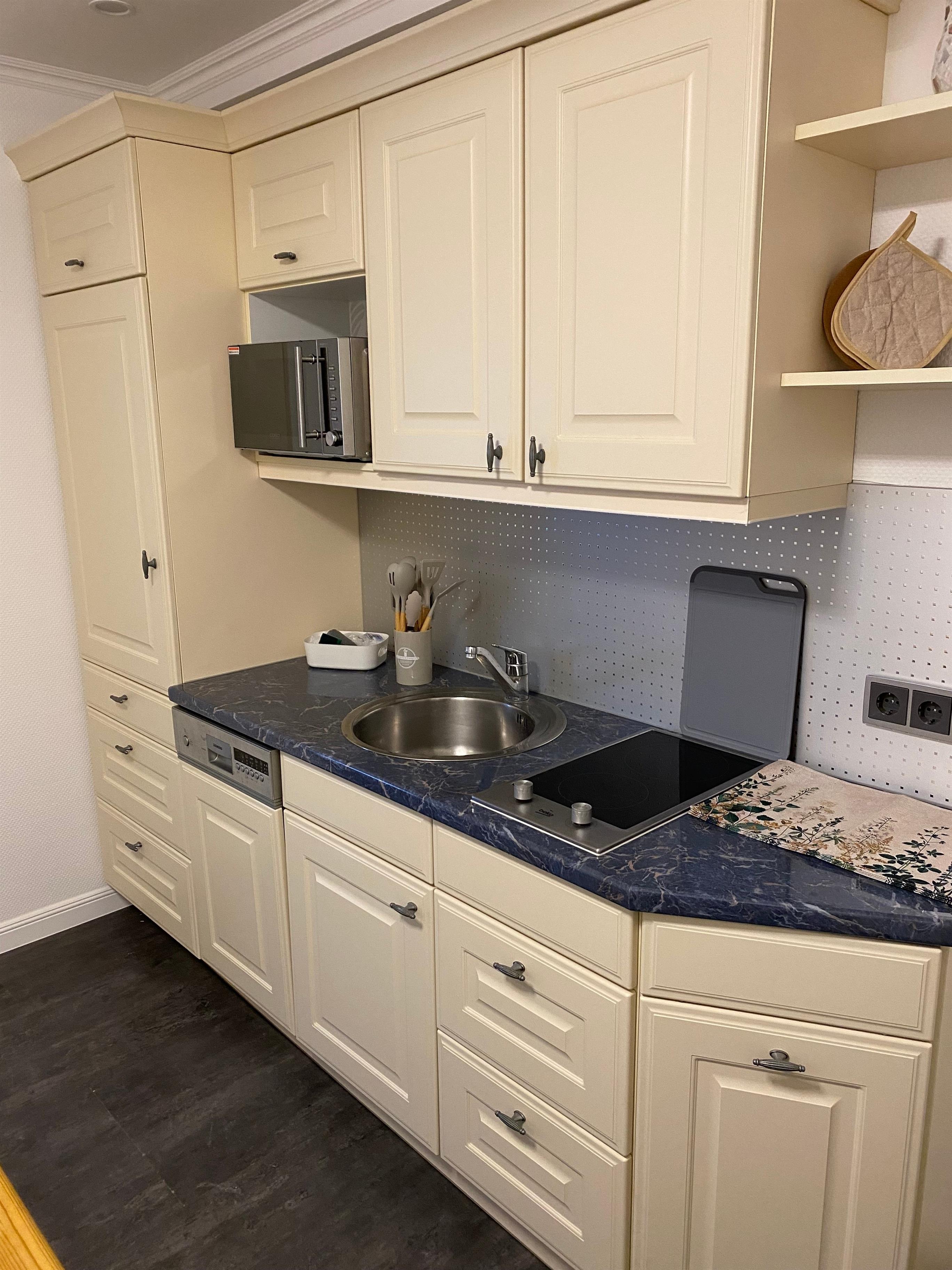 Voll ausgestattete Küchenzeile mit 2 Kochfeldern, Mikrowelle, Spülmaschine, Kaffeemaschine, Toaster und Wasserkocher