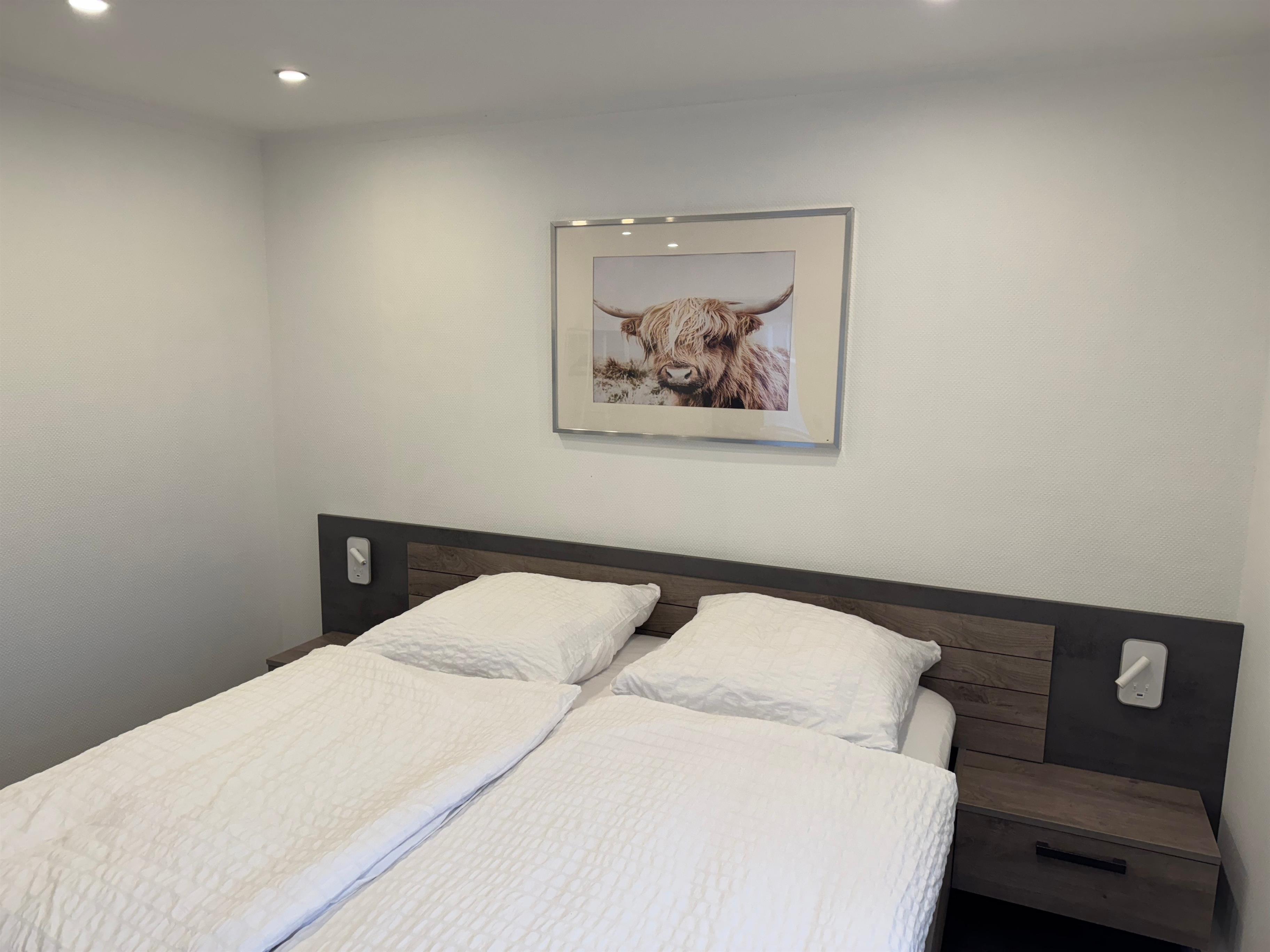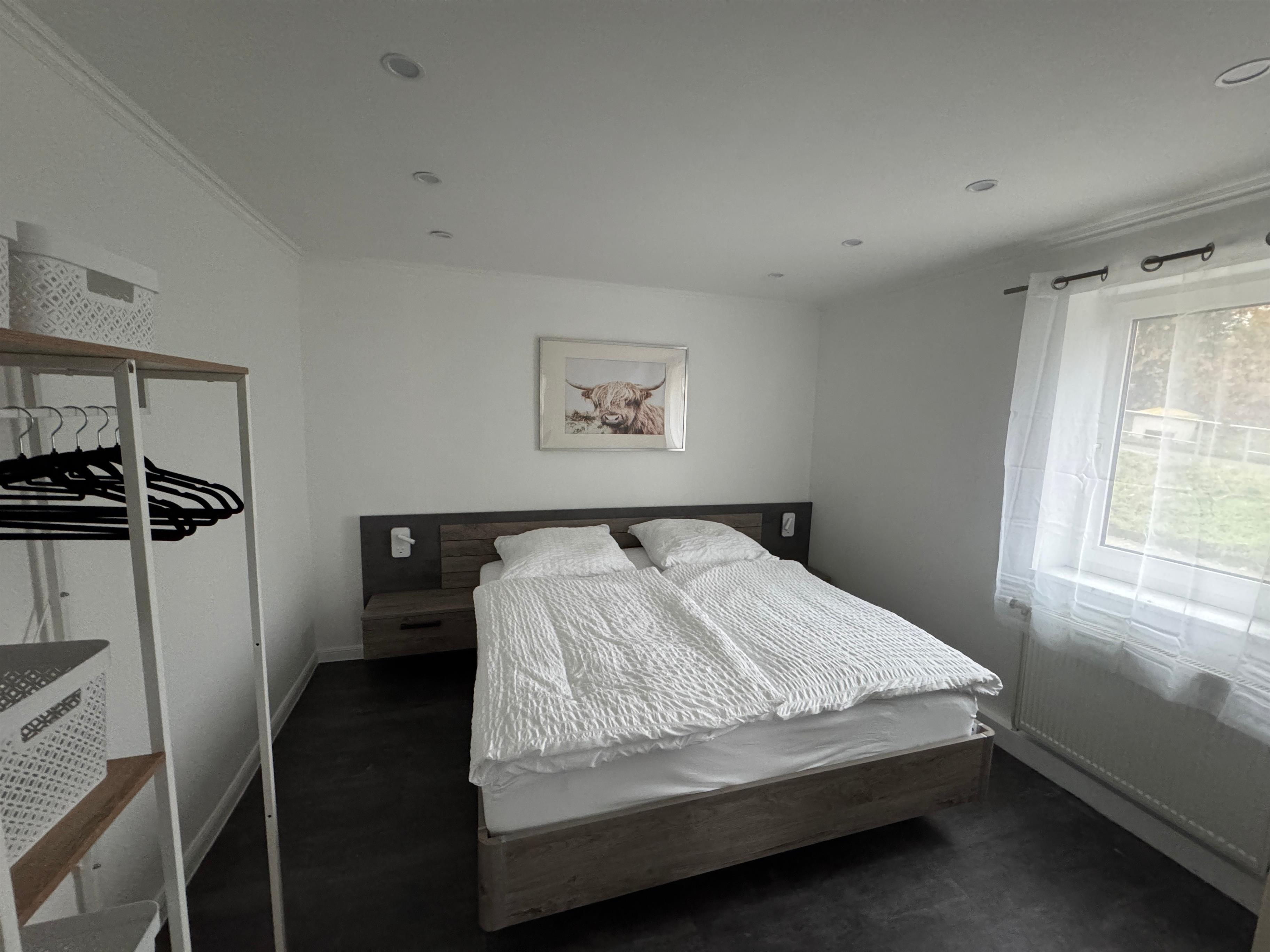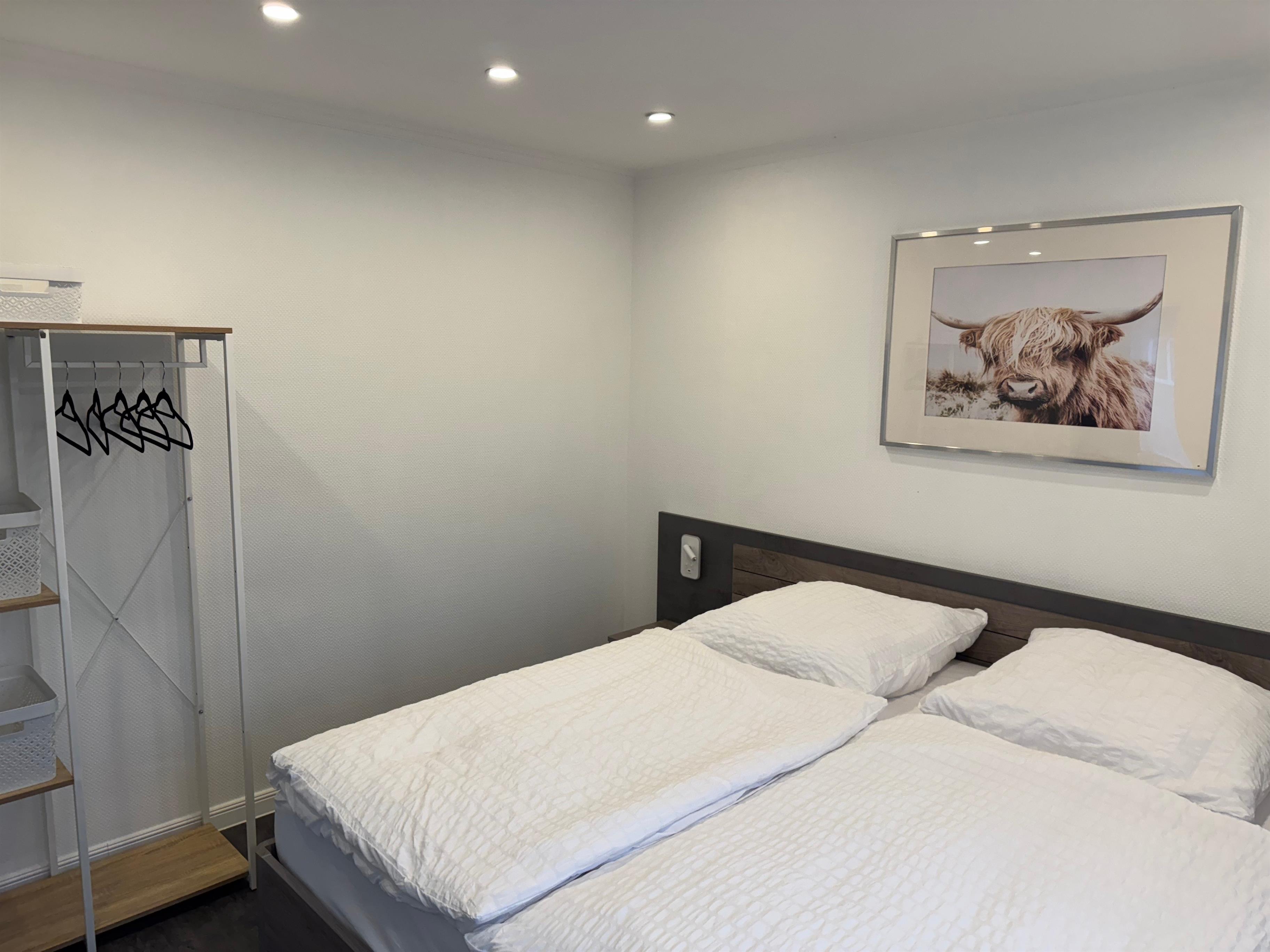 Schlafzimmer mit gemütlichem Doppelbett (180 × 200 cm) und offenem Kleiderschrank