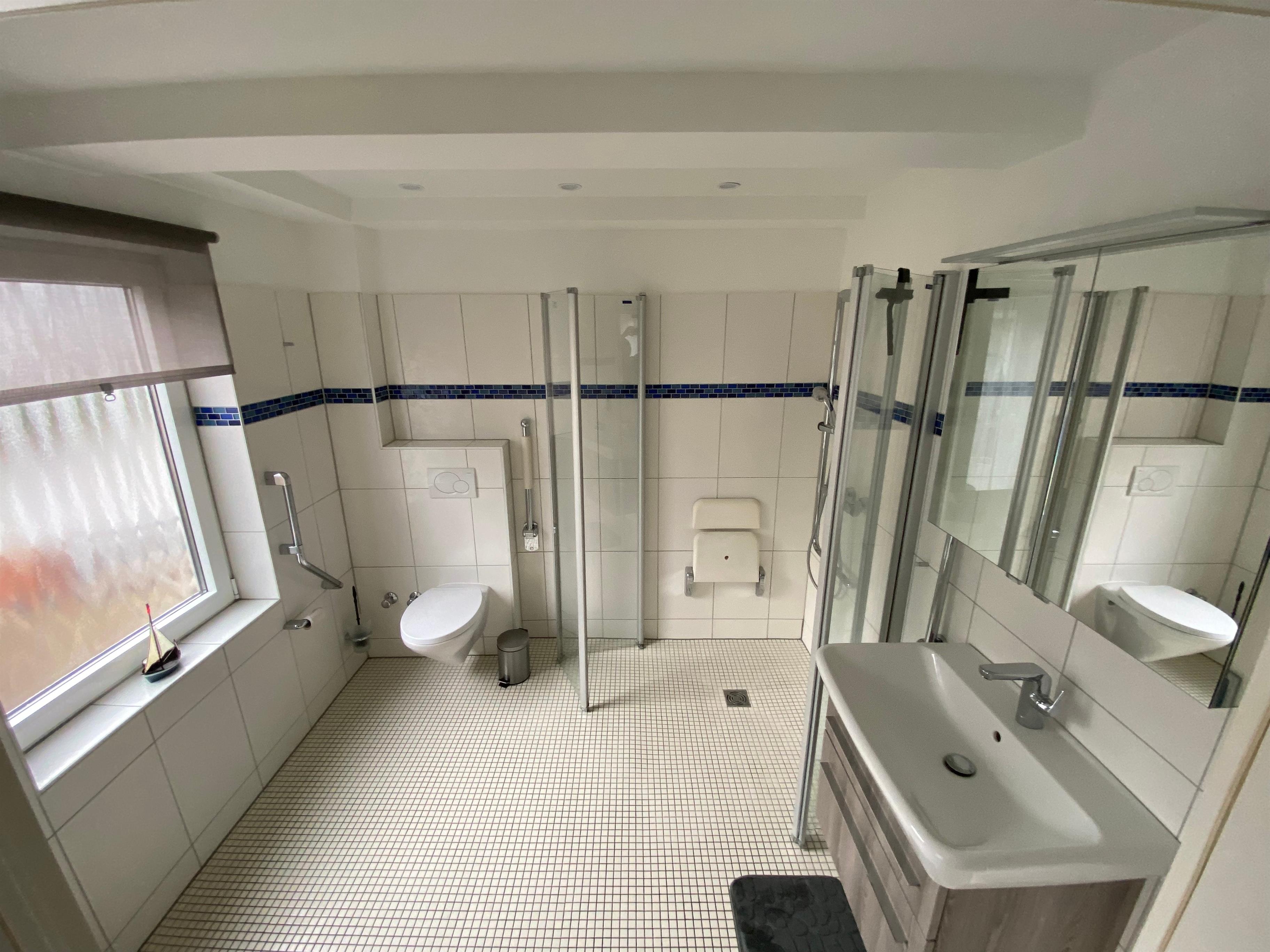 Modernes Bad mit Spiegelschrank, ebenerdige Dusche und Föhn