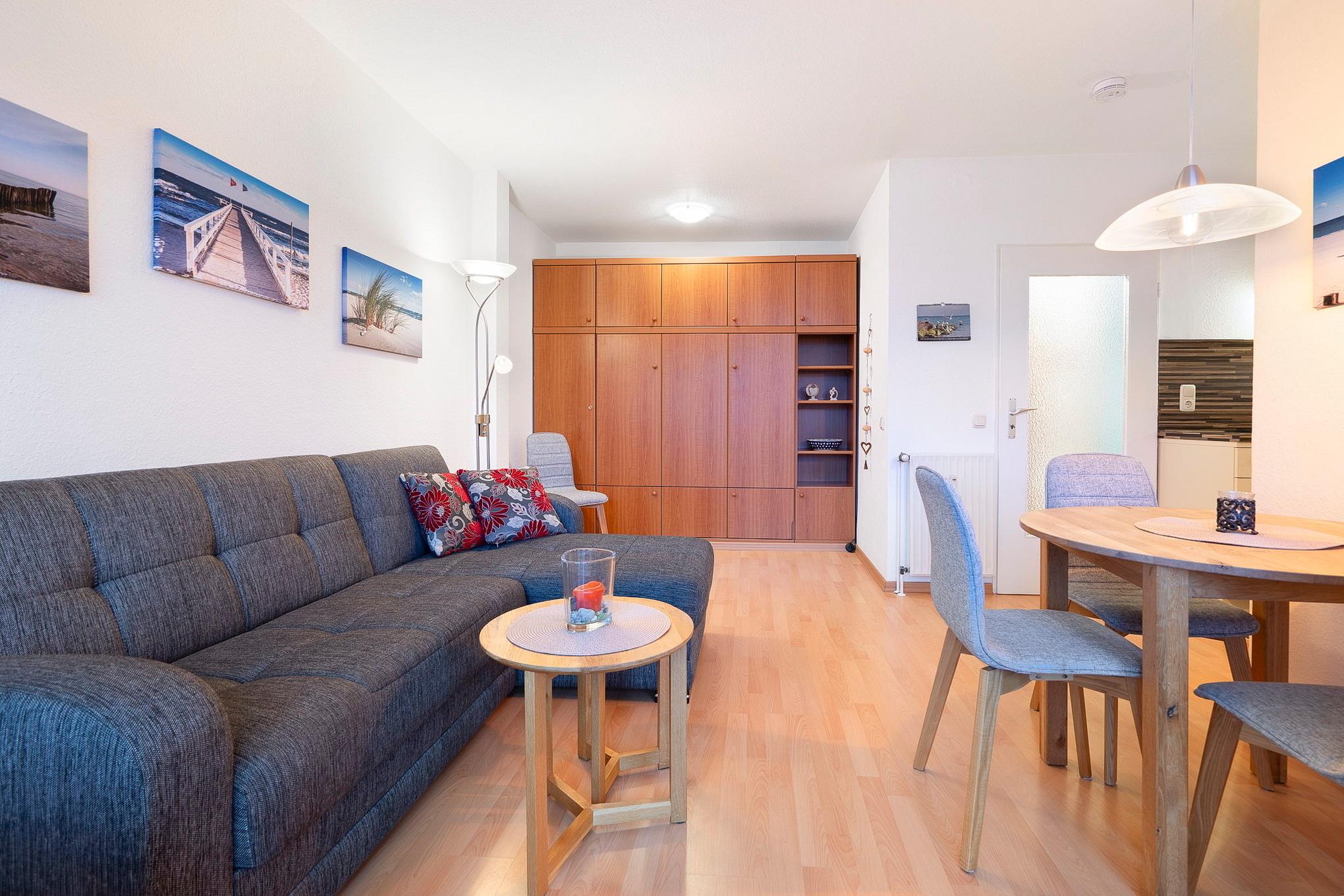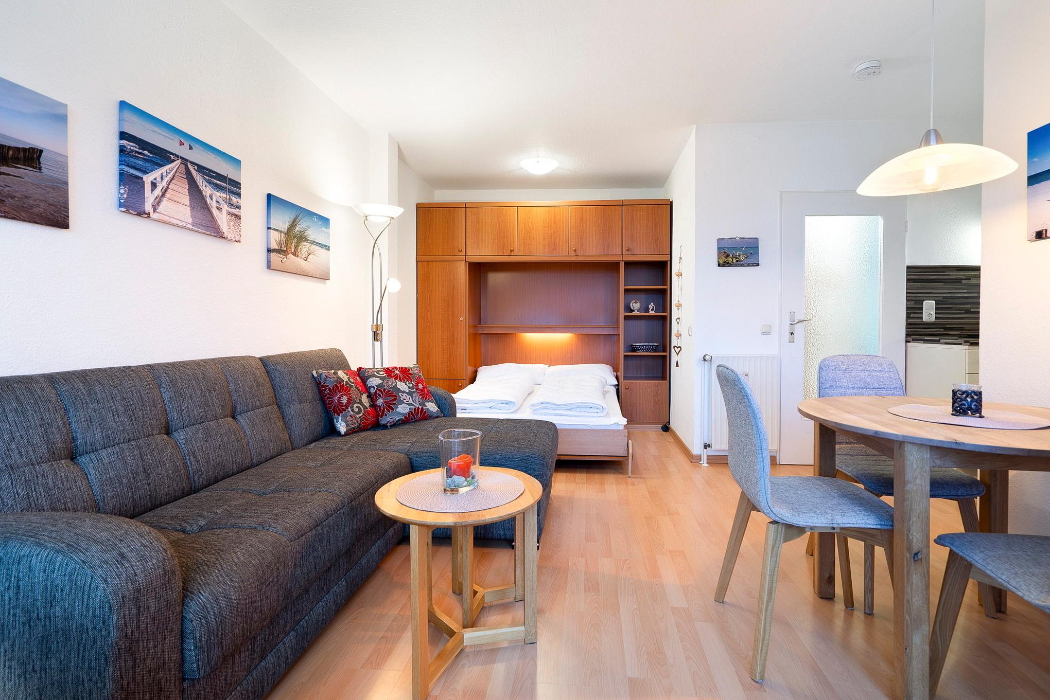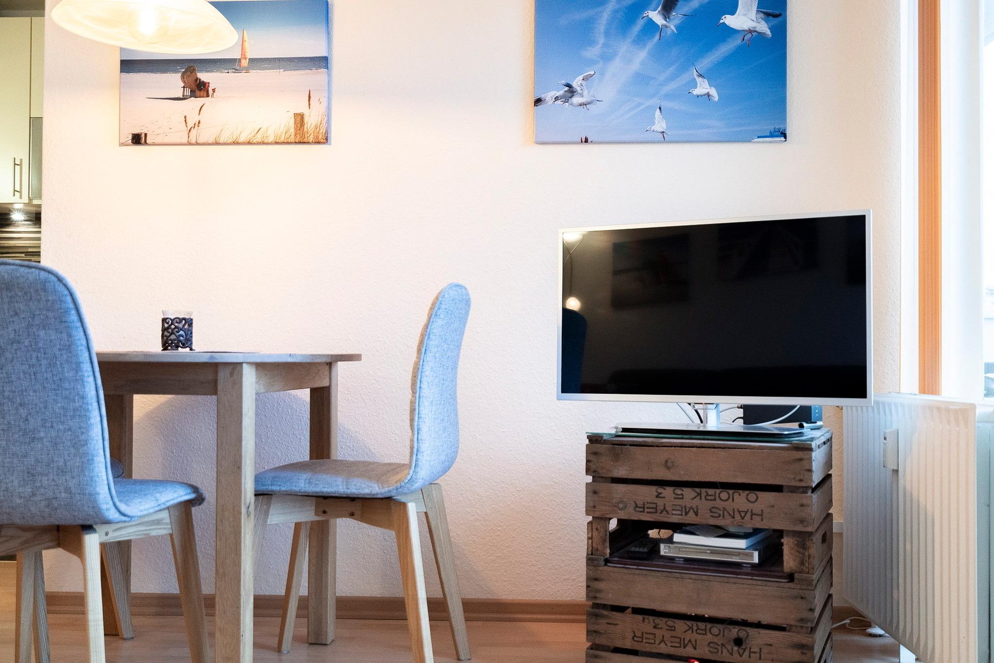 Gepflegtes, freundliches Wohn- und Esszimmer. Das Wohn-und Esszimmer ist mit einem Essplatz für 4 Personen, einem Couchtisch und einem Schrankbett ausgestattet. Zur Unterhaltung steht ein Flachbildfernseher zur Verfügung. Vom Wohn-und Esszimmer direkter Zugang zum Balkon. Das Wohn-und Esszimmer ist mit Laminatboden ausgestattet, die Fenster lassen sich durch die Lamellen blickdicht verdunkeln. Ein Kleiderschrank befindet sich neben dem Schrankbett.
