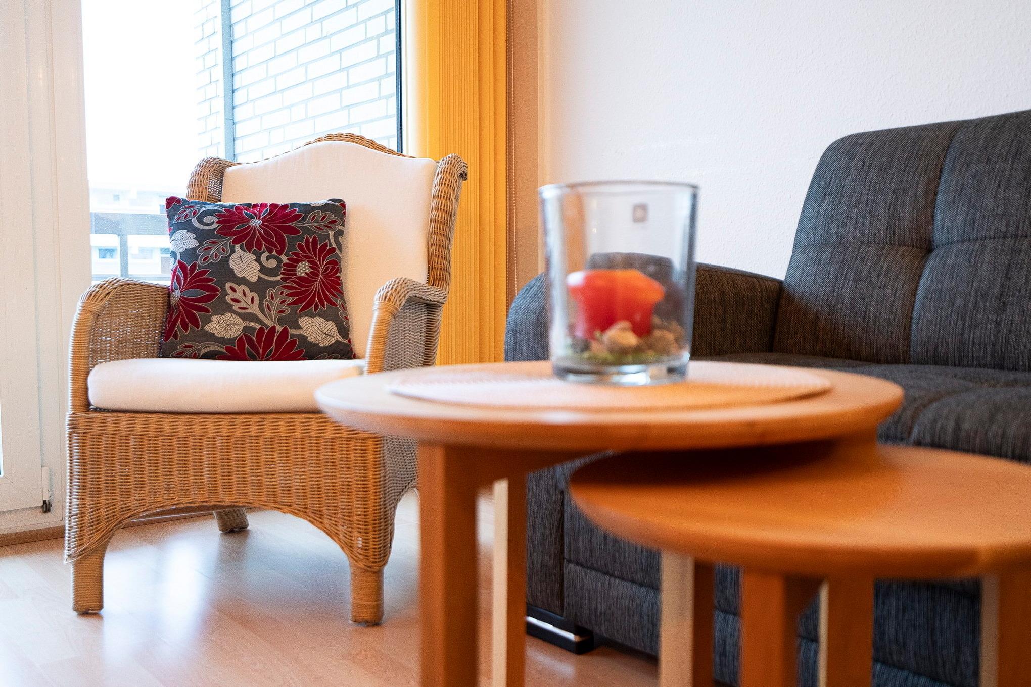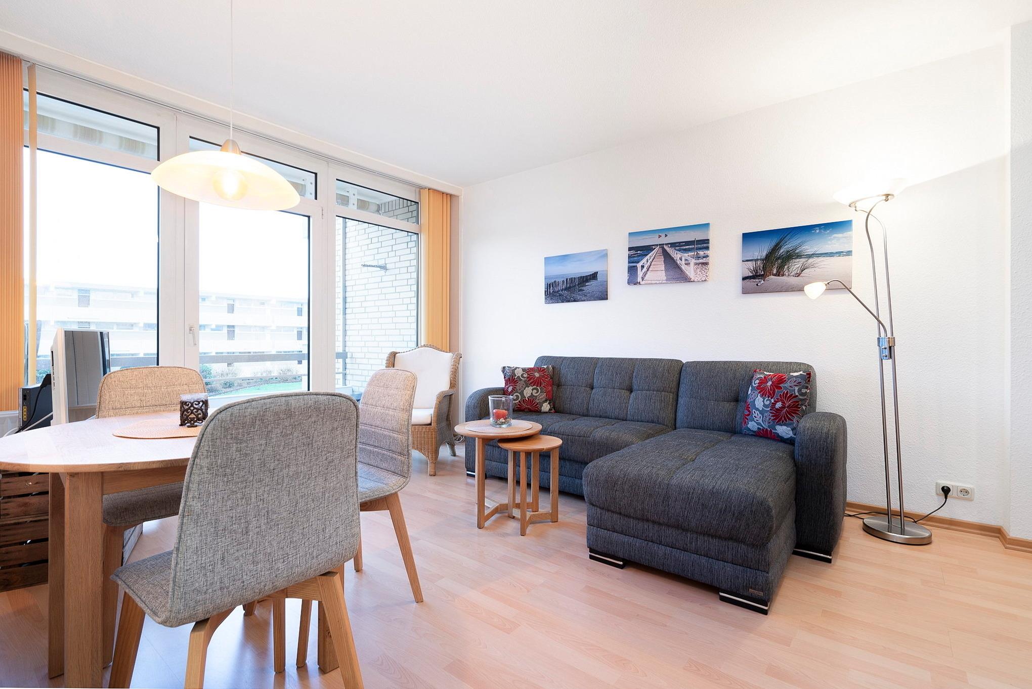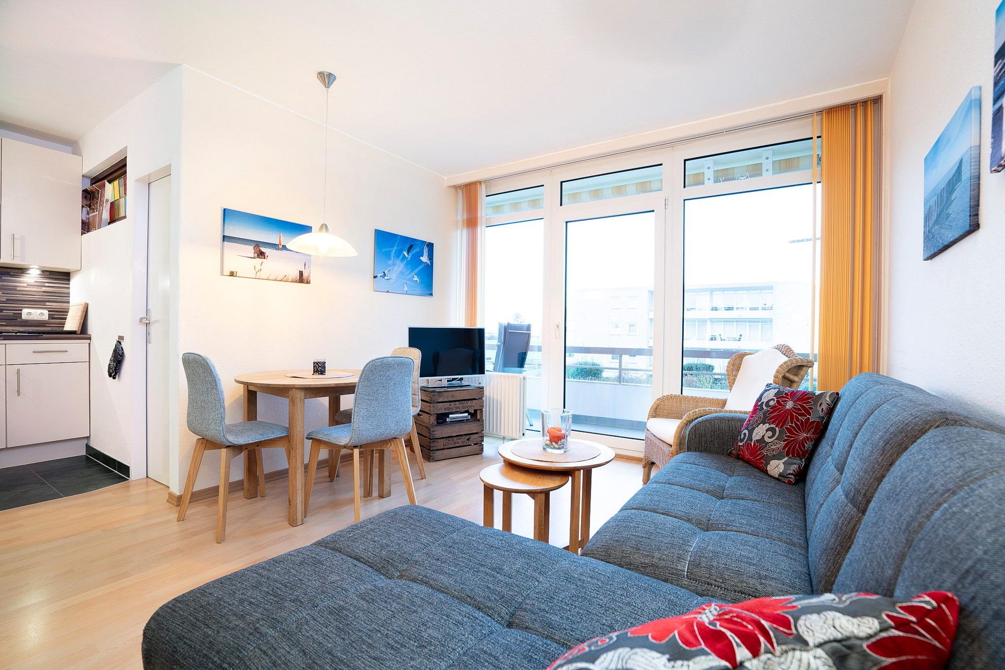 Gepflegtes, freundliches Wohn- und Esszimmer. Das Wohn-und Esszimmer ist mit einem Essplatz für 4 Personen, einem Couchtisch und einem Schrankbett ausgestattet. Zur Unterhaltung steht ein Flachbildfernseher zur Verfügung. Vom Wohn-und Esszimmer direkter Zugang zum Balkon. Das Wohn-und Esszimmer ist mit Laminatboden ausgestattet, die Fenster lassen sich durch die Lamellen blickdicht verdunkeln. Ein Kleiderschrank befindet sich neben dem Schrankbett.