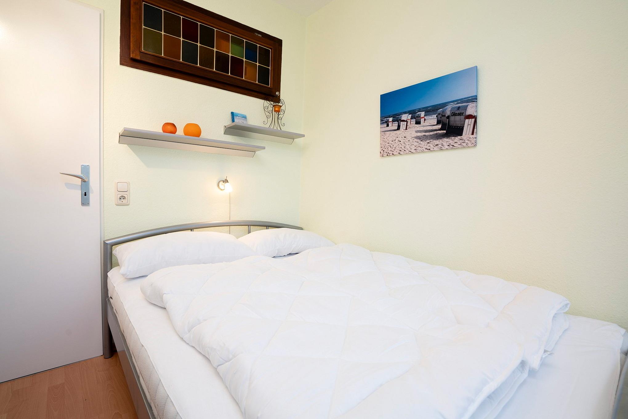 Kleines Schlafzimmer mit Doppelbett (nur von einer Seite ein Einstieg) und Laminatboden. Zur Unterhaltung steht Ihnen ein Radio zur Verfügung. Die Fenster lassen sich blickdicht mit Lamellen verdunkeln.
